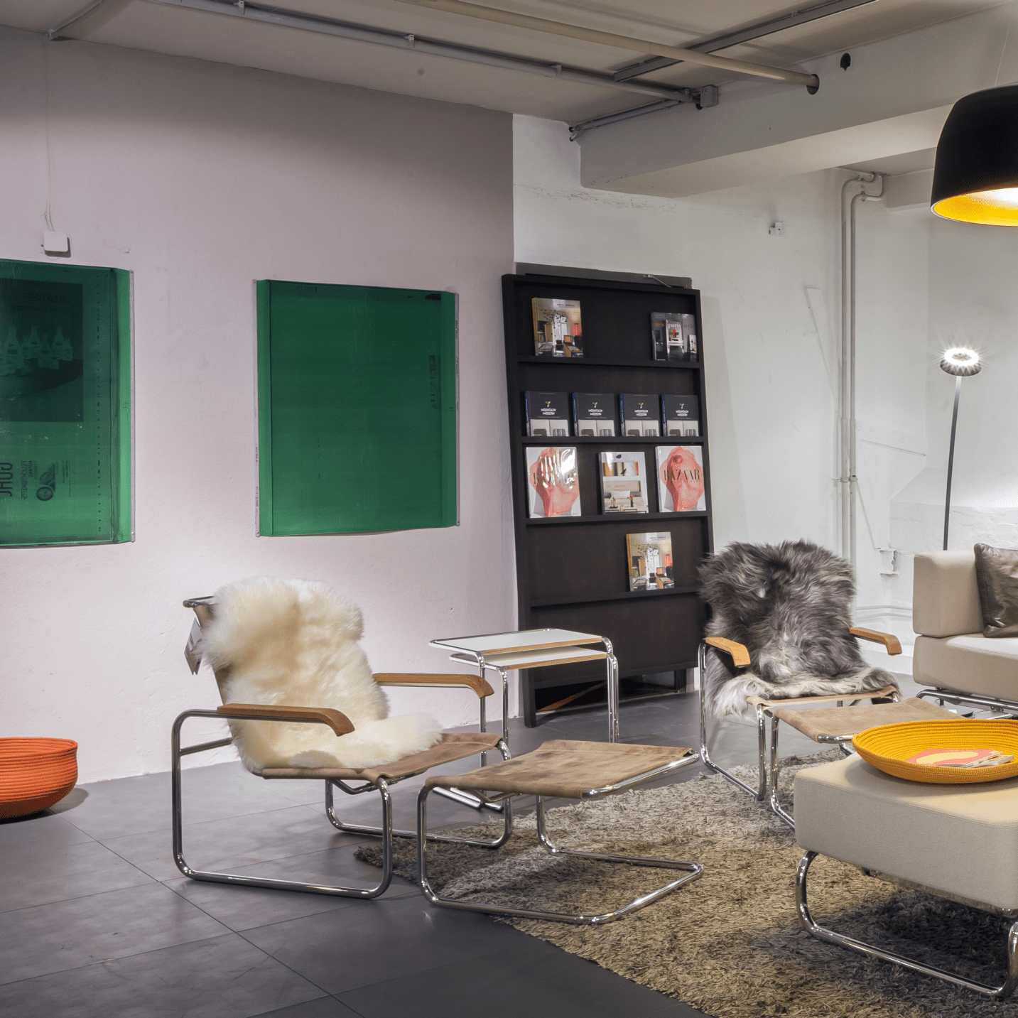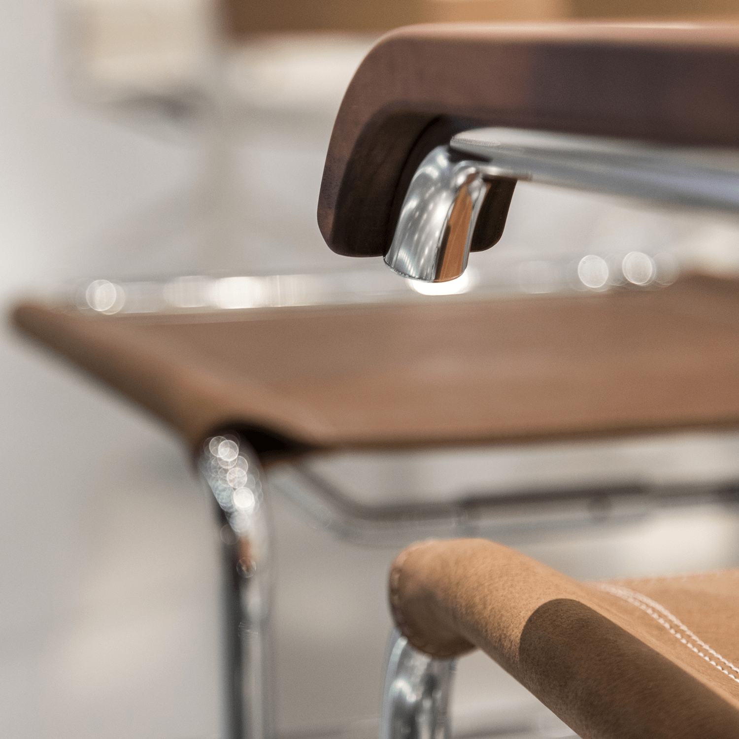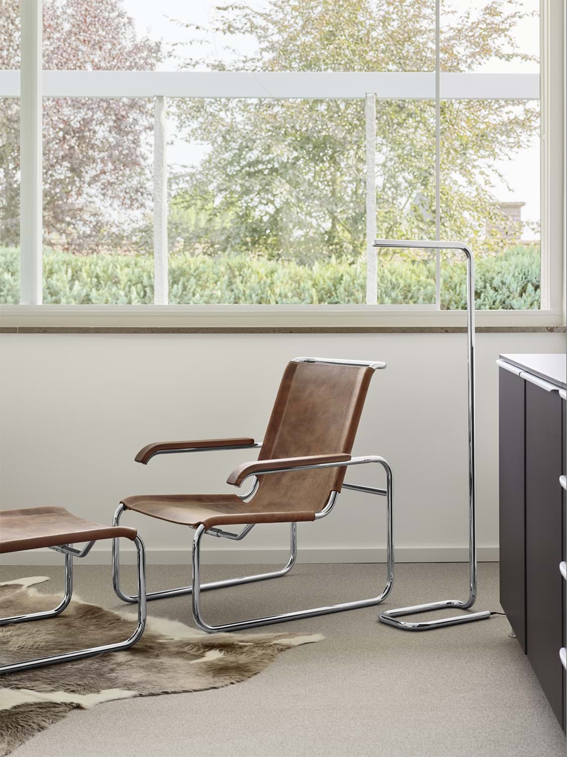 Among all the cantilever chairs of the Bauhaus epoch, the armchair S 35, with its lightness, flexibility and comfort, casts a shadow over everything heavy and inert. In 1930, the modern lifestyle communicated by the S 35 appeared visionary; today, it is part of our mobile and individual lifestyle. With S 35, Marcel Breuer succeeded in combining all of the functions of a cantilever tubular steel armchair in a single line that also includes the armrests. Breuer achieved a double cantilever effect with his design: seat and armrests flex independently from each other. The flexing movement of the seat and backrest frame cantilevered towards the back is balanced by the flexing armrests. A matching footstool is available for extra comfort – also designed as a cantilever piece of furniture. The comfortable club chair S 35 was first presented in 1930 in the famous Deutscher Werkbund exhibition at the “Salon des Artistes Décorateurs” in Paris as part of the furnishing of a prototypical high-rise apartment which Breuer realised together with Walter Gropius and Herbert Bayer.