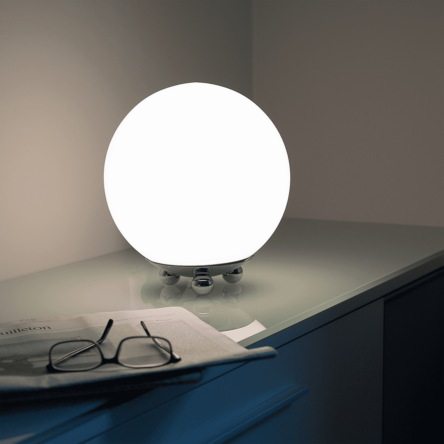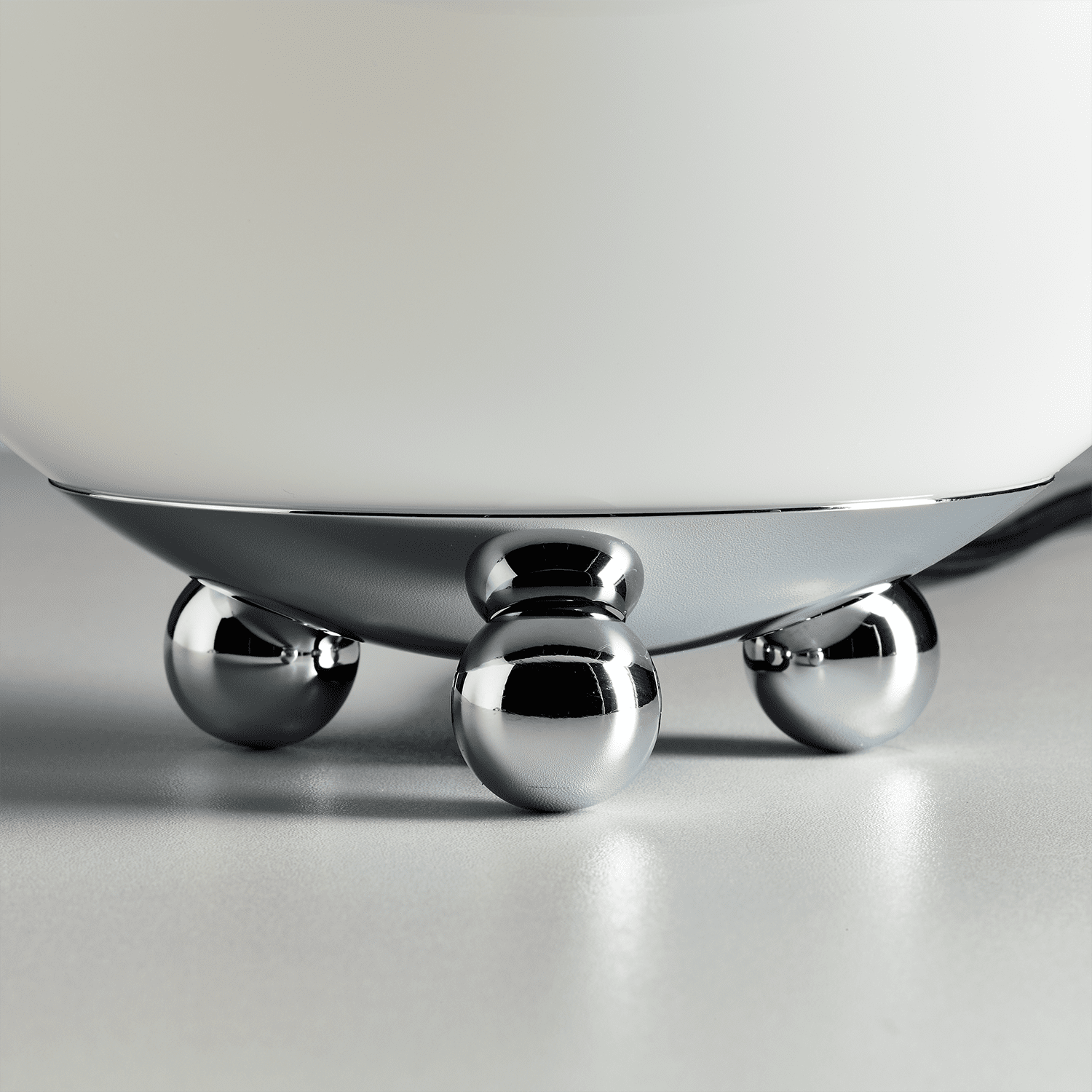 The Art Déco AD 32 Table Lamp is designed by France about 1930 and made by Tecnolumen. The spherical table lamp Art Deco AD 32 is a noble eye-catcher on sideboard or counter. Opaque glass diffuser, either all metal parts chromed or with polished brass feet.This lamp, created around 1930, comes from the flea market in Paris; its designer is unknown. The opaque glass globe rests on a chrome-plated concave holder, supported by three brass or chrome spheres. The spheres serve as the base, and also hold the globe in pace by means of screws. The alternating surfaces of chrome, brass and glass give an attractive effect against the rounded motif of the individual parts. All lamps are numbered consecutively and bear the Tecnolumen logo.