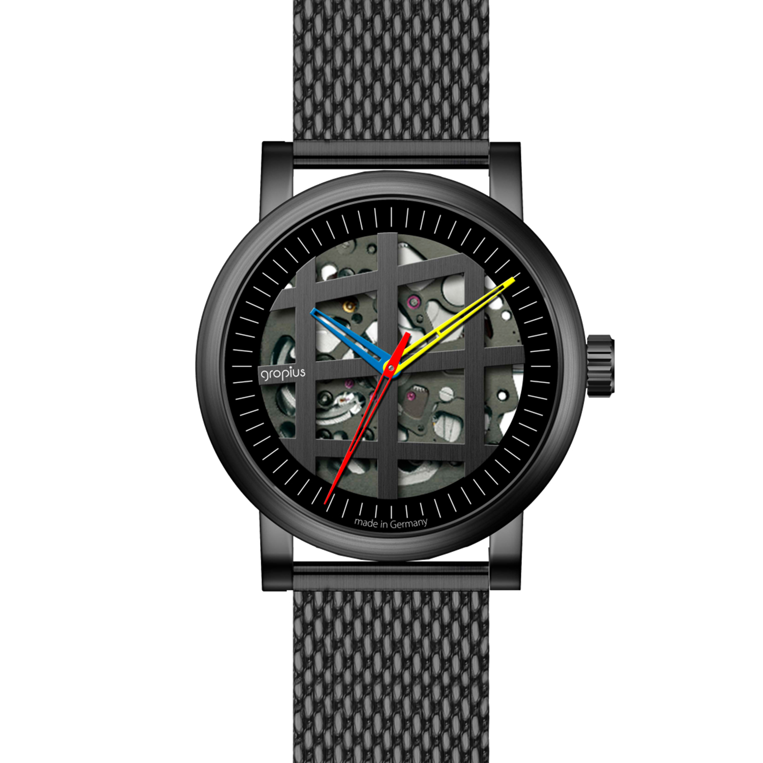 Walter Gropius' first automatic watch received the Good Design Award, the oldest design prize in the world, before its official launch. The watch with the name "Atrium" provides insights into the Bauhaus architecture in two ways. Through the transparent back of the watch, you can look directly into the heart of the watch, the automatic movement, through a metal construction. This construction is based on the window bars of the Bauhaus in Dessau and emphasizes the light-flooded glass and steel architecture of Walter Gropius.