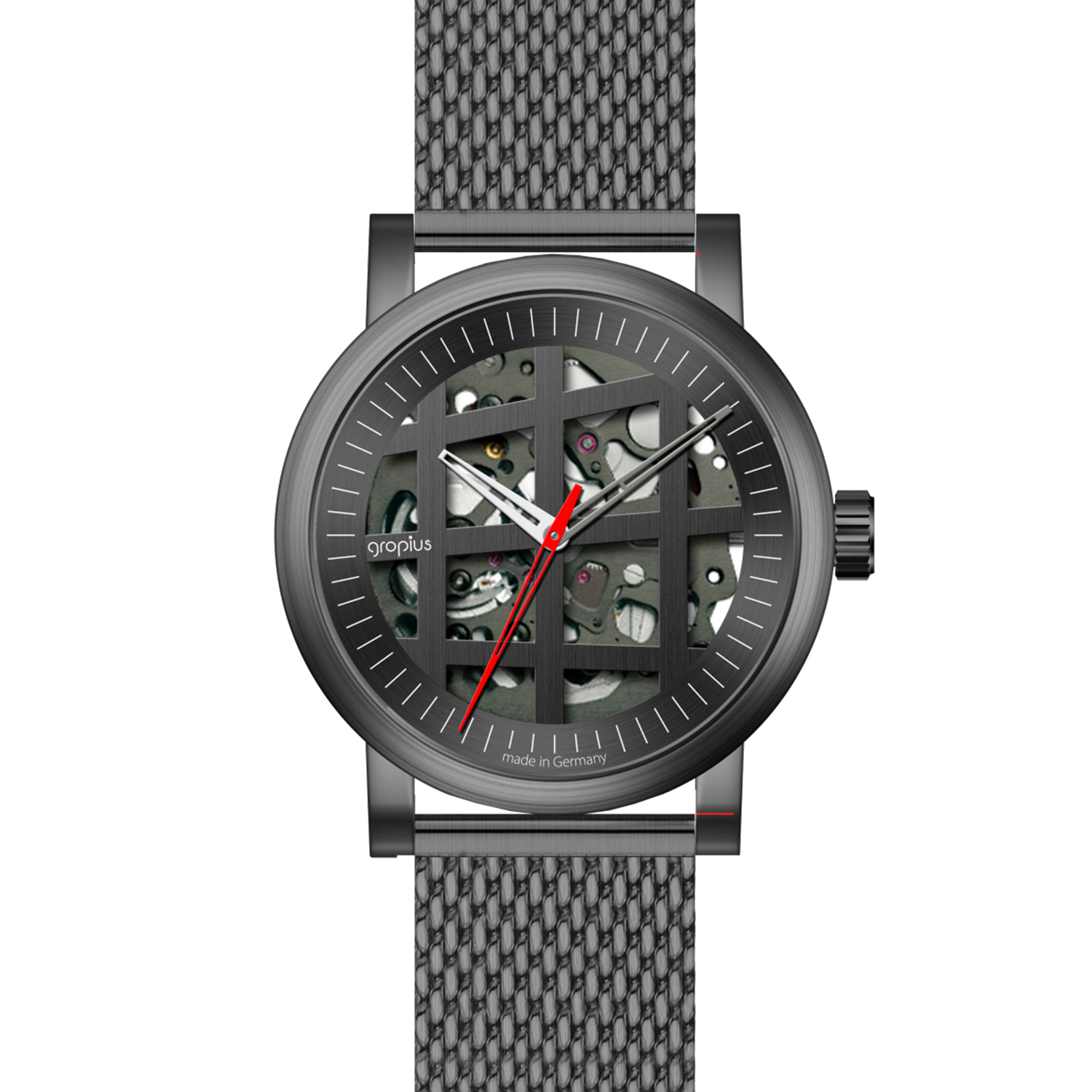 Walter Gropius' first automatic watch received the Good Design Award, the oldest design prize in the world, before its official launch. The watch with the name "Atrium" provides insights into the Bauhaus architecture in two ways. Through the transparent back of the watch, you can look directly into the heart of the watch, the automatic movement, through a metal construction. This construction is based on the window bars of the Bauhaus in Dessau and emphasizes the light-flooded glass and steel architecture of Walter Gropius.