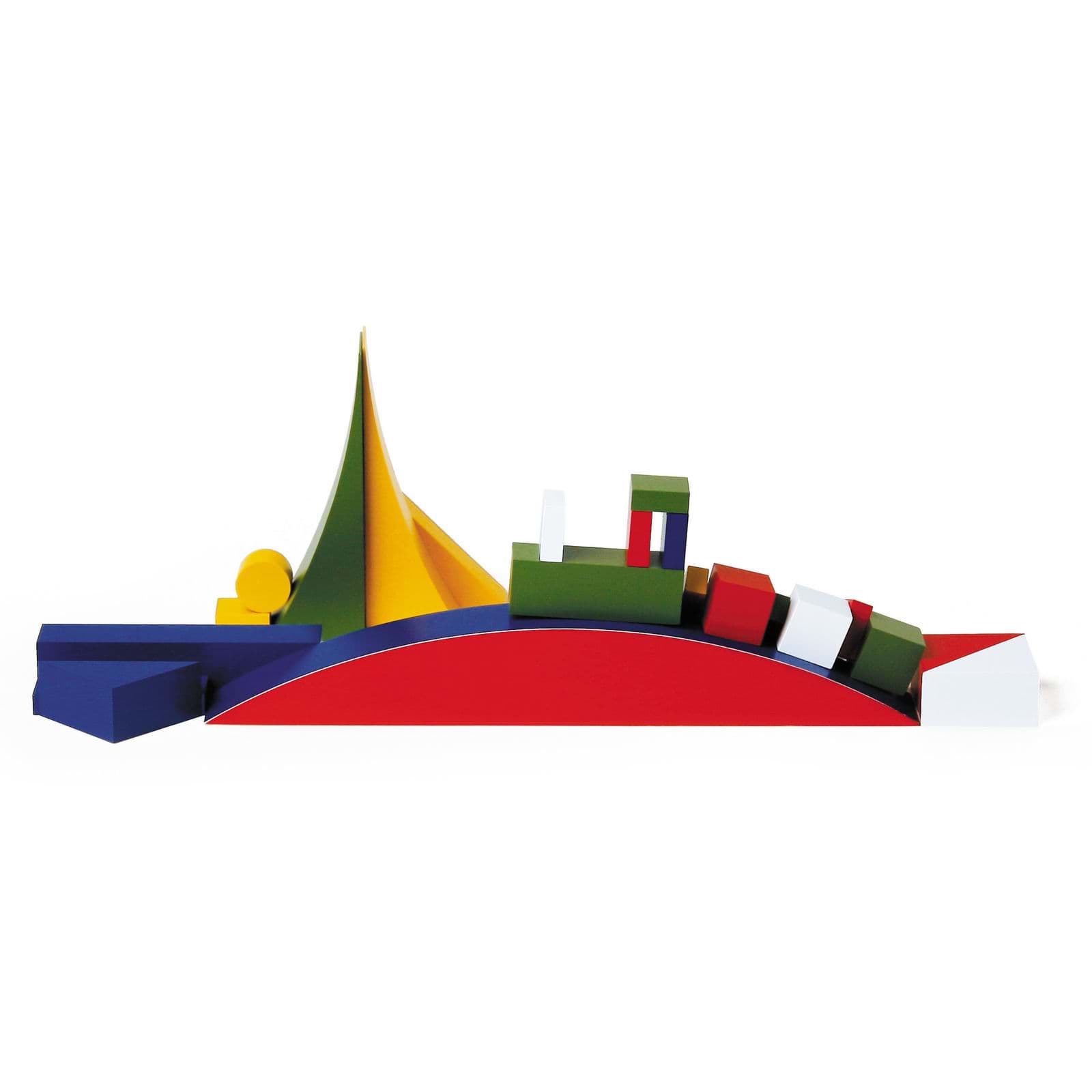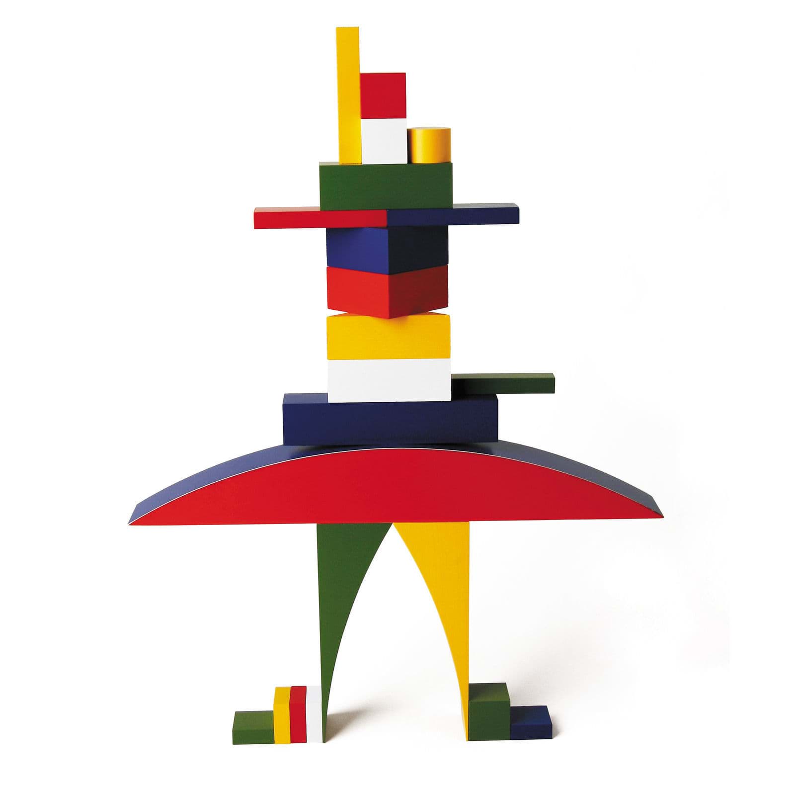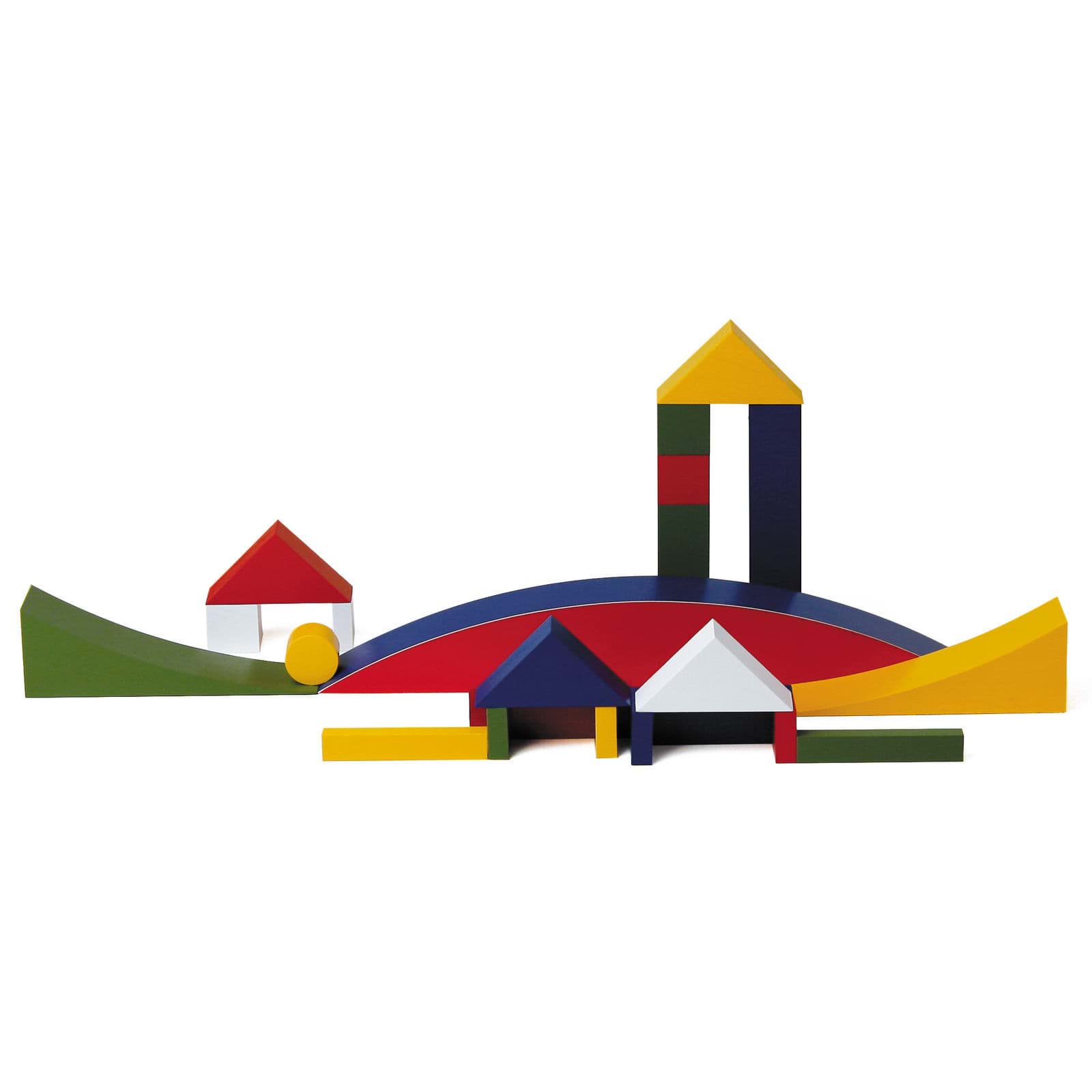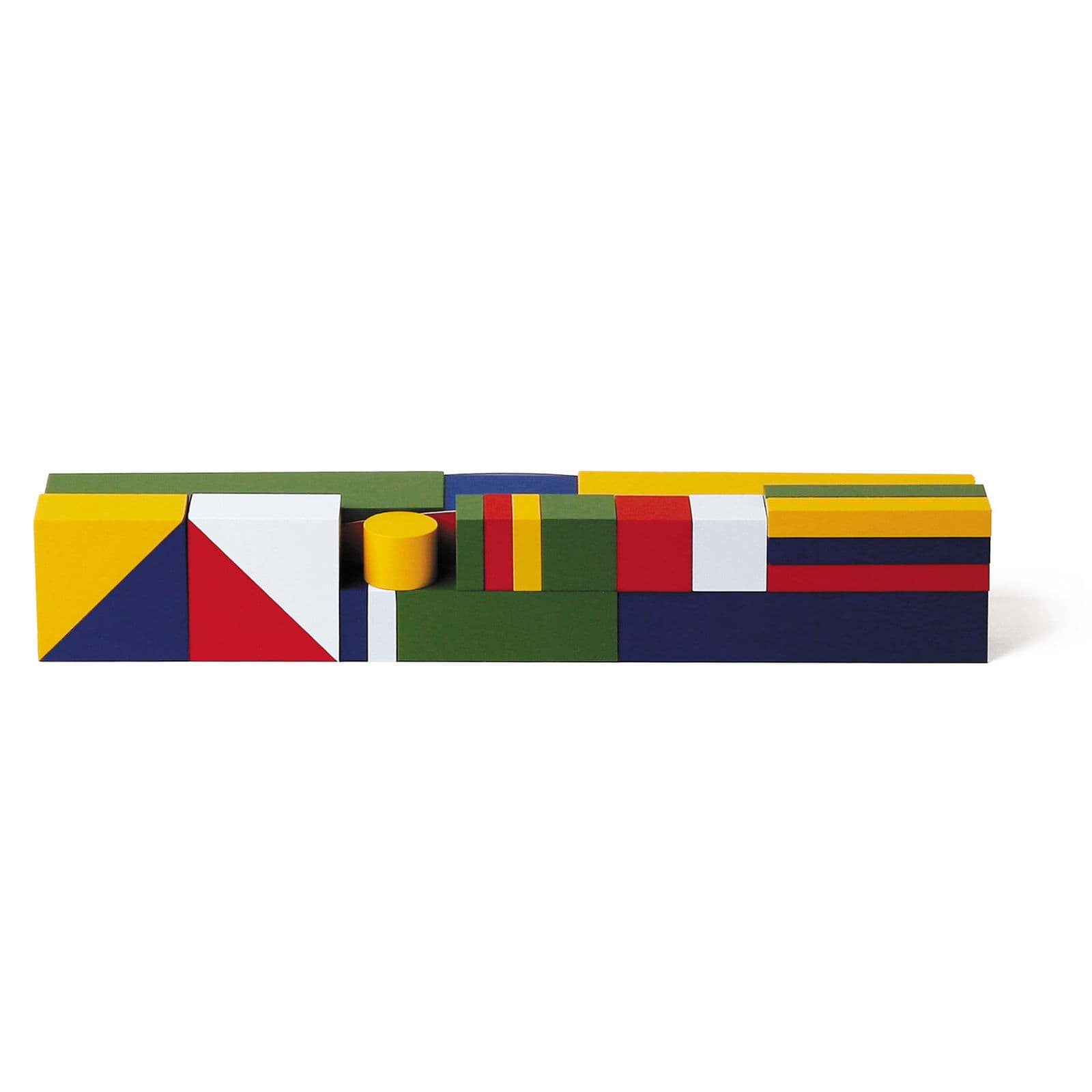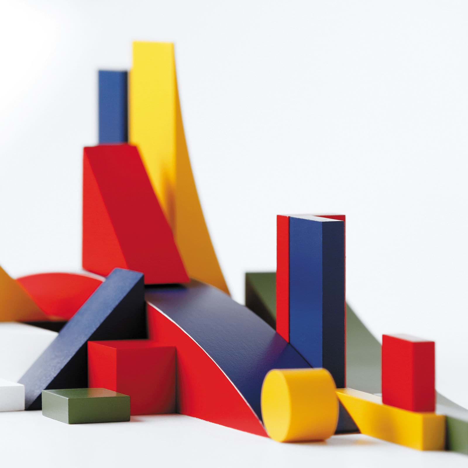 company Naef. The 22 geometric wooden parts are designed in the clear colours and shapes of the Bauhaus. The principle of "less is more"