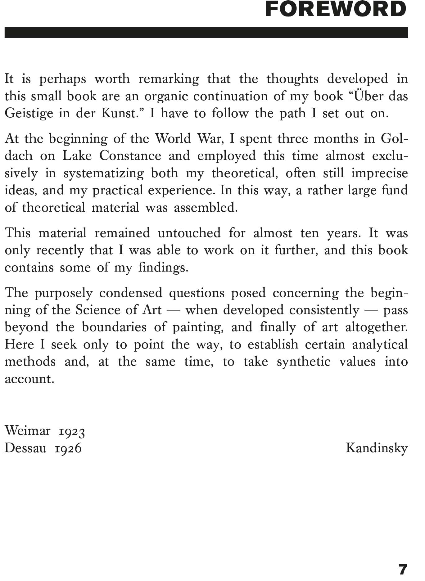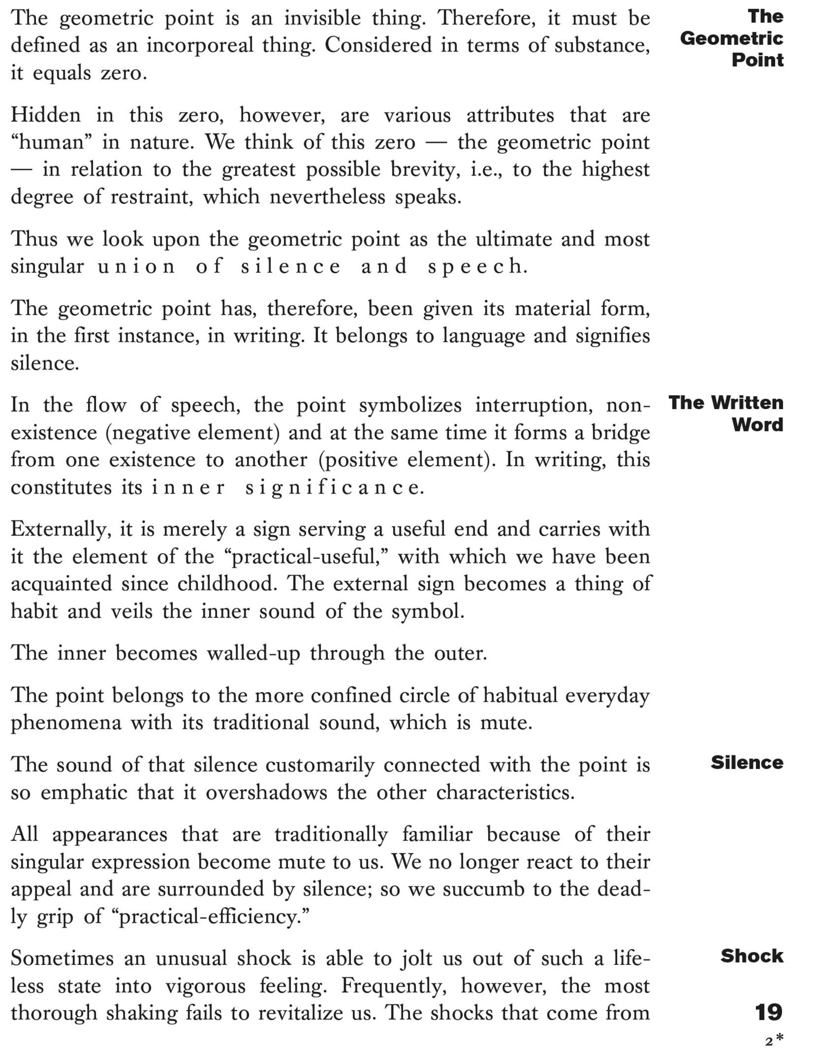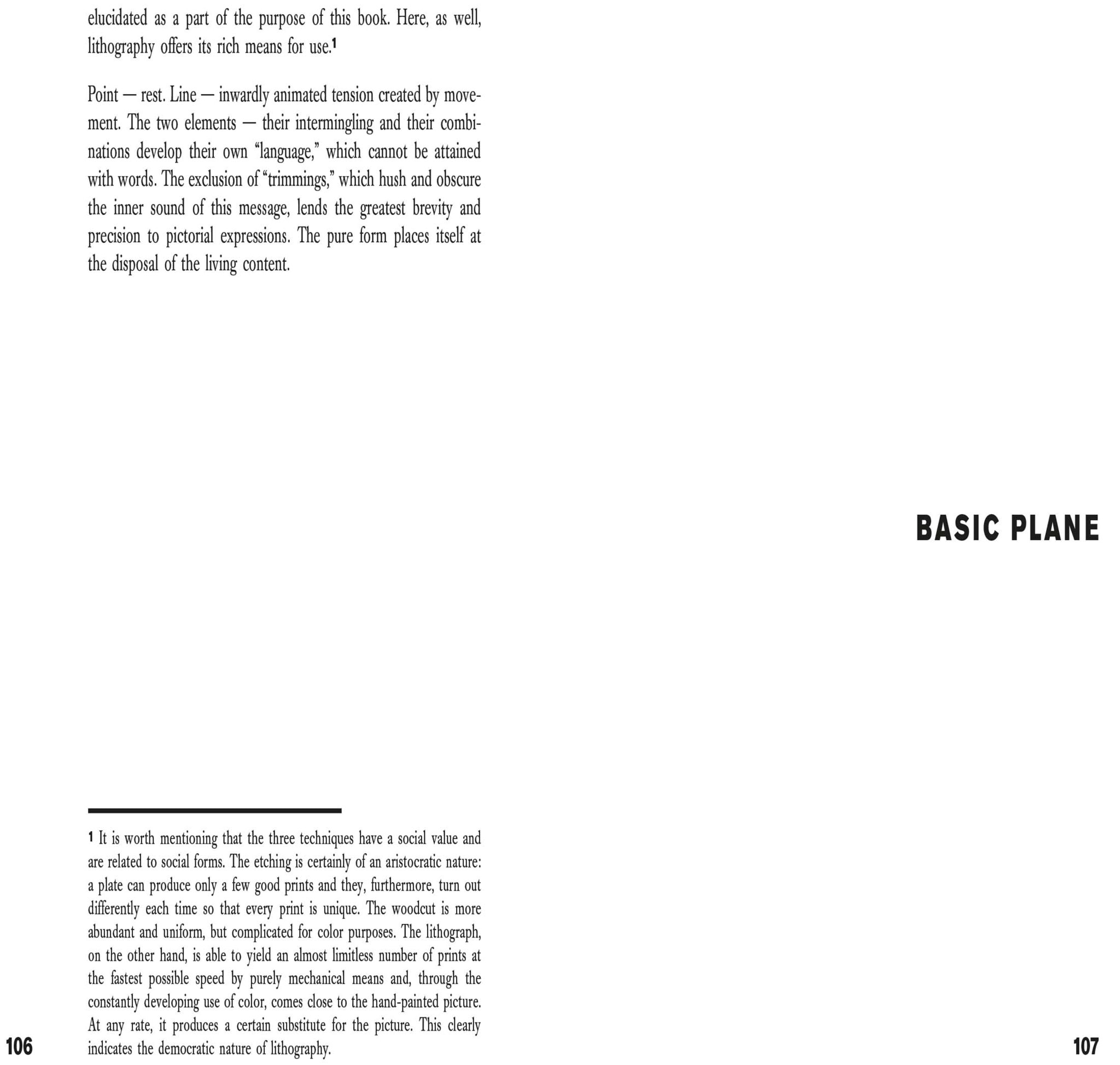 Point and Line to Plane, volume 9 of the Bauhausbücher series, can be seen as a continuation of Wassily Kandinsky's seminal treatise On the Spiritual in Art. Kandinsky's thesis is that different constellations of point, line and surface have different emotional effects on the viewer. Starting from the point (which represents the most concentrated and minimal graphic form), he understands all painterly forms as being a play of forces and counterforces: of contrasts.