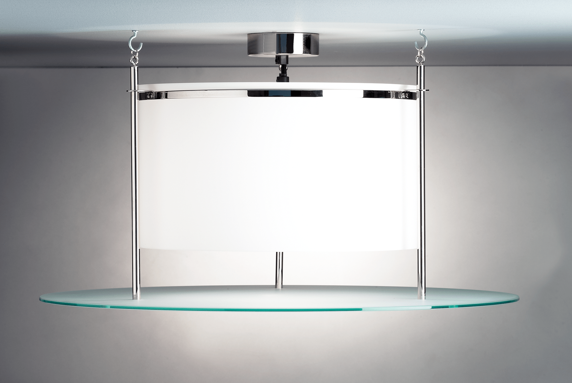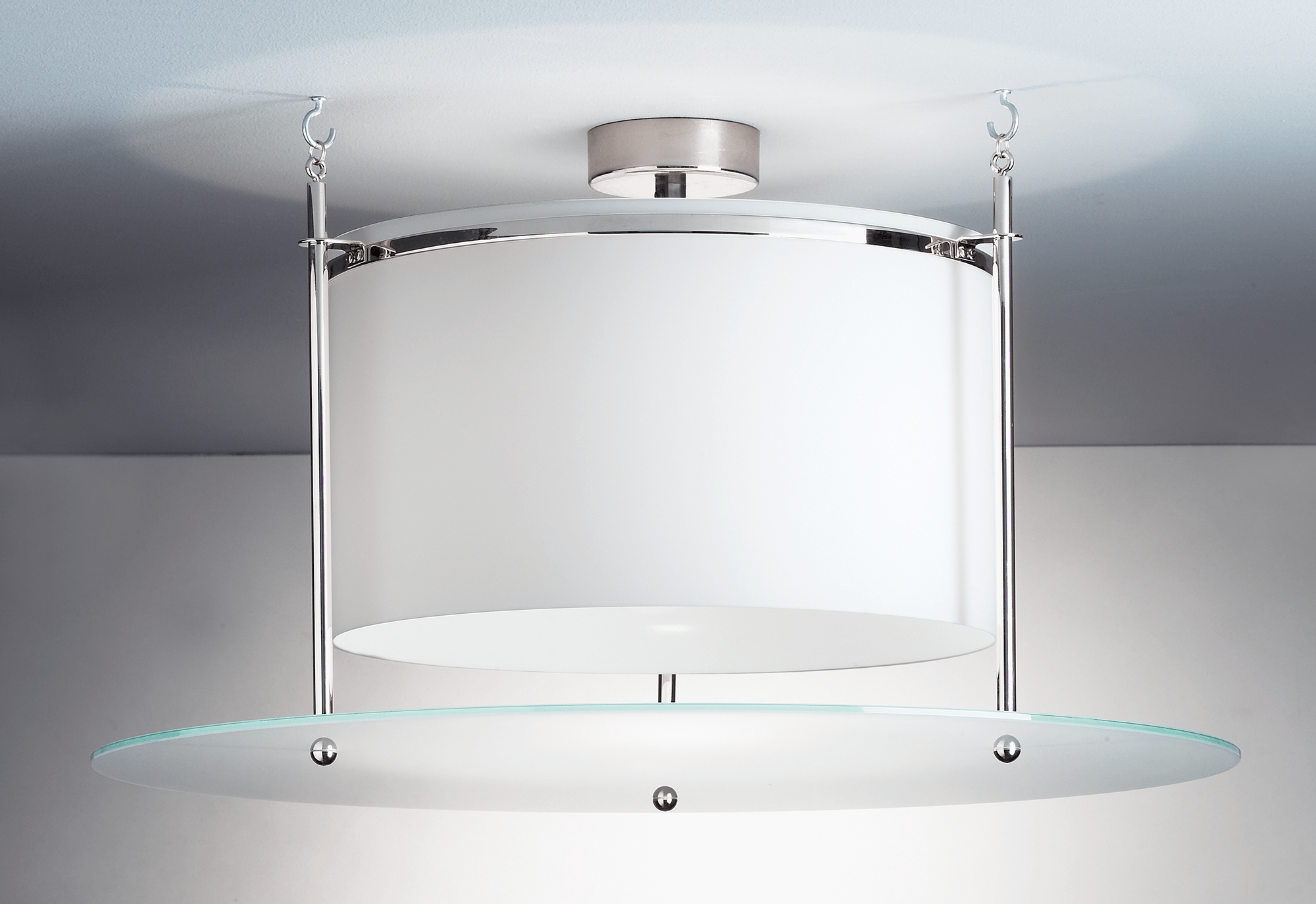 Ceiling lamp made of nickel-plated metal, opal and etched matt glass.