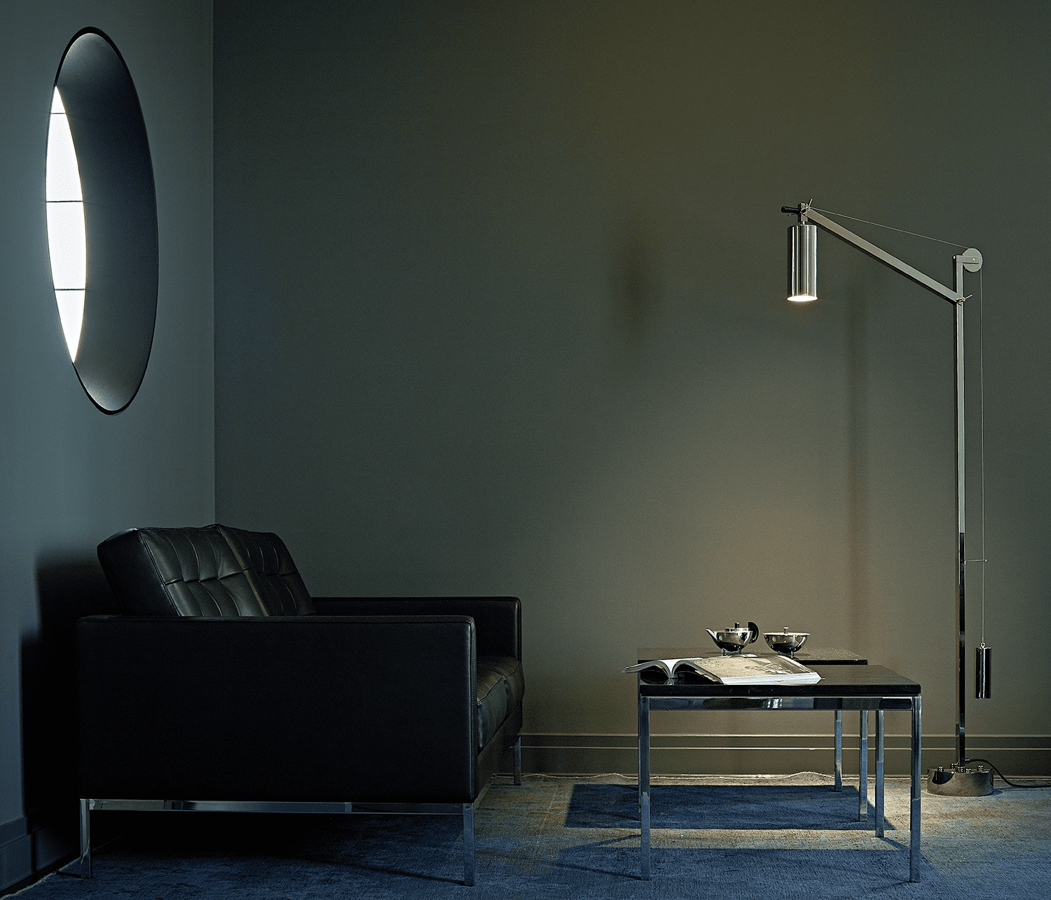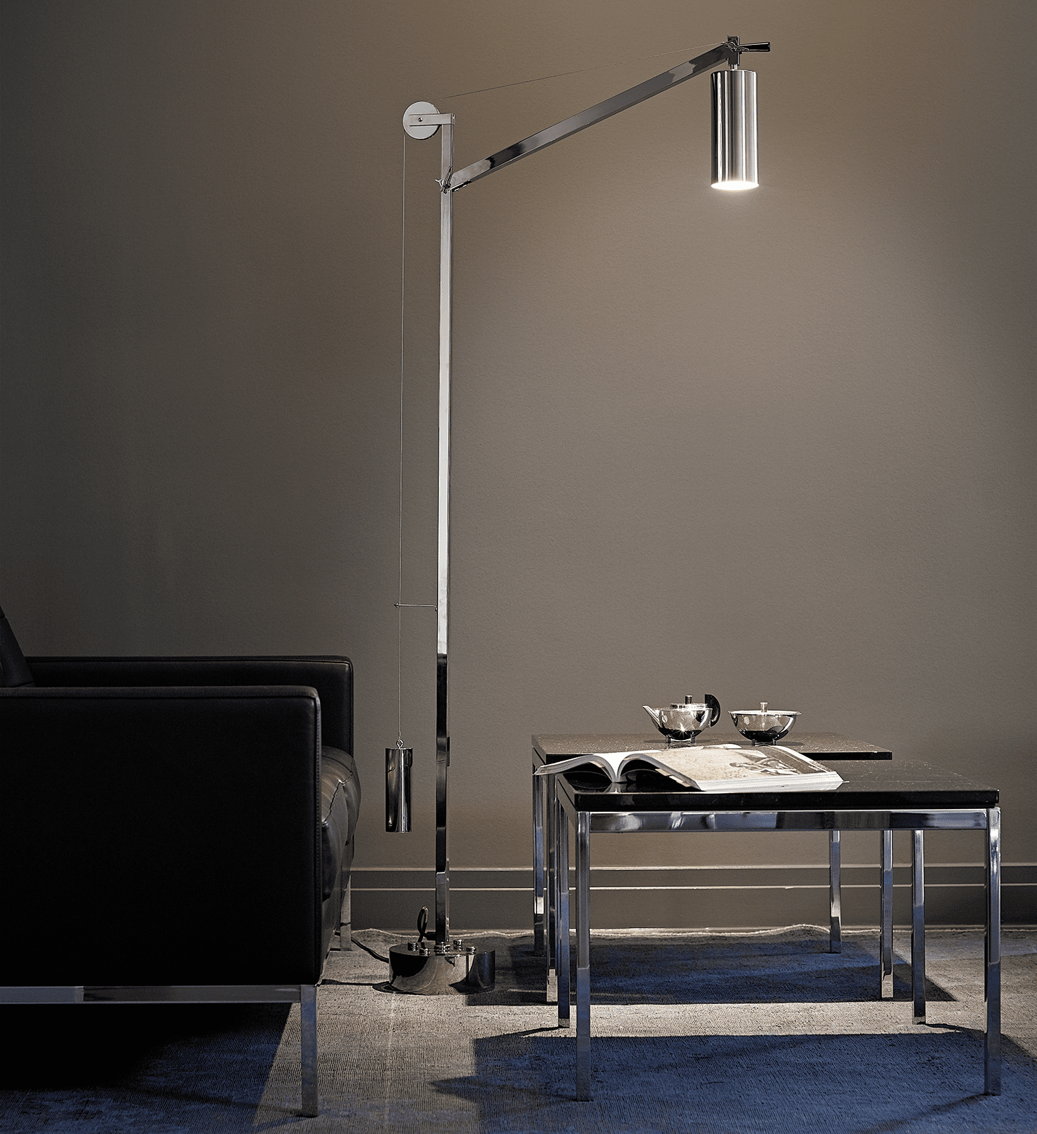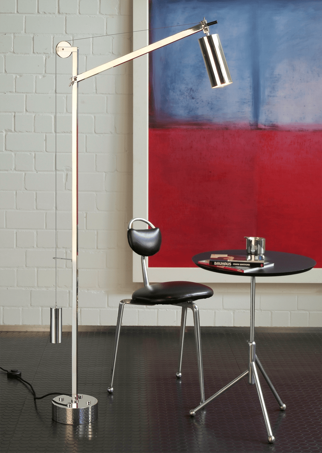 The connoisseur will see it immediately: this lamp design is typical of the Bauhaus style. The nickel-plated metal floor lamp, designed in the 1920s, can be adjusted by means of the counterweight. Please note that this lamp may only be fitted with energy-saving lamps. Each lamp is consecutively numbered and marked with the Tecnolumen logo.