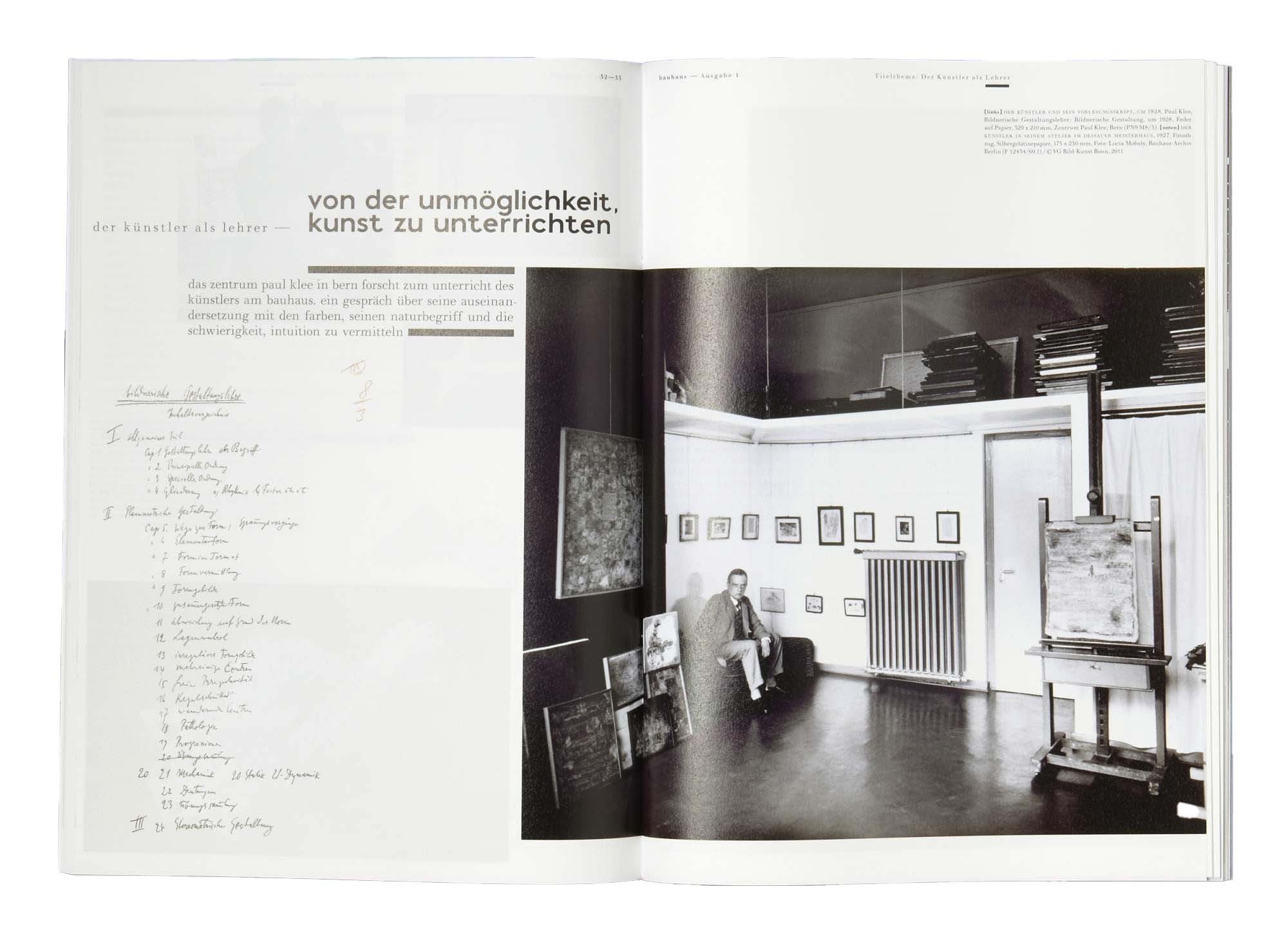 The first issue focuses on the role of the artist - at and after the Bauhaus; with contributions by Olaf Nicolai, Philipp Oswalt, Matthias Sauerbruch, Christina Tilmann and others.