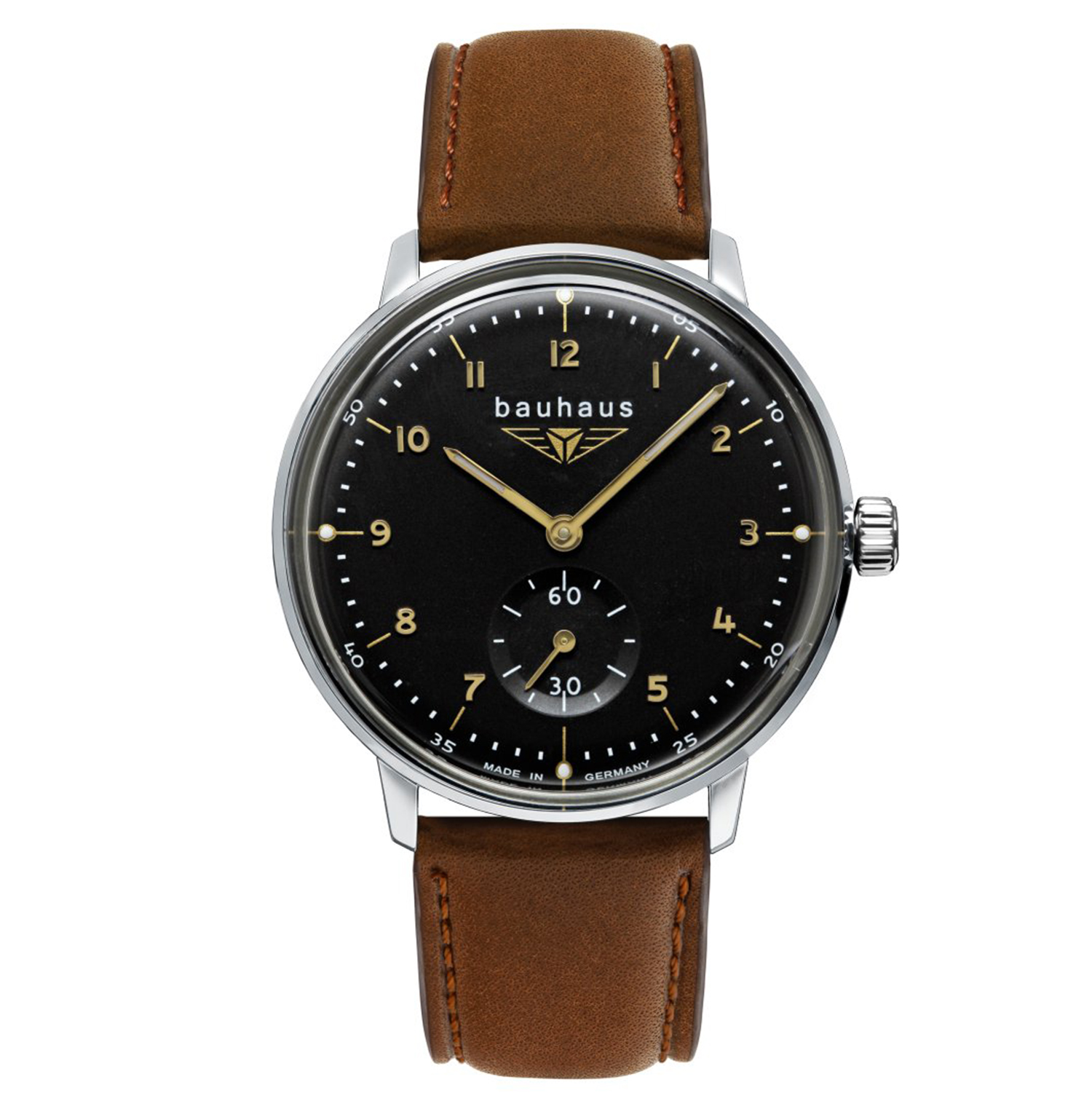 The classic wristwatch with a black dial, gold numerals and luminous hands combines timeless elegance and precision. Powered by a Swiss quartz movement Ronda 1069 with 2 jewels, protected by mineral K1 safety glass, and encased in an analog stainless steel case with a diameter of 35 mm and a height of 10 mm, this watch is water-resistant to 5 bar. Made in Germany with in-house production in Ruhla, it embodies the perfect balance between German craftsmanship and Swiss watchmaking tradition.