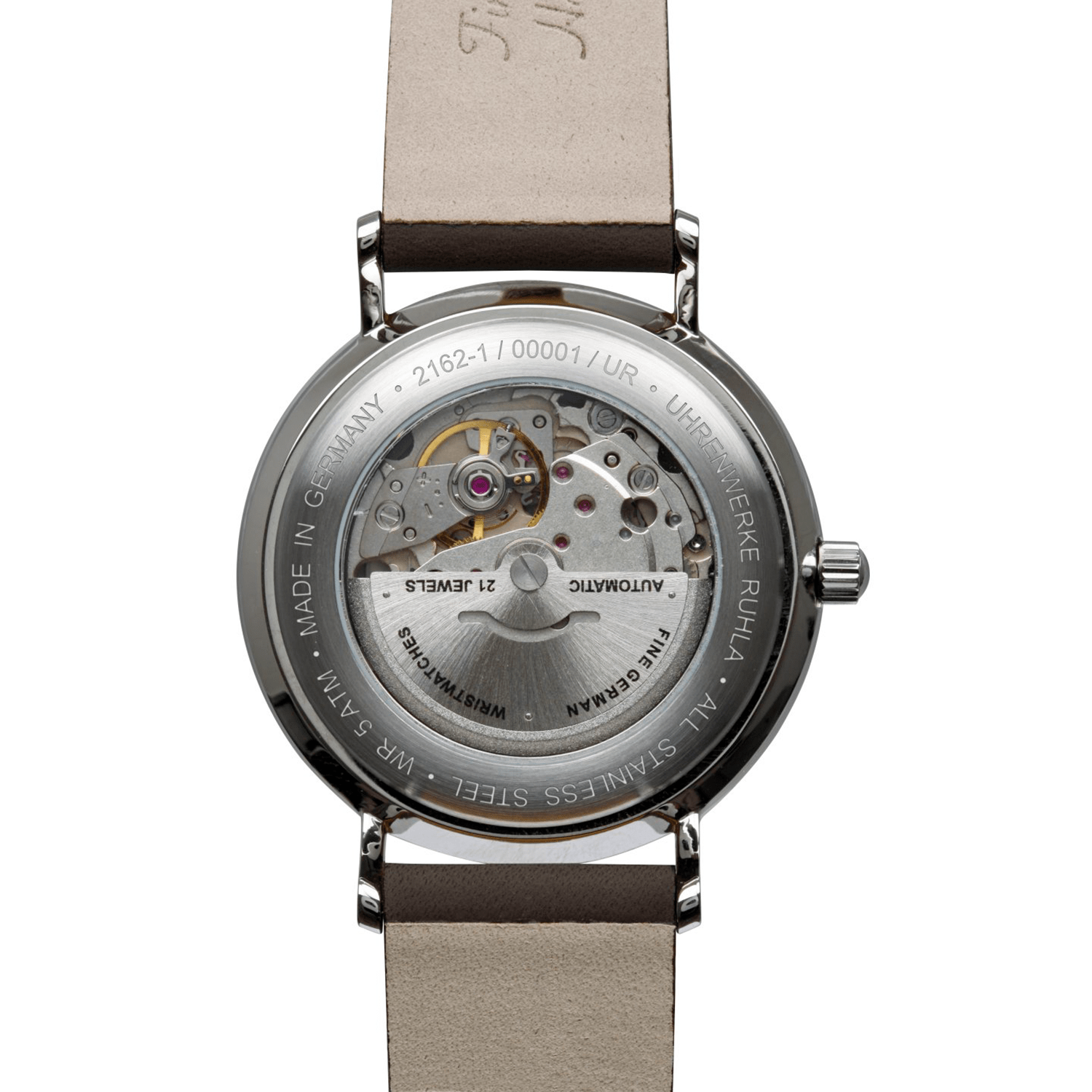 The automatic model Ref. 2162-1 has a special feature, displaying a large day window at 12 o’clock, which fits perfectly into the minimalist design of the series. The white dial, the two-tone hands, the rounded case and crystal give this watch a look of quality and elegance and make it the finishing touch for every look. Polished stainless steel, extra scratch-resistant K1 safety crystal and a movement from the traditional Japanese manufacturer Citizen/MIYOTA, which can be viewed through the glass bottom, make this not only a beautiful design, but also a durable timepiece for everyday wear.