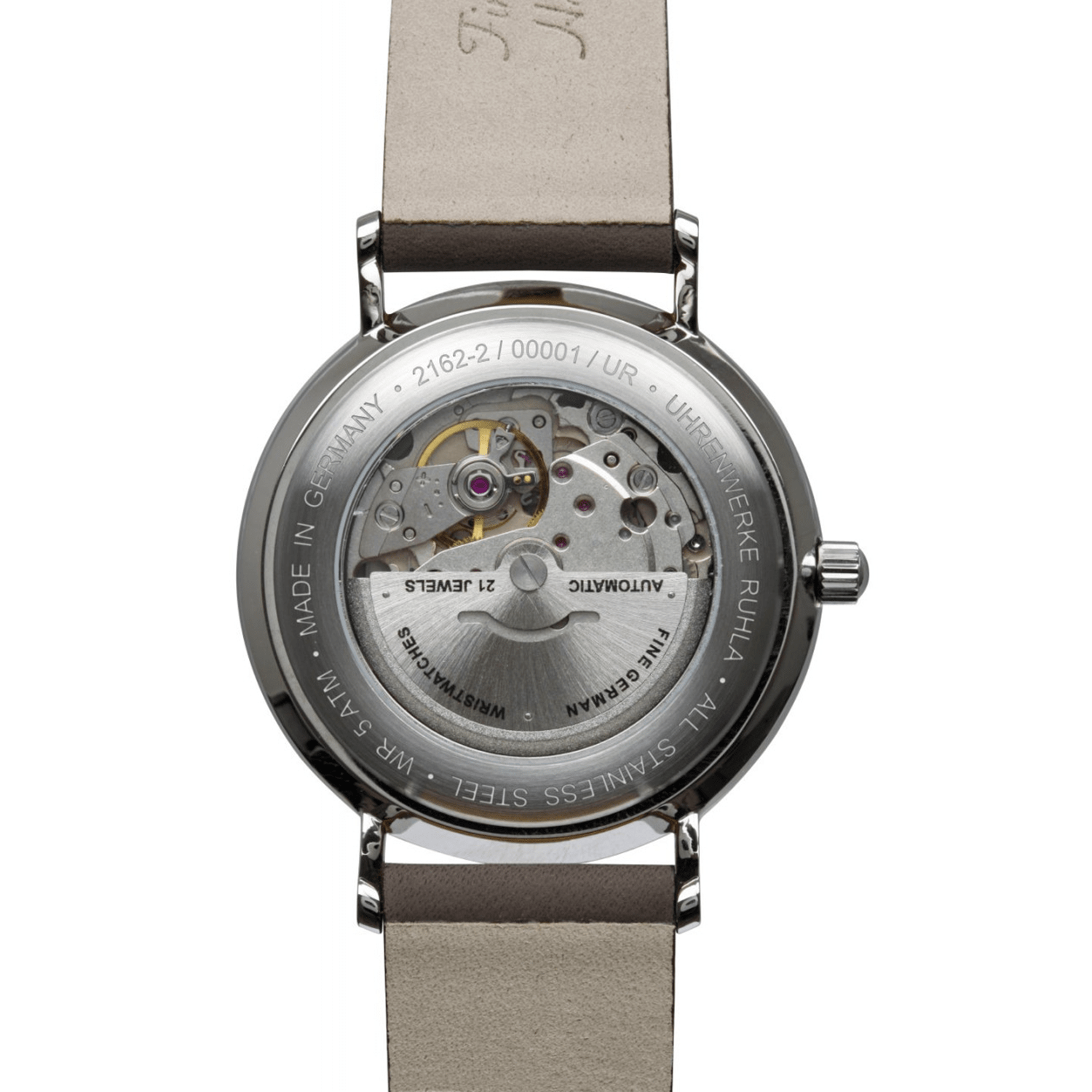 The automatic model Ref. 2162-2 has a special feature, displaying a large day window at 12 o’clock, which fits perfectly into the minimalist design of the series. The black sunburst dial, the two-tone hands, the rounded case and crystal give this watch a look of quality and elegance and make it the finishing touch for every look. Polished stainless steel, extra scratch-resistant K1 safety crystal and a movement from the traditional Japanese manufacturer Citizen/MIYOTA, which can be viewed through the glass bottom, make this not only a beautiful design, but also a durable timepiece for everyday wear.