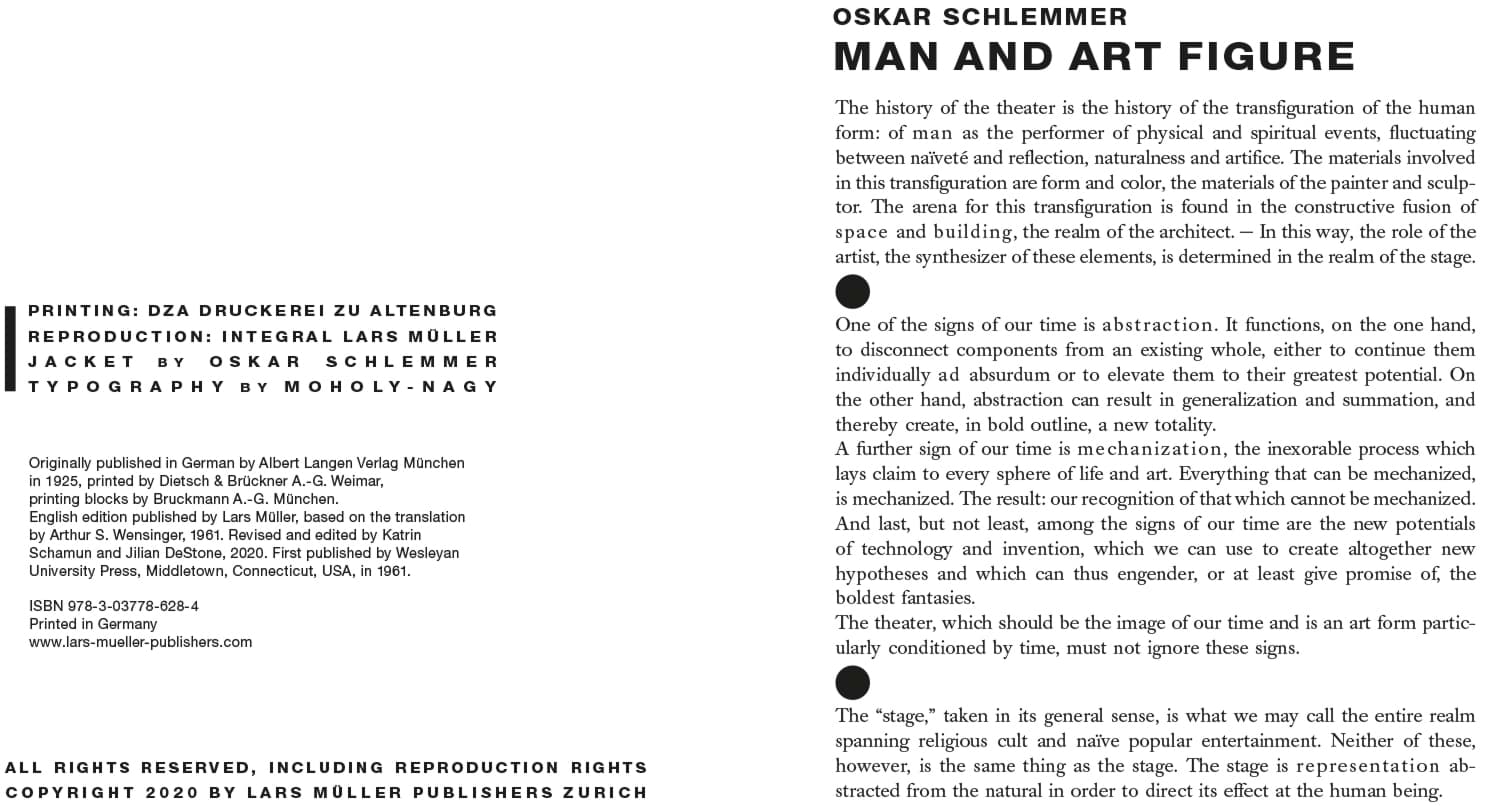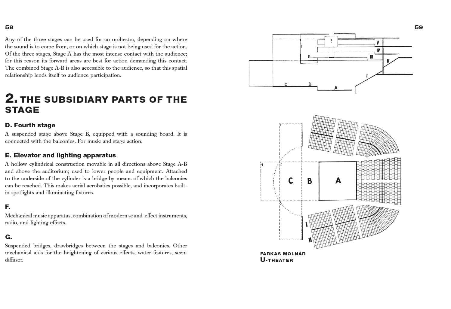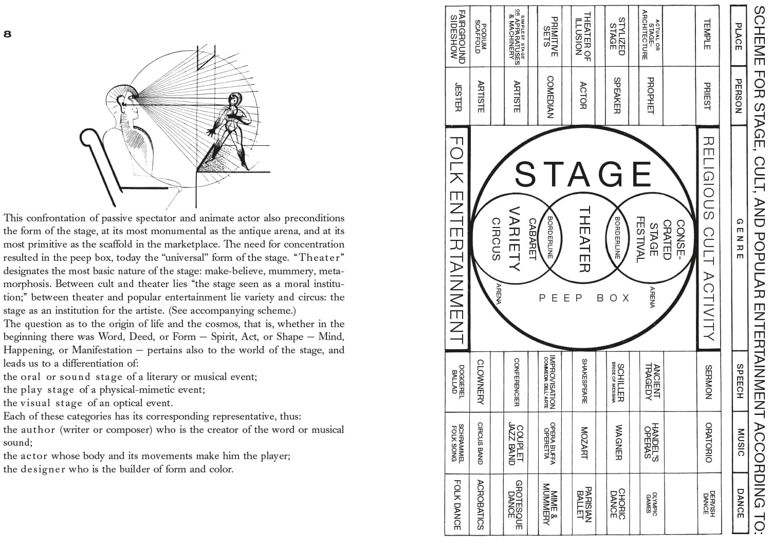 The Bauhaus stage is that of the Weimar period, essentially shaped by Oskar Schlemmer, who had taken over the stage department in 1923. László Moholy-Nagy, who was appointed to the Bauhaus the same year, took an interest in abstract kinetic and luminary phenomena which he examines in his essay "Theatre, Circus, Variété." Farkas Molnár focused for his part on stage architecture, which he discusses in detail in this volume