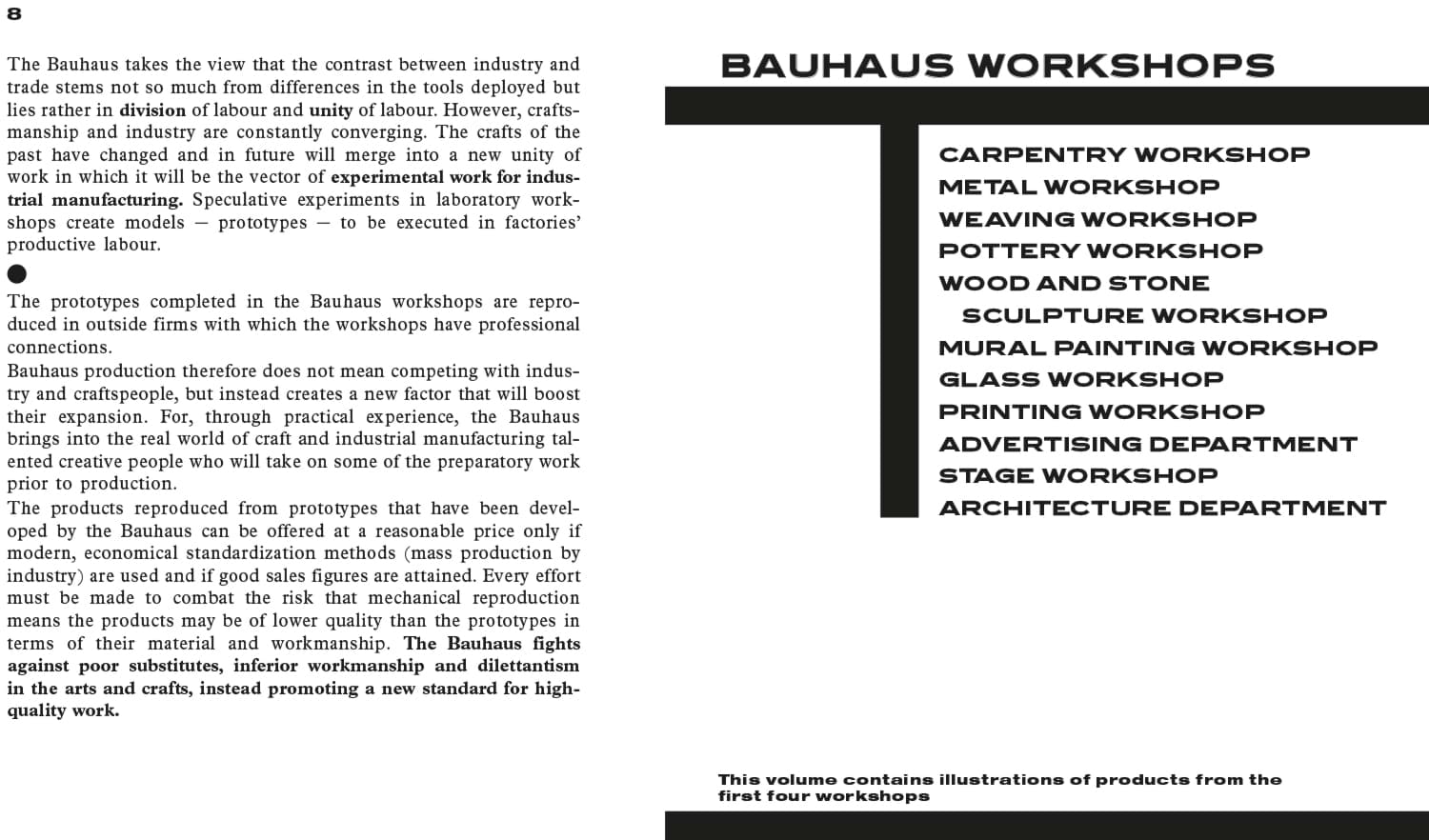 The Bauhaus sought to unite life, craftsmanship, and art under one roof. In this volume, Walter Gropius provides a comprehensive overview of the Bauhaus workshops. He explains the basic principles guiding the teaching, describes contemporary developments in architecture, and illuminates the Bauhaus point of view on household utensils, which was geared toward finding the most suitable form for the respective object. Here, Gropius presents the Bauhaus workshops in Weimar devoted to furniture, metals, textiles, and ceramics, among other subjects.