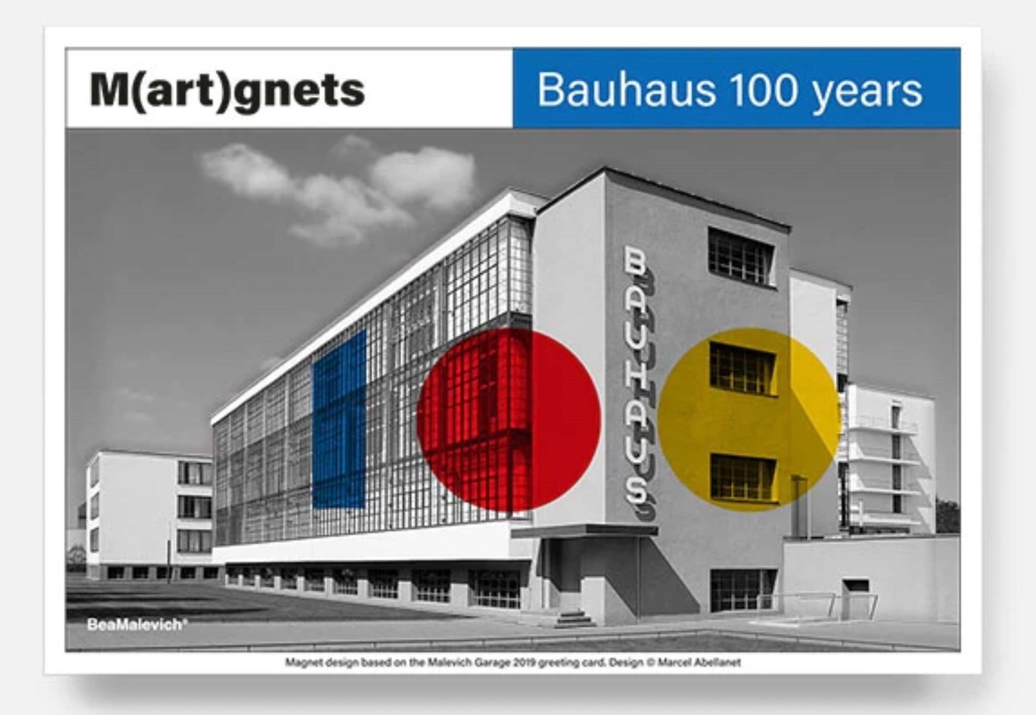 With its main building easily recognizable in a scale of grey, the number 100 displays in the three main Bauhaus' colors to commemorate its anniversary.