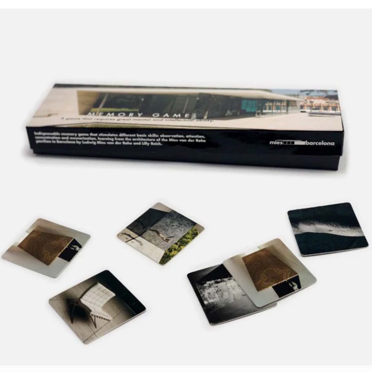 An indispensable memory game in the format of a card-pairing (or card-matching) concentration games, that stimulates different basic skills: observation, attention, concentration, and memorization, learning from the architecture of the Mies van der Rohe Pavilion in Barcelona by Ludwig Mies van der Rohe and Lilly Reich.