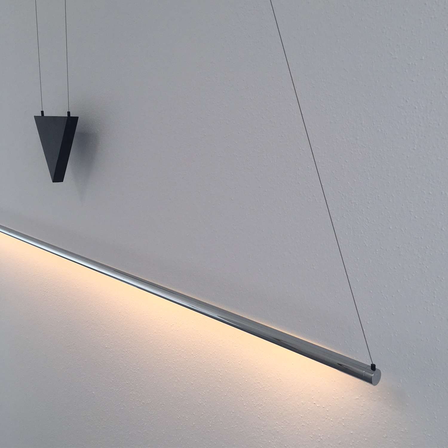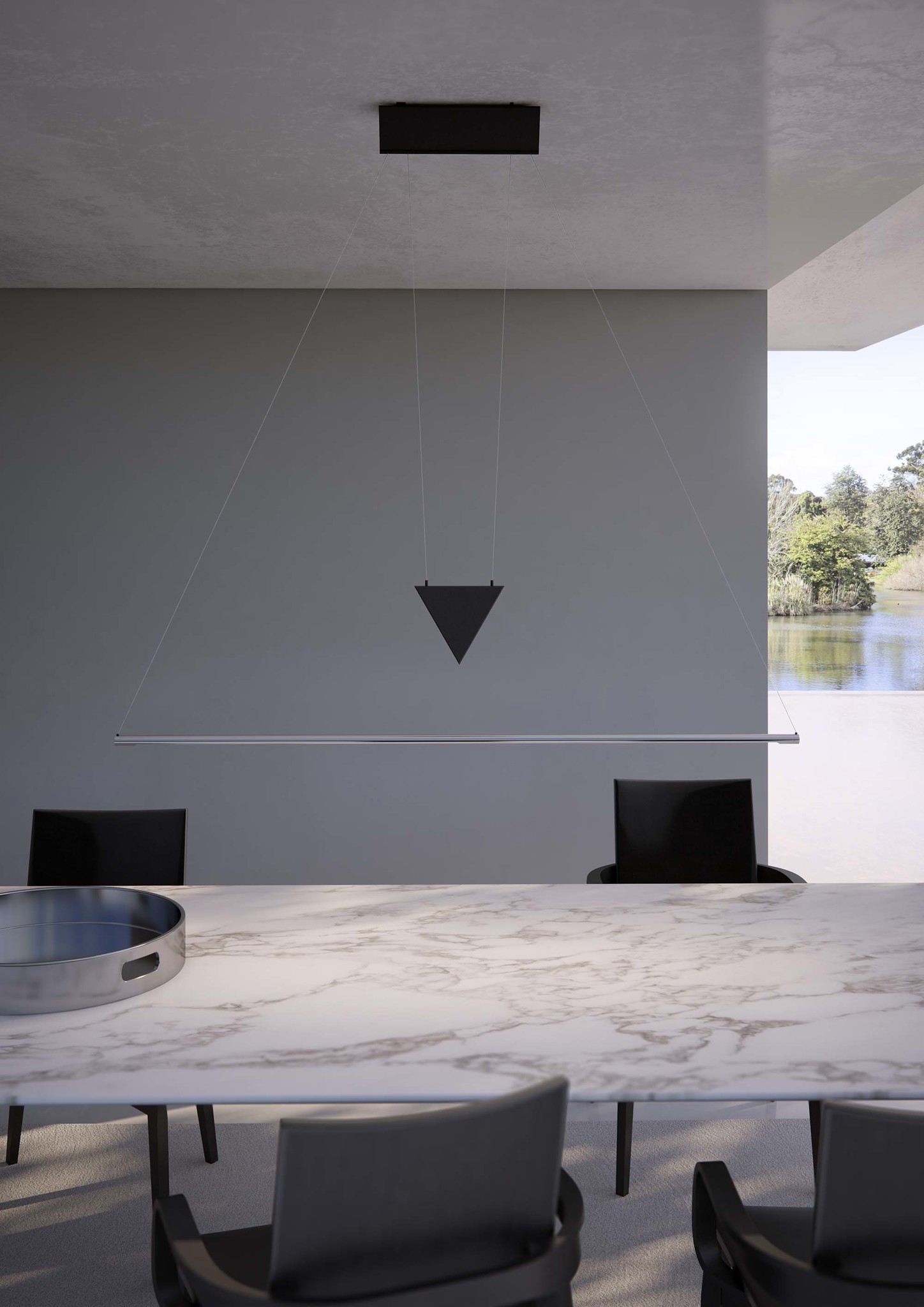 The Filum pendant light represents an adjustable hanging light fixture equipped with a touch dimmer and counterweight functionality. This light fixture allows for a complete 360-degree rotation, enabling precise positioning of the light. With a simple touch of the pin on the lamp, not only can the light be turned on or off, but also continuous dimming is made possible.