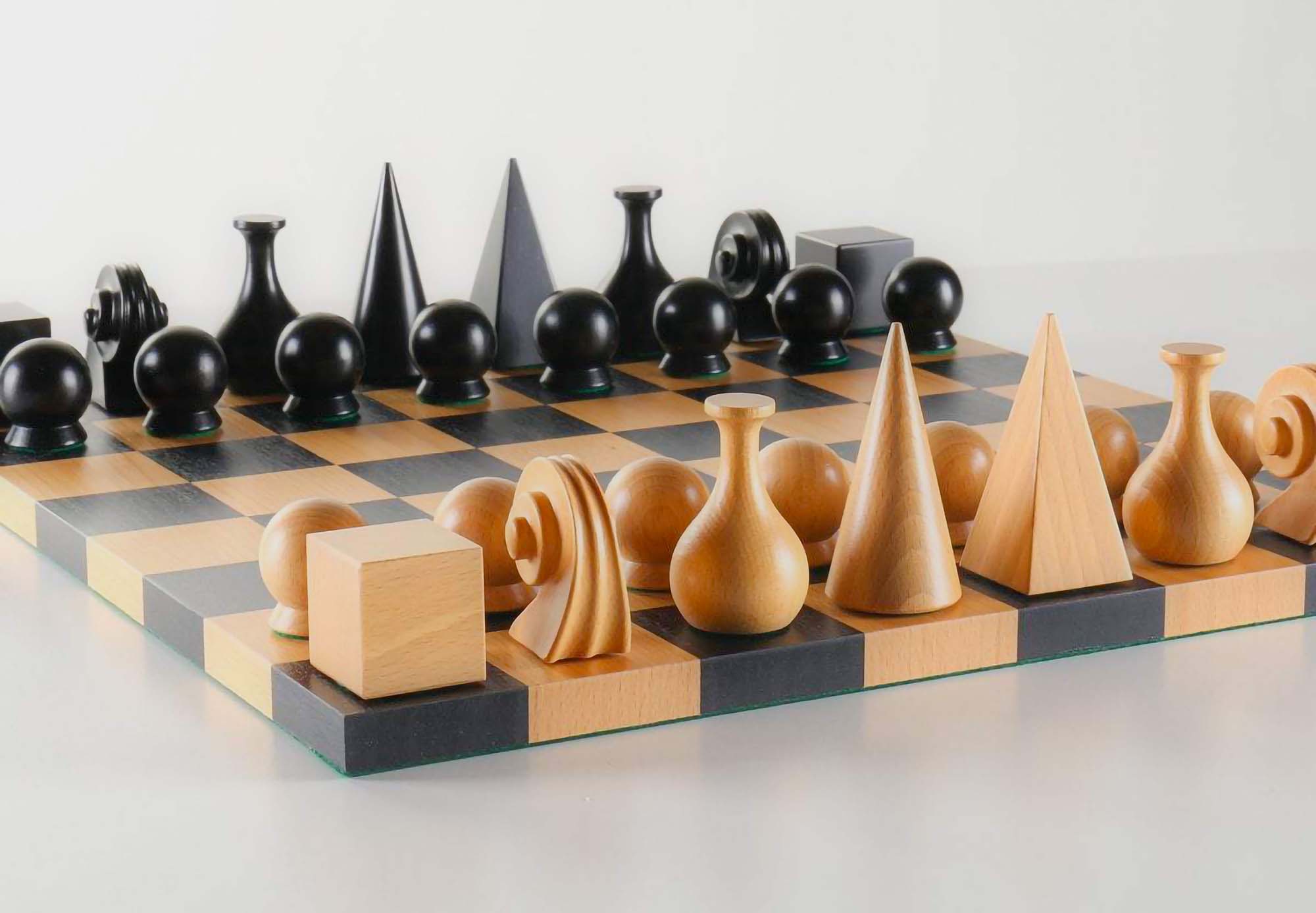 In this, his first design of chess pieces, Man Ray eschewed traditional and pictorial forms of identification. Instead, he used the "ideal forms," Euclid's pure geometric shapes: cube, sphere, pyramid, and cone. Instead, he made iconic references. For example, the pyramid is the Egyptian symbol of royal rule, and the cones are the shape of a queen's medieval headdress. The runner (bishop in English) is associated with a bishop's preparation of exotic liquors and spirits, requiring a pitcher. Man Ray was also a Dadaist and so he could not refrain from adding at least one discordant, but still elegant figure. The shape of the jumper is the scroll of a violin from Man Ray's studio. Geometrically, the jumper in the form of a snail represents the Fibonacci sequence, which describes the spiral growth in natural forms.