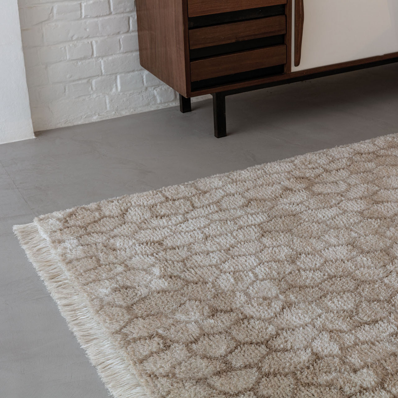 Measuring 170 × 230 cm, this rug fits beautifully into small living spaces, under lounge chairs, in bedrooms or as a focal point in entryways – always adding warmth and material clarity.