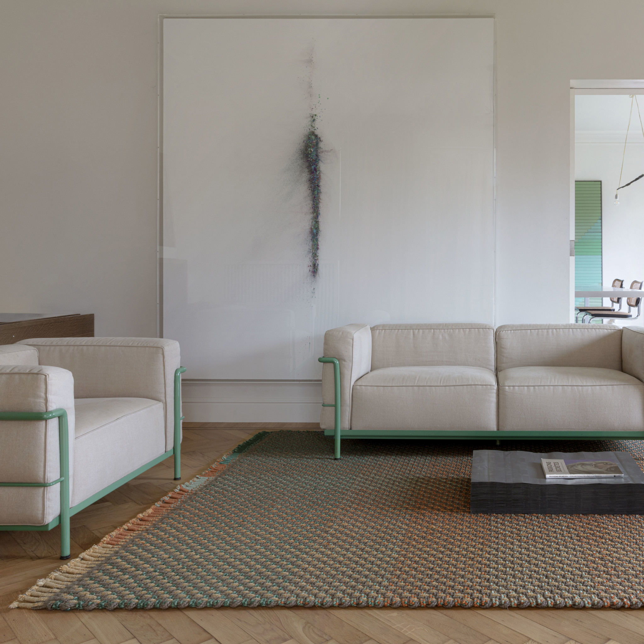 The limited edition rug "Omega Window Rug" showcases post-impressionist aesthetics in hand-dyed wool.