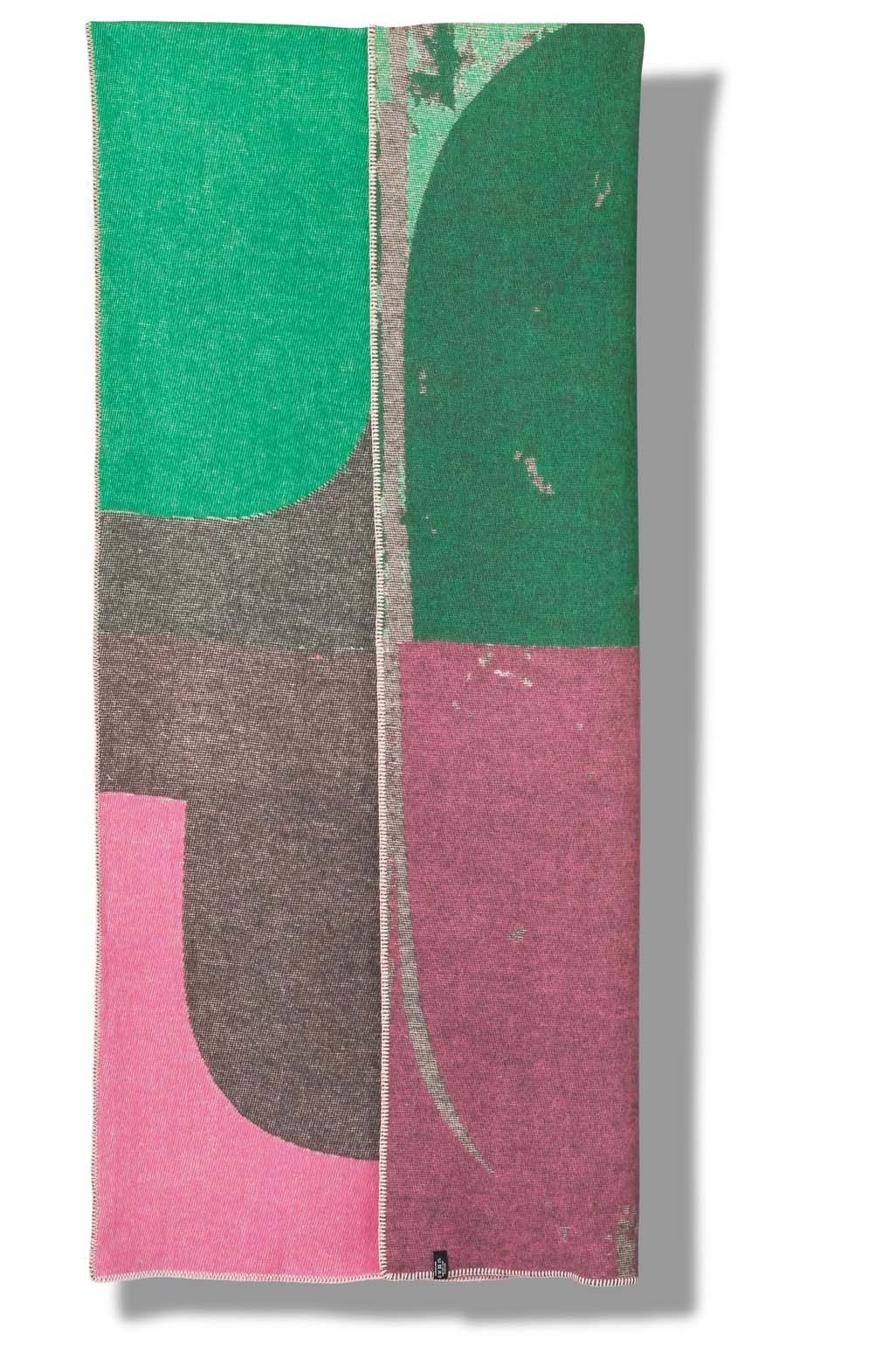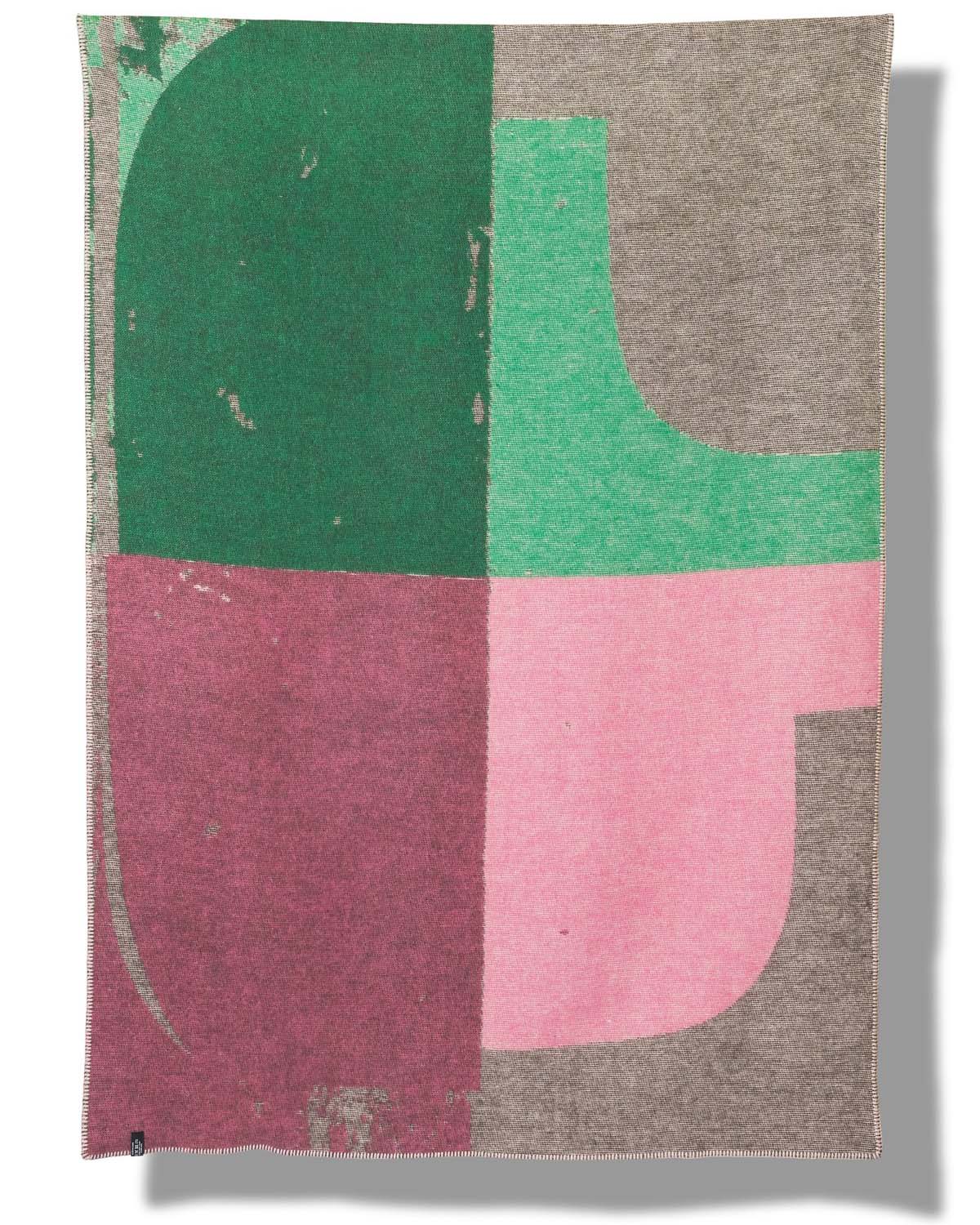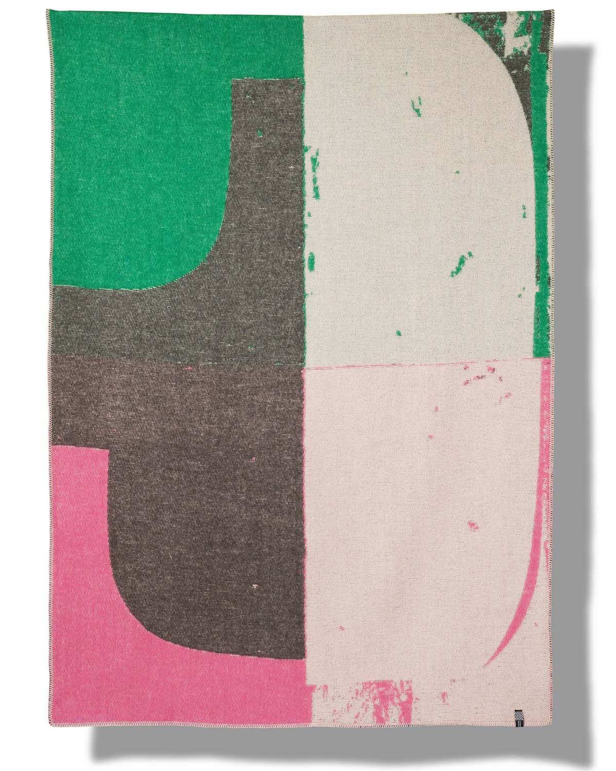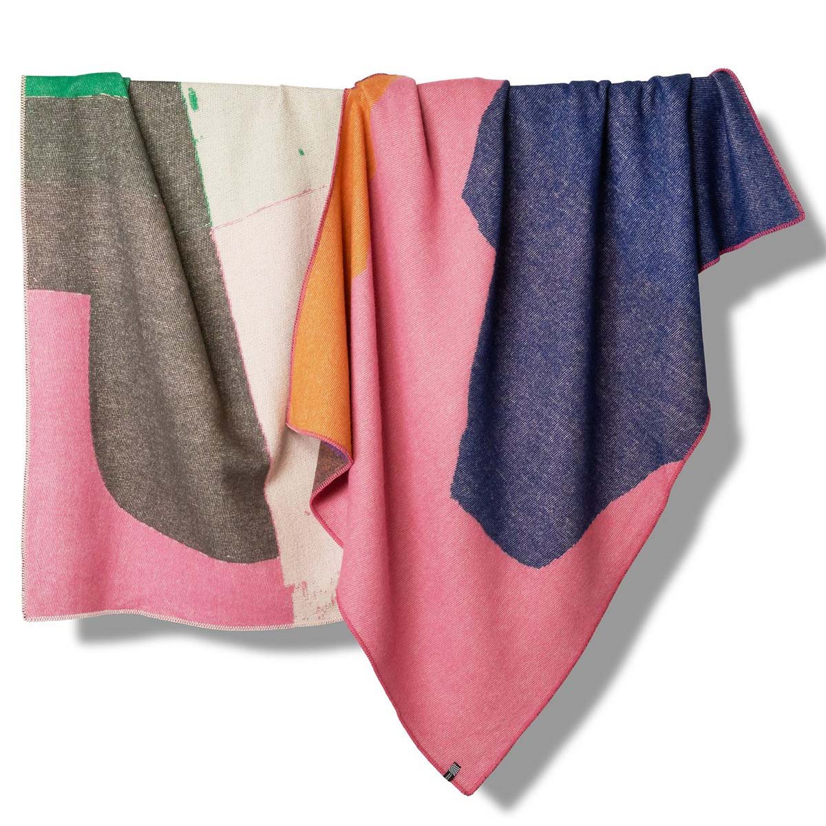 “Field” by Jo Hummel is a 1:1 blankets made from the original painting. “Field” was created using large sheets of painted paper, which the artist cut into shapes, flipped and rearranged until a visual balance was reached. e.