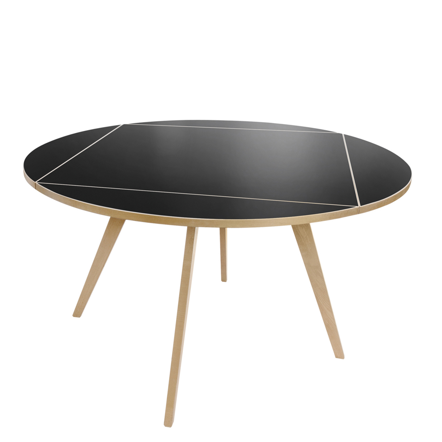 The Max Bill table is a true masterpiece of versatility. It combines the best of both worlds: square stability and round elegance. With its intelligent flaps, which can be locked in place simply by turning the support, this table transforms effortlessly from a compact square surface into a generous round table top. The visual impact of this piece of furniture is impressive and its rhythmic divisions are reminiscent of the artistic works of Max Bill himself. It is a work of art for everyday use that was designed in 1949 and perfectly embodies Bill's idea of concrete art in product design. The table legs are available in two versions, either in natural maple or in a blackened finish, depending on your personal taste and furnishing style.