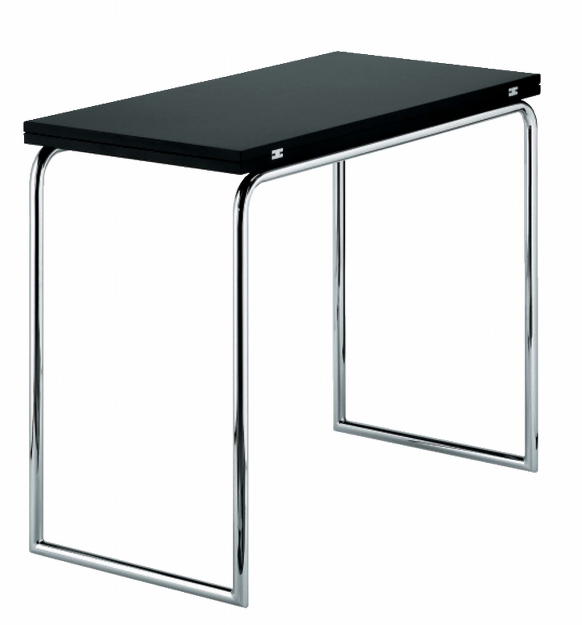 Console et table en un. La table pliante B 109 a été développée à une époque où les pièces à vivre étaient beaucoup plus petites qu'elles ne le sont aujourd'hui. Replié, il se tient contre le mur comme une console d'une profondeur de 45 cm. Si nécessaire, le panneau est tourné, déplié et verrouillé en place, ce qui donne une table avec une taille de plateau de 90 x 90 cm. Le B 109 est l'un des classiques de l'acier tubulaire des années 1920 et 1930. À l'époque, la collection d'architectes renommés a été complétée par de nombreux projets internes de Thonet.