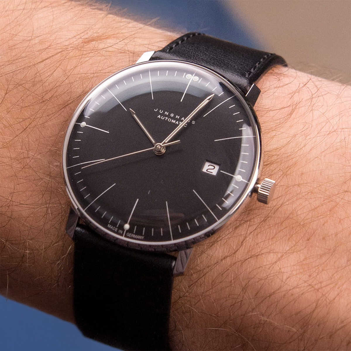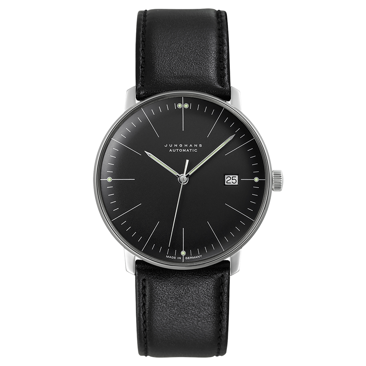 Max Bill — architect, painter, and Bauhaus alumnus — believed a watch should be "as timeless as can be conceived without forgetting the time." His 1961 collaboration with Junghans produced one of horology's most iconic dials: a matte black surface bearing only slim stick indices, a fine minute track, and pencil-shaped hands. The 27/4701.02 honours this heritage faithfully — the polished stainless steel case carries a convex sapphire crystal that allows the time to be read from an angle, while the caseback bears the engraved Max Bill signature. Nothing has been added that does not serve the reading of time.