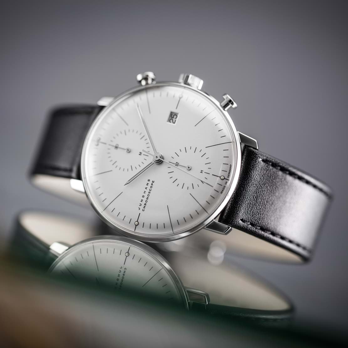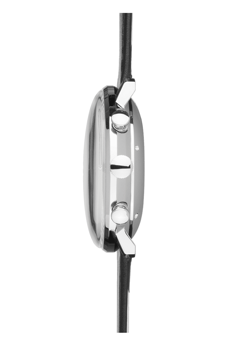Max Bill Chronoscope - As with all pieces in this collection, the design of the mechanical max bill Chronoscope is highly impressive due to its focus on the bare essentials. This can be evidenced in the plain, minimalistic design of the dial. Relinquishing display of the small seconds creates a particularly striking symmetry.
