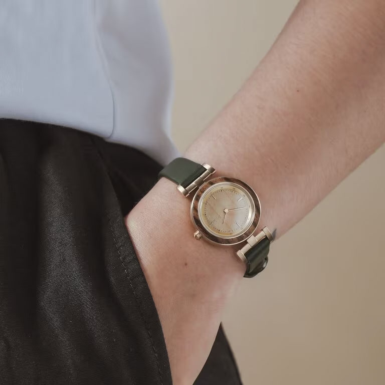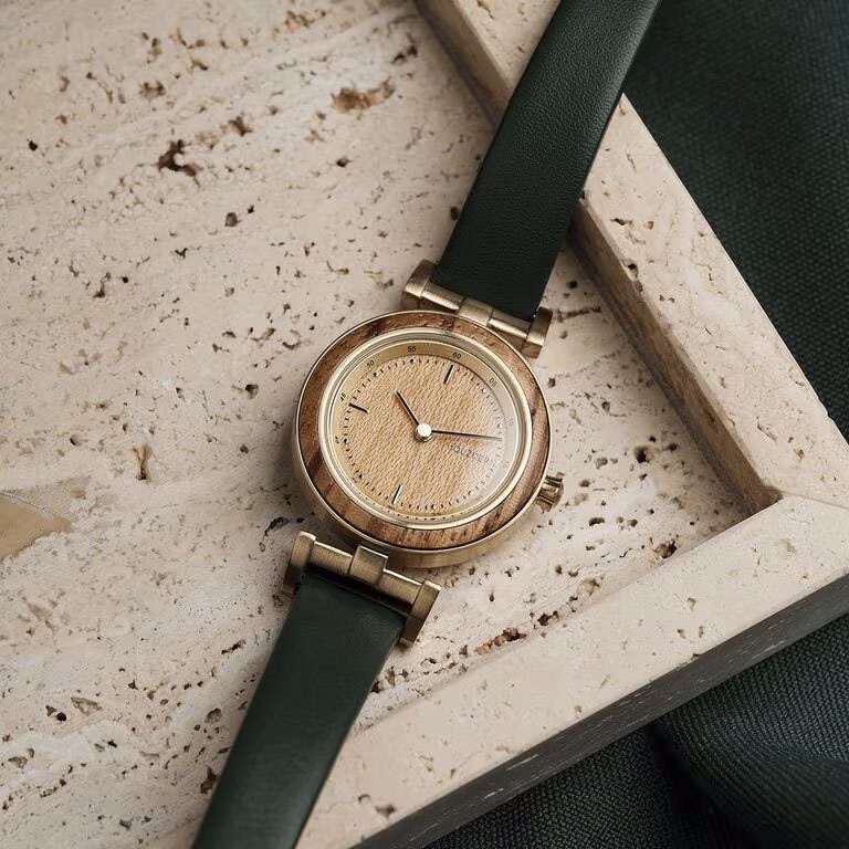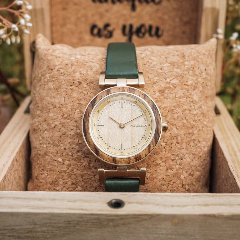 Laura – Zebrano & Oak: Elegant wood design with emerald leather strap. Lightweight, sustainable, and stylish for everyday or special moments.