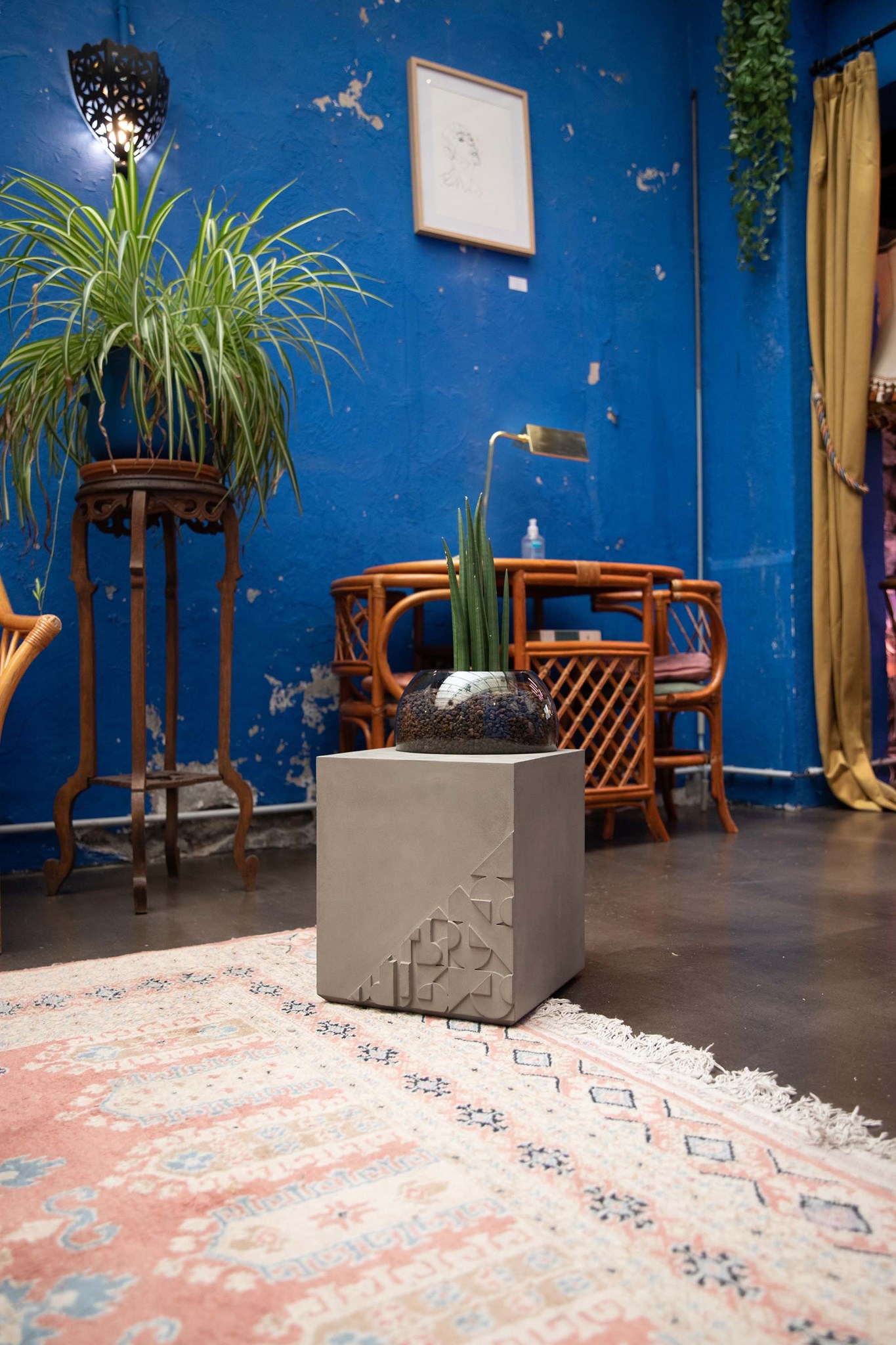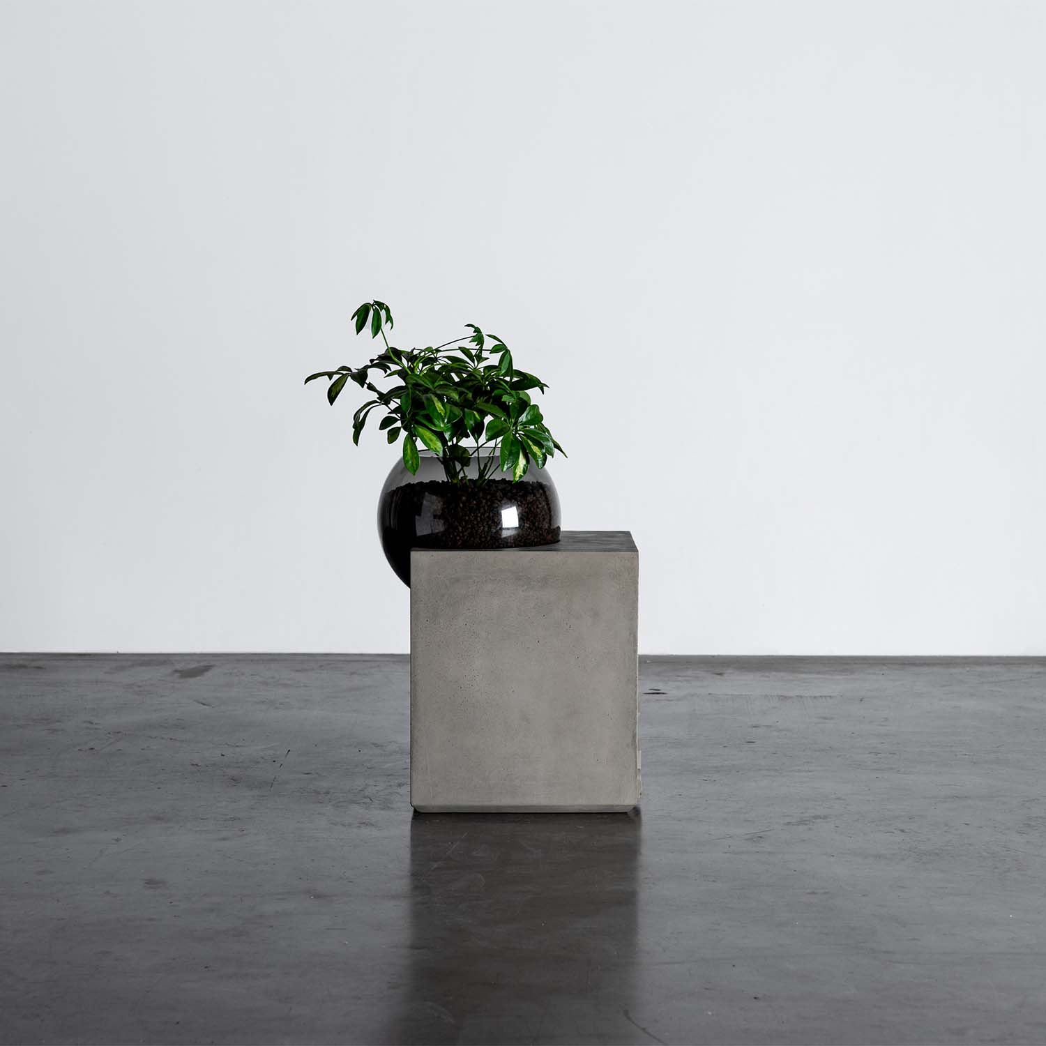This concrete cube is perfect as a side table or storage table. Thanks to its deliberately compact size, it fits in all sorts of spaces and finds a place there. The cube houses a spherical bowl made of blown glass. At first glance, this feature is surprising. At second glance, it is an open invitation from designer Bertrand Jayr to create this glass bowl himself. The wheels of imagination begin to turn. This hybrid piece of furniture becomes more than a simple side table. Terrarium? Vase? Candy dish? Yep, it's a good place to start. You'll find a thousand other uses as you incorporate this table into your everyday life.