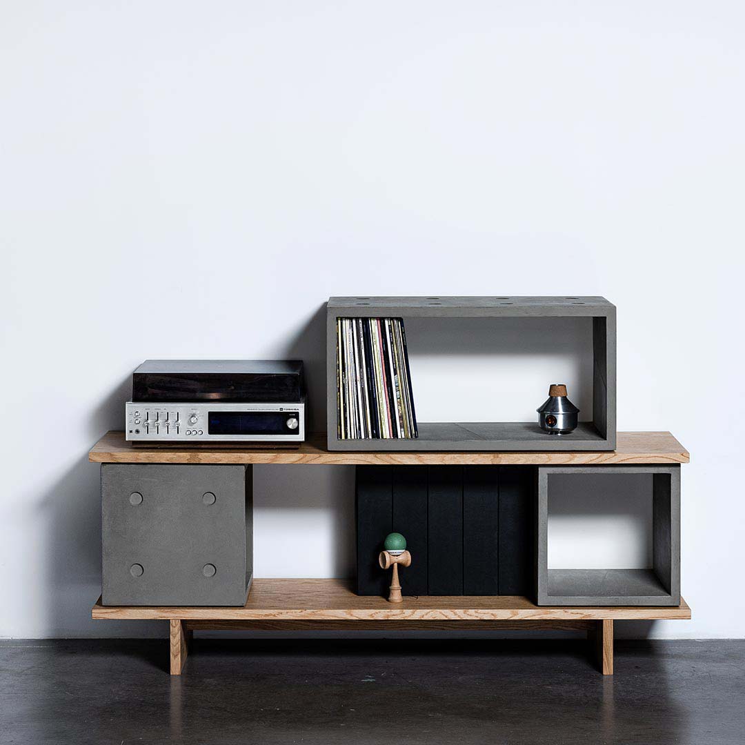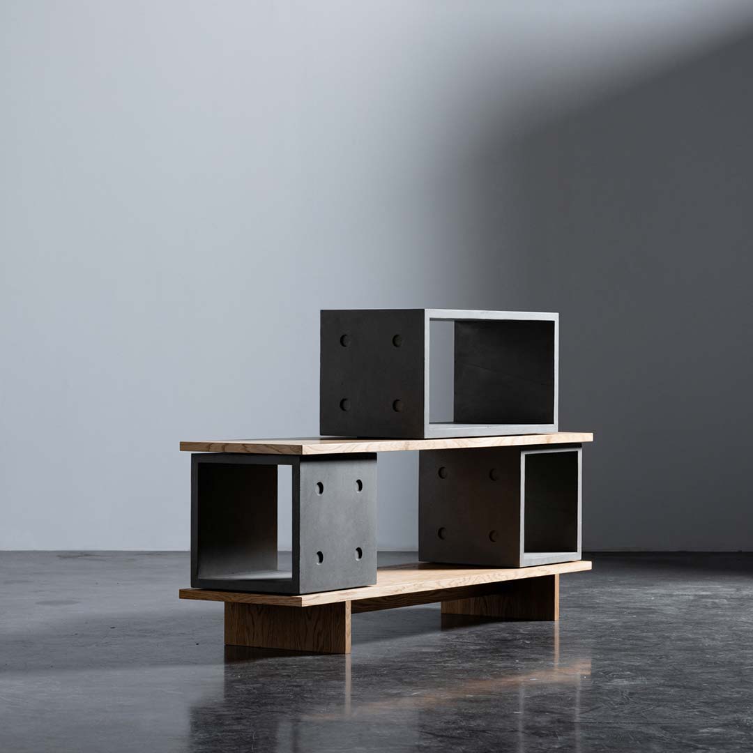 Dice cabinet shelf series. Quite strong pieces - both in appearance and functionality! Alexandre Dubreuil takes inspiration from Charlotte Perriand and her iconic cabinets and shelves, adds distinctive wooden elements to his popular concrete cubes and ashlars that have been manufactured by Lyon Béton for years. To accentuate the "brutal" look of the concrete, the shelves are finished with a natural oak veneer finish. In principle, a modular system has now been created in which the concrete elements are placed on the wooden shelves rotated as desired, i.e. showing either their open or closed side. To ensure that the concrete elements neither slip nor rub on the wooden surfaces, they have four circular recesses on each side: Wherever the two materials meet, special rubber buffers are used here.