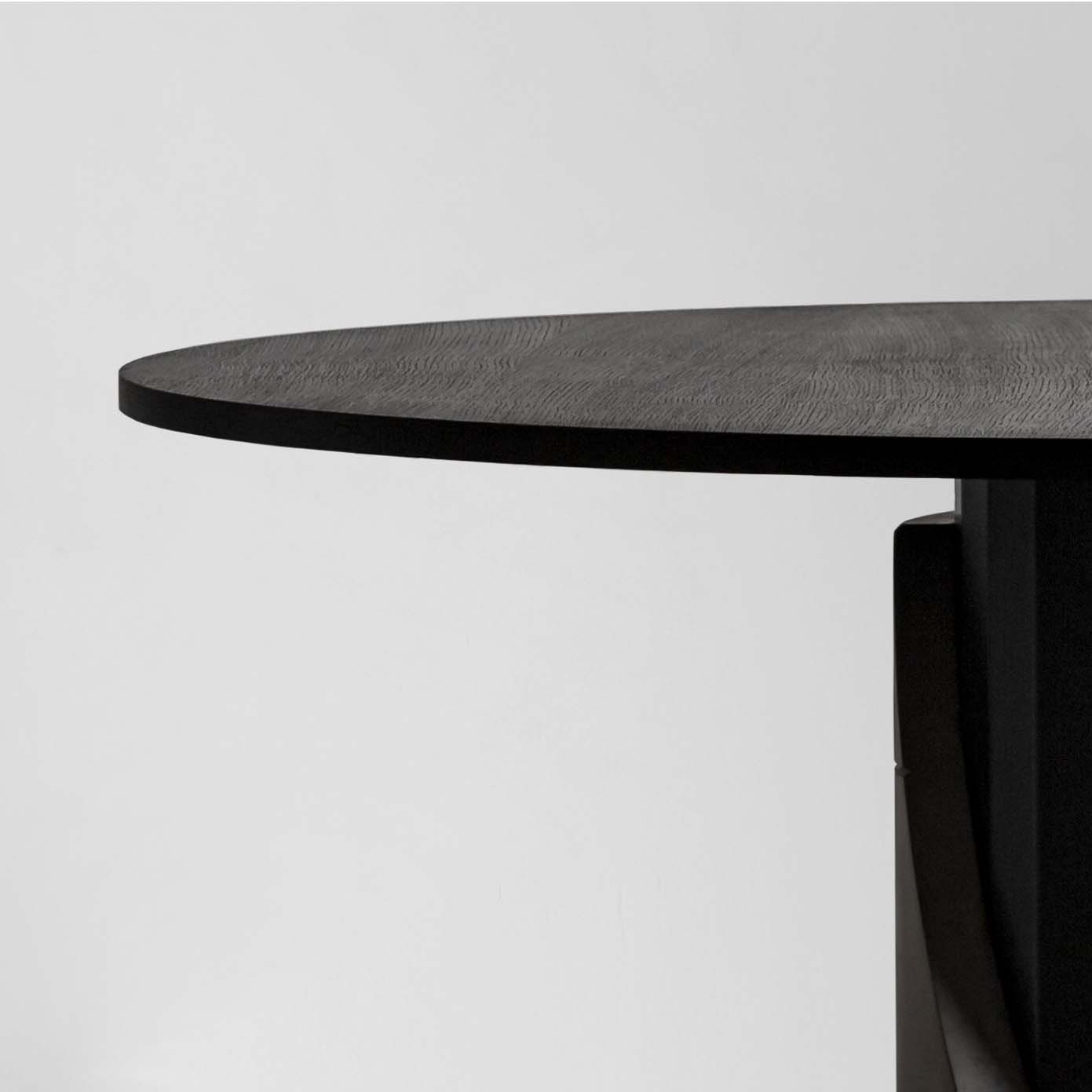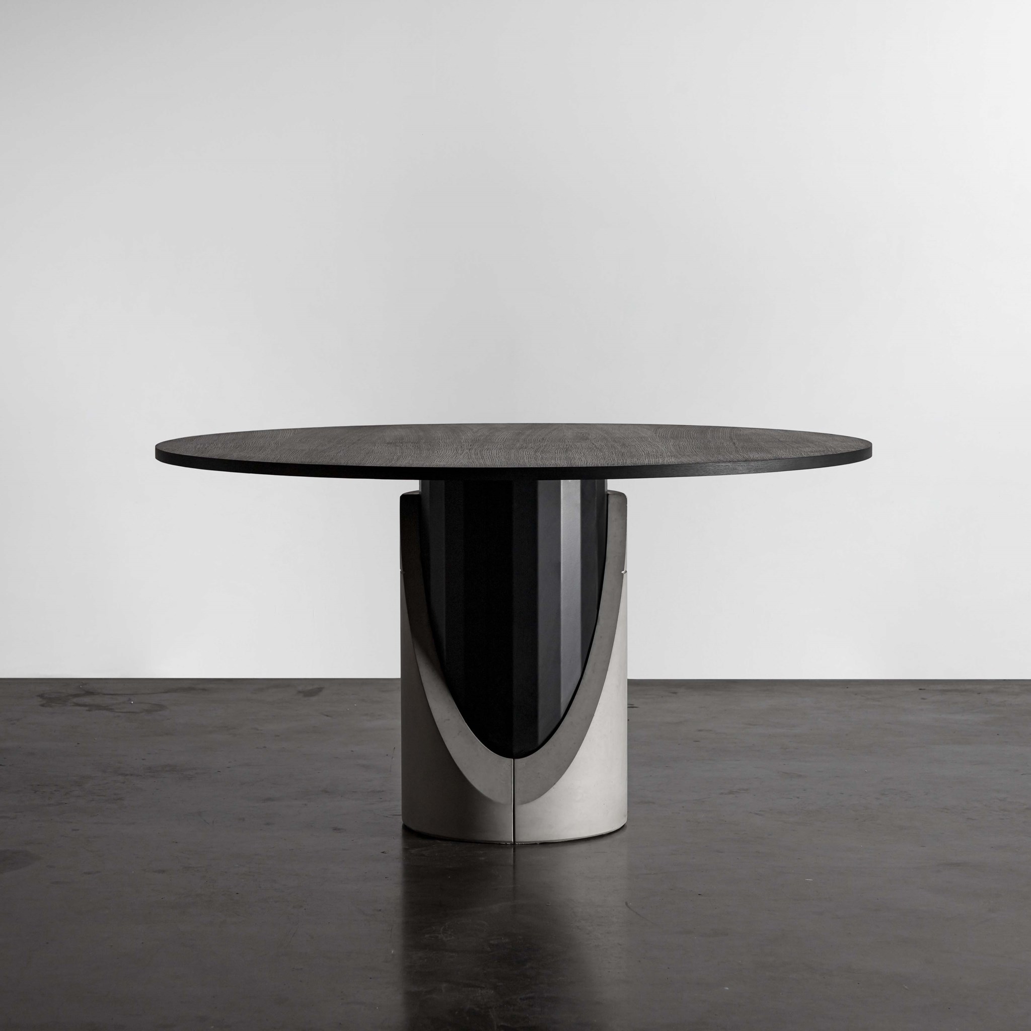 With the Sharp dining table, designer Bertrand Jayr destructures the symbiosis between concrete and metal. The reversible concrete ballast protects and reveals a black metal shaft with delicate facets. The oak veneer top is tinted with a deep matte black oil. The oblong version of 140 cm long by 140 cm wide can comfortably accommodate 6 people.