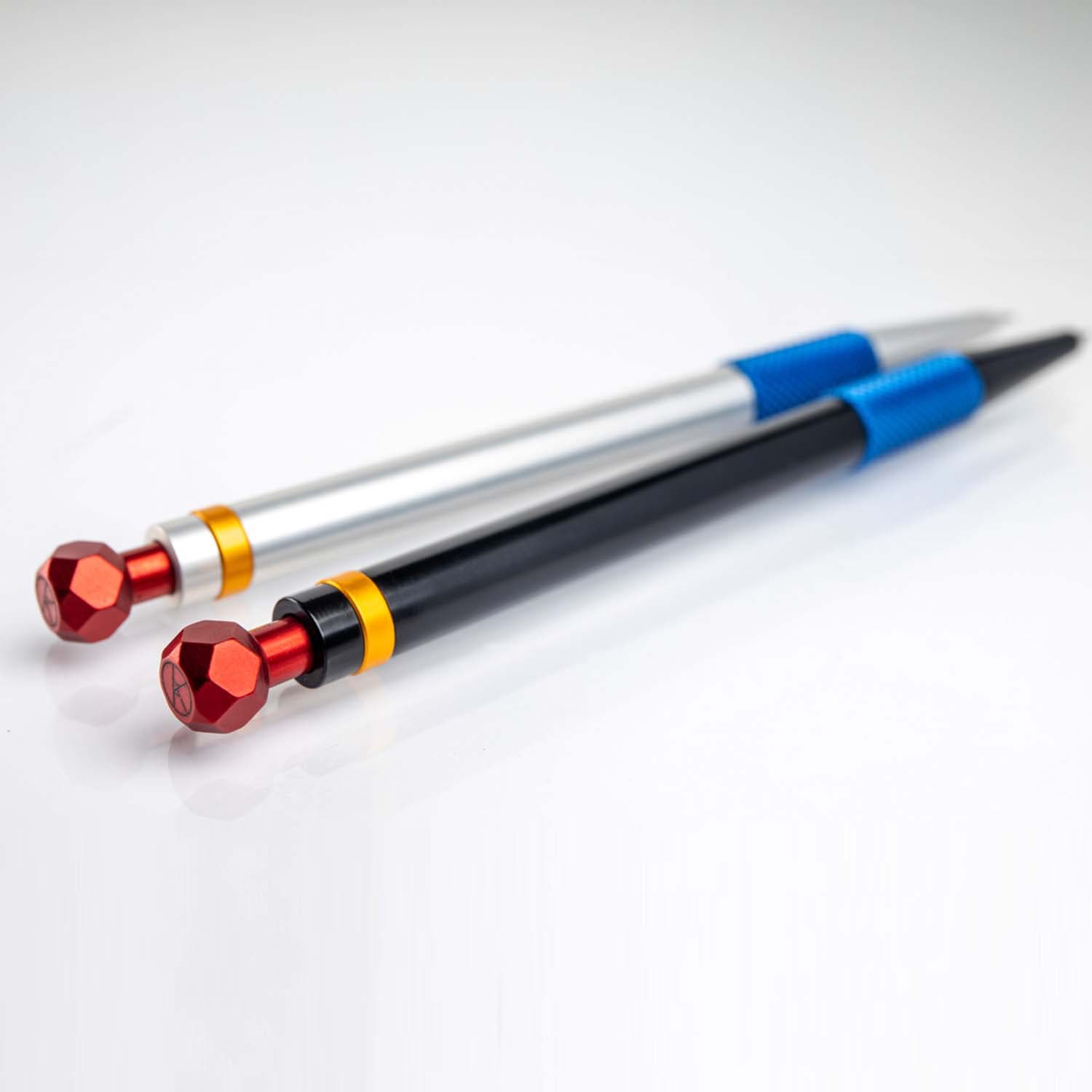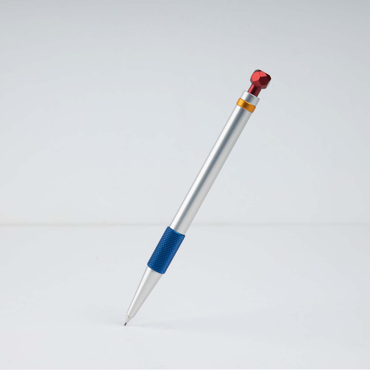 The KRAMA Mechanical Pencil BAUHAUS Edition, with push action mechanism is a compact and truly lightweight writing companion. It is comfortable when using it to make entries in the agenda, or creating a sketch, designing a product, an engineering or architectural drawing. The Solid Aluminum Mechanical Pencil comes with the option of 0.5 and/or 0.7mm Pencil Lead. It is limited to two BAUHAUS Color Palette editions, the light Grey and the Black, highlighting the knurled Blue grip part, the Yellow ring, and the Red faceted push-button top.