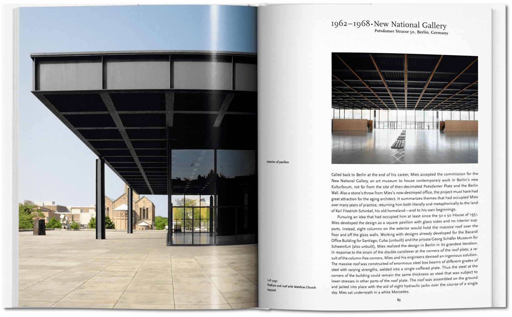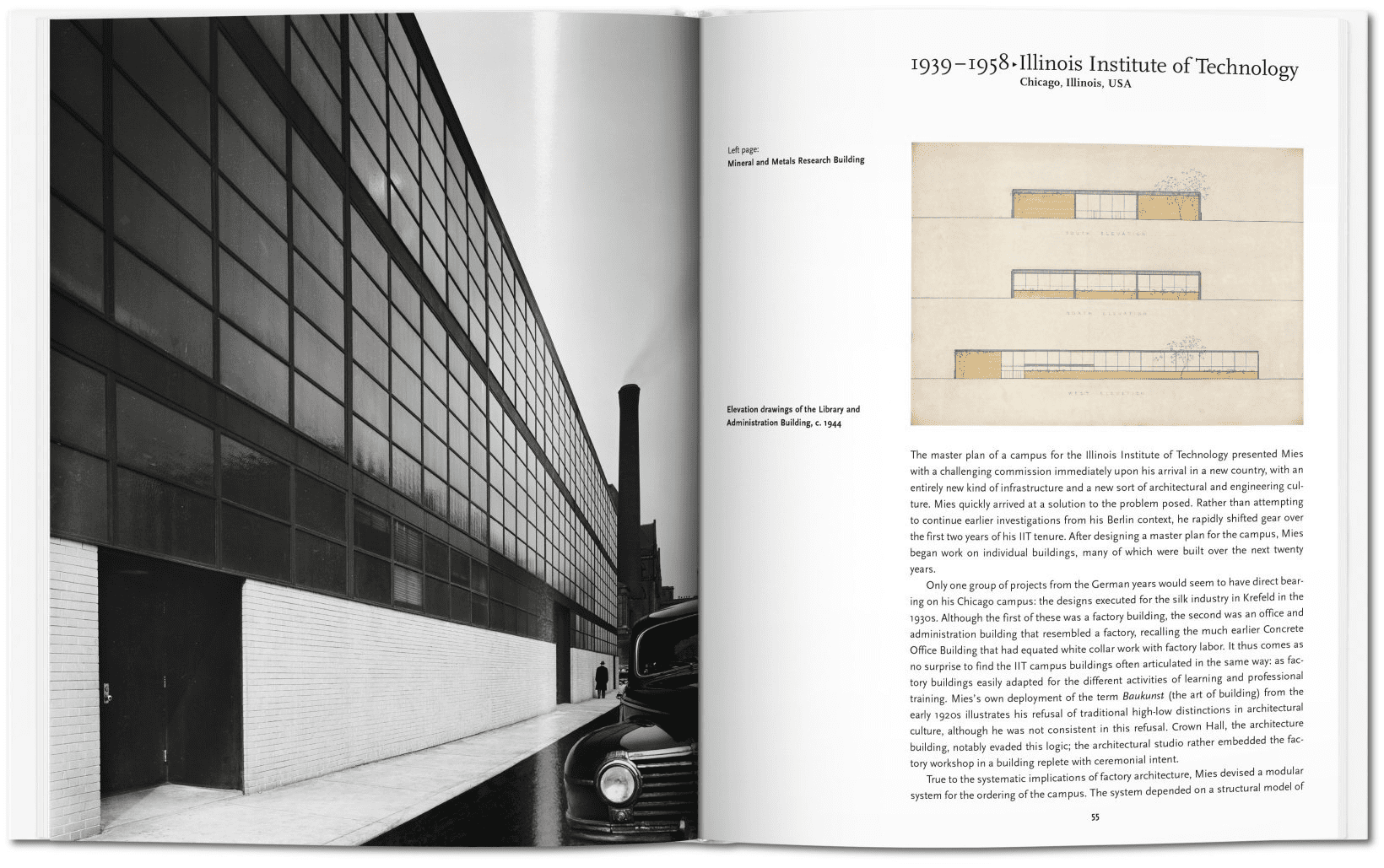 over 20 of Mies van der Rohe's projects from 1906 to 1967, highlighting his groundbreaking ideas and influence in America and