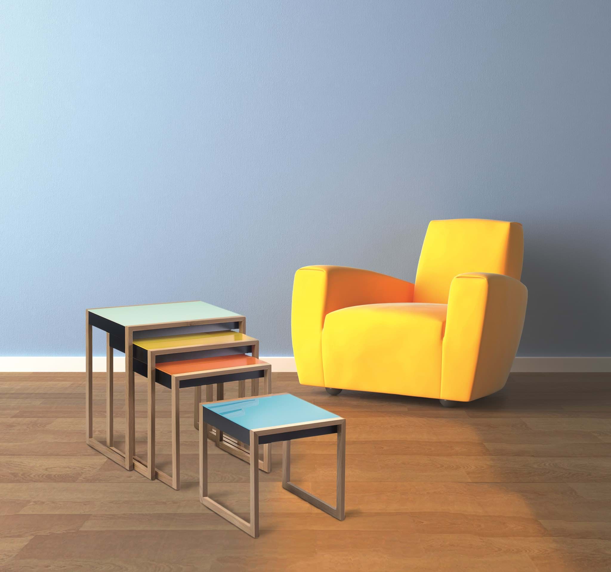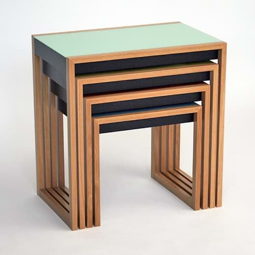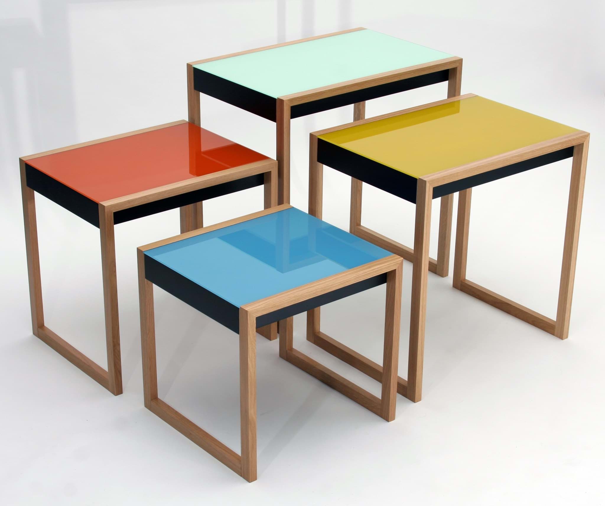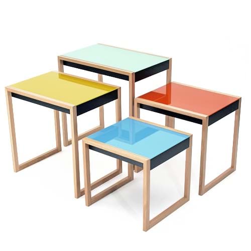 Josef Albers designed these timelessly beautiful typesetting tables for the so-called Moellenhof House in Berlin when he was engaged in furniture design during his time at the Bauhaus in Weimar and was artistic director of the furniture workshop for a short time. The special attraction of these functionalist set tables is their flexibility and straightforward simplicity. The Nesting Tables powerfully combine clear geometric shapes with colours from Albers' painterly oeuvre.