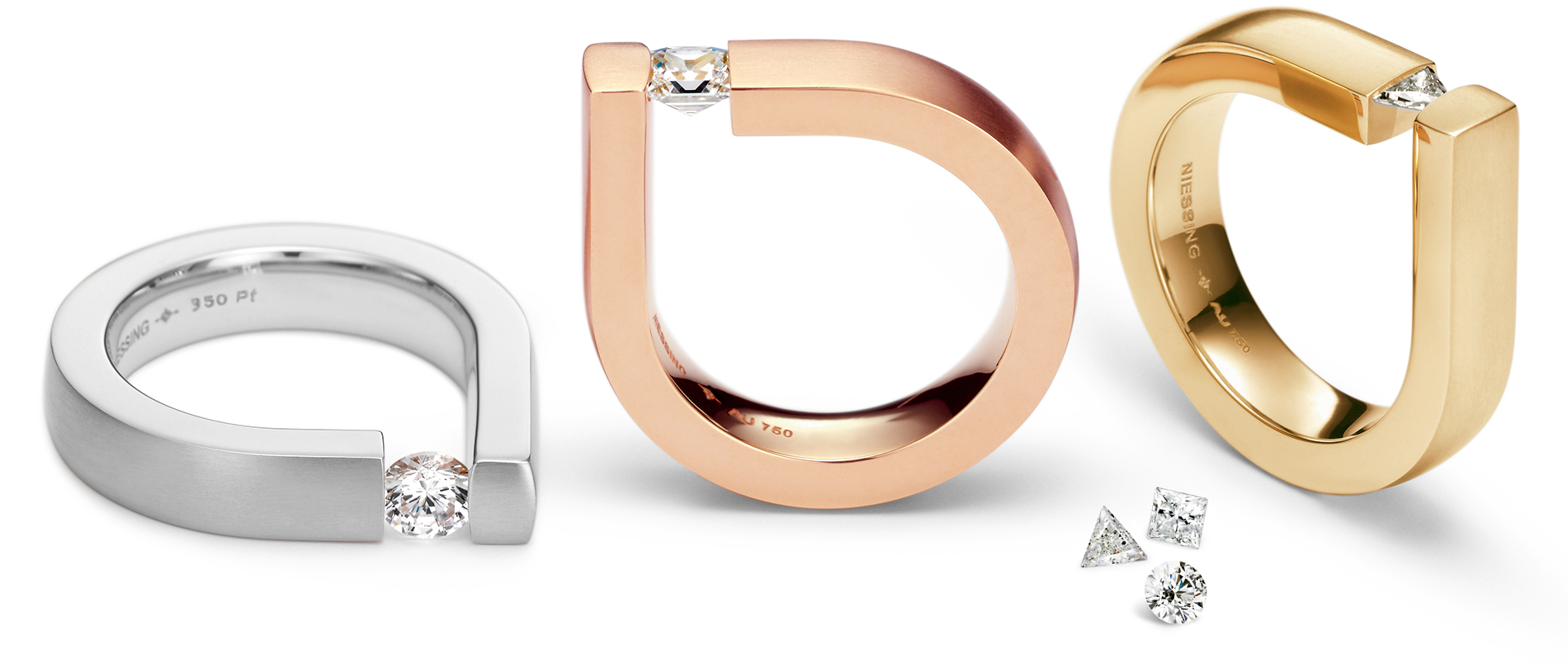 The Niessing Spannring® Round showcases three stunning diamond cuts, each with its own unique character. The Princess Cut at 0.3 carats has a clarity of VS2, offering modern elegance with its sharp lines. The Brilliant Cut, weighing 0.4 carats and also rated VS2, delivers exceptional sparkle and brilliance. Finally, the Trilliant Cut at 0.13 carats, with a clarity of SI, adds a distinctive touch with its bold triangular shape. Together, these diverse cuts and carat weights create a true masterpiece of design and craftsmanship.