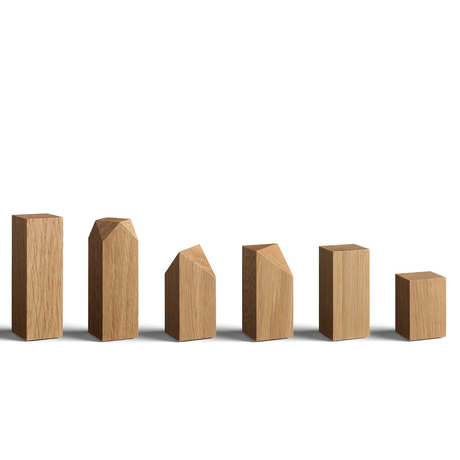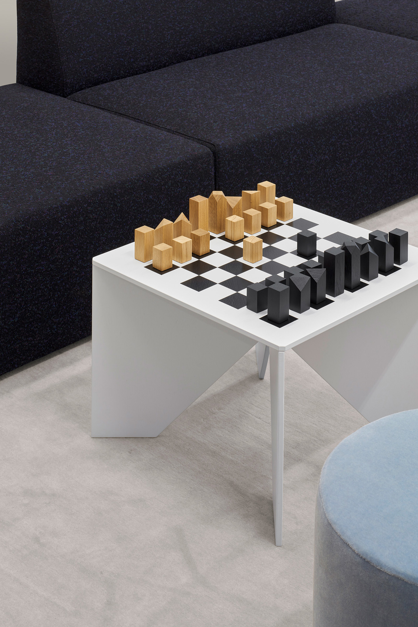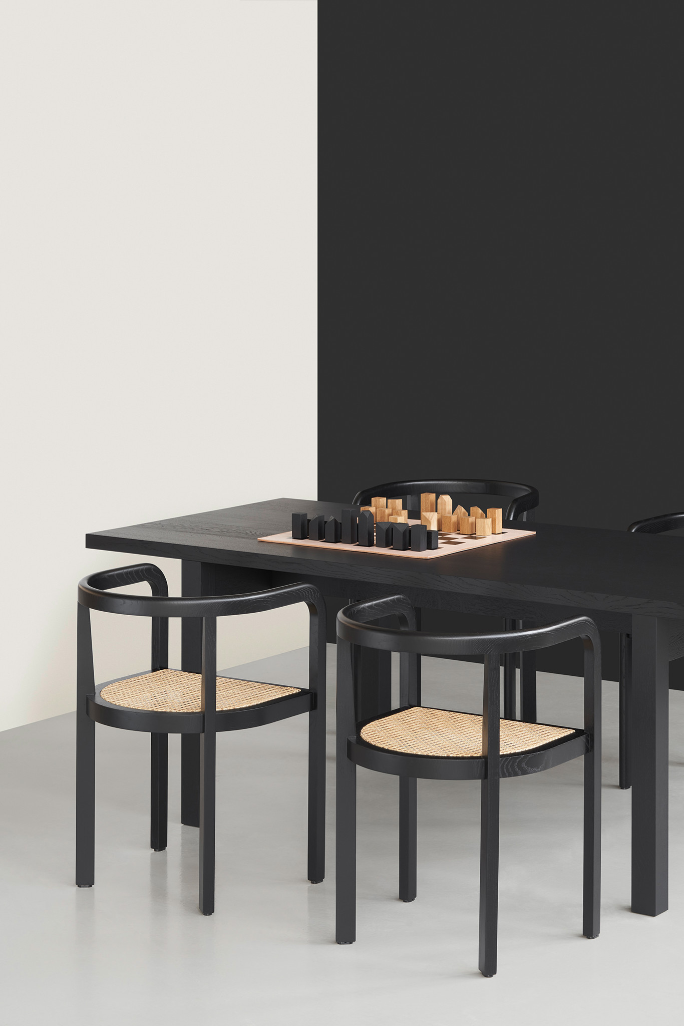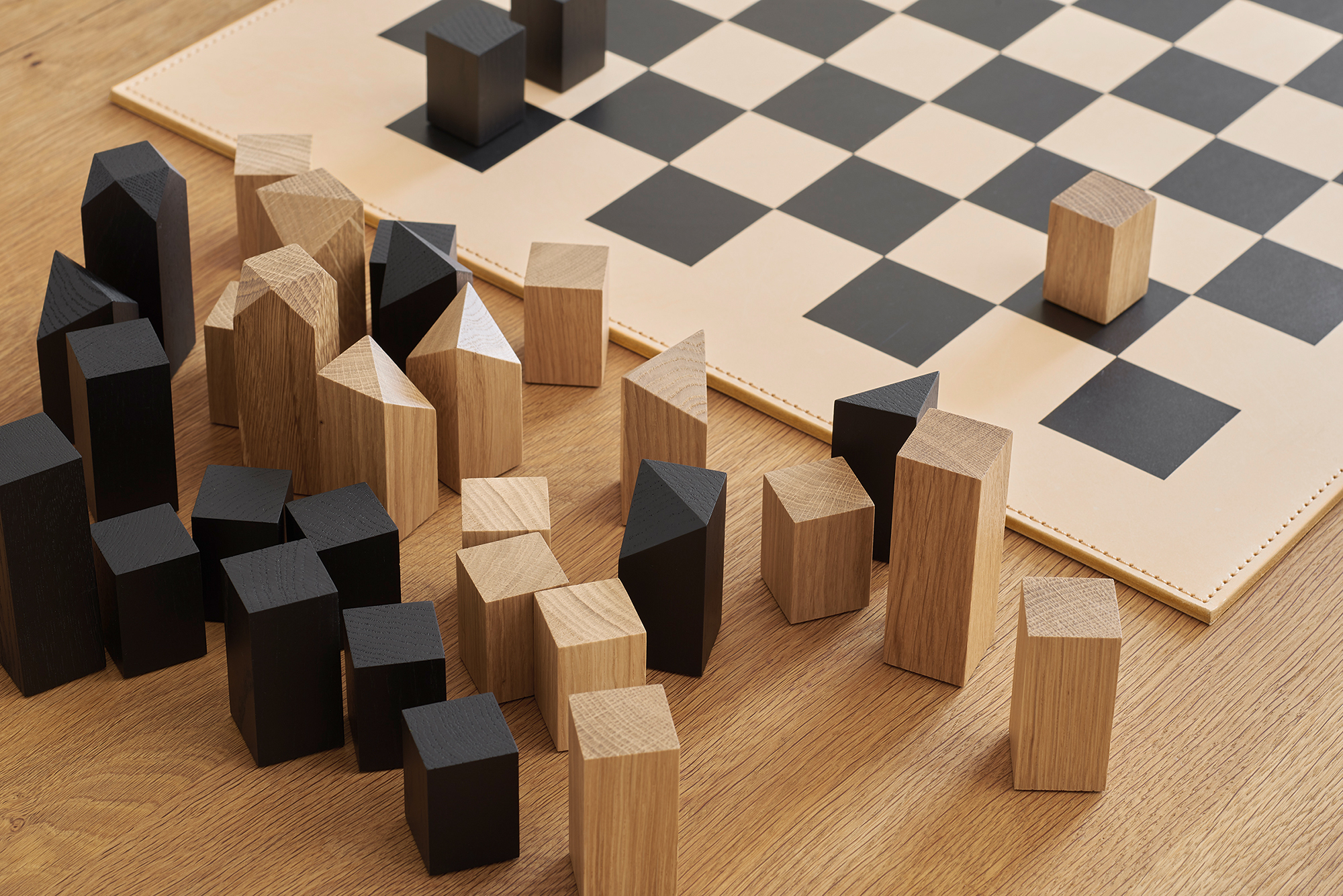 The NONA chess pieces by Annabelle Klute from 2021 are characterized by an extremely minimal design intervention to impart a unique character to each piece. Inspired by the possible moves they can make on the chessboard, these pieces are handcrafted in Germany, made from oak wood, clear and black lacquered, and equipped with felt guides. The name NONA pays tribute to the first woman who achieved the title of International Grandmaster in 1978. The pieces are designed to harmonize in size and proportion with the separately available NONA chessboard made of leather straps.