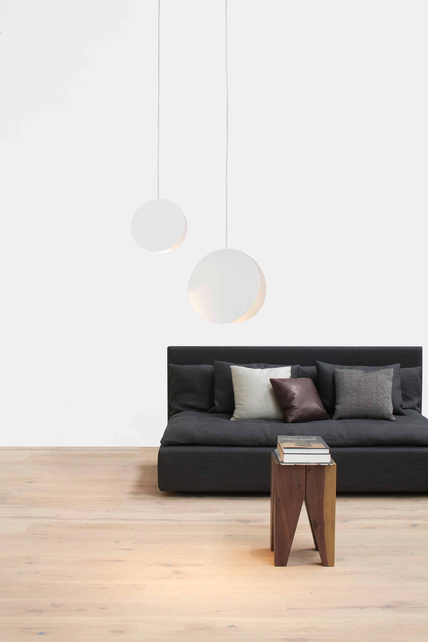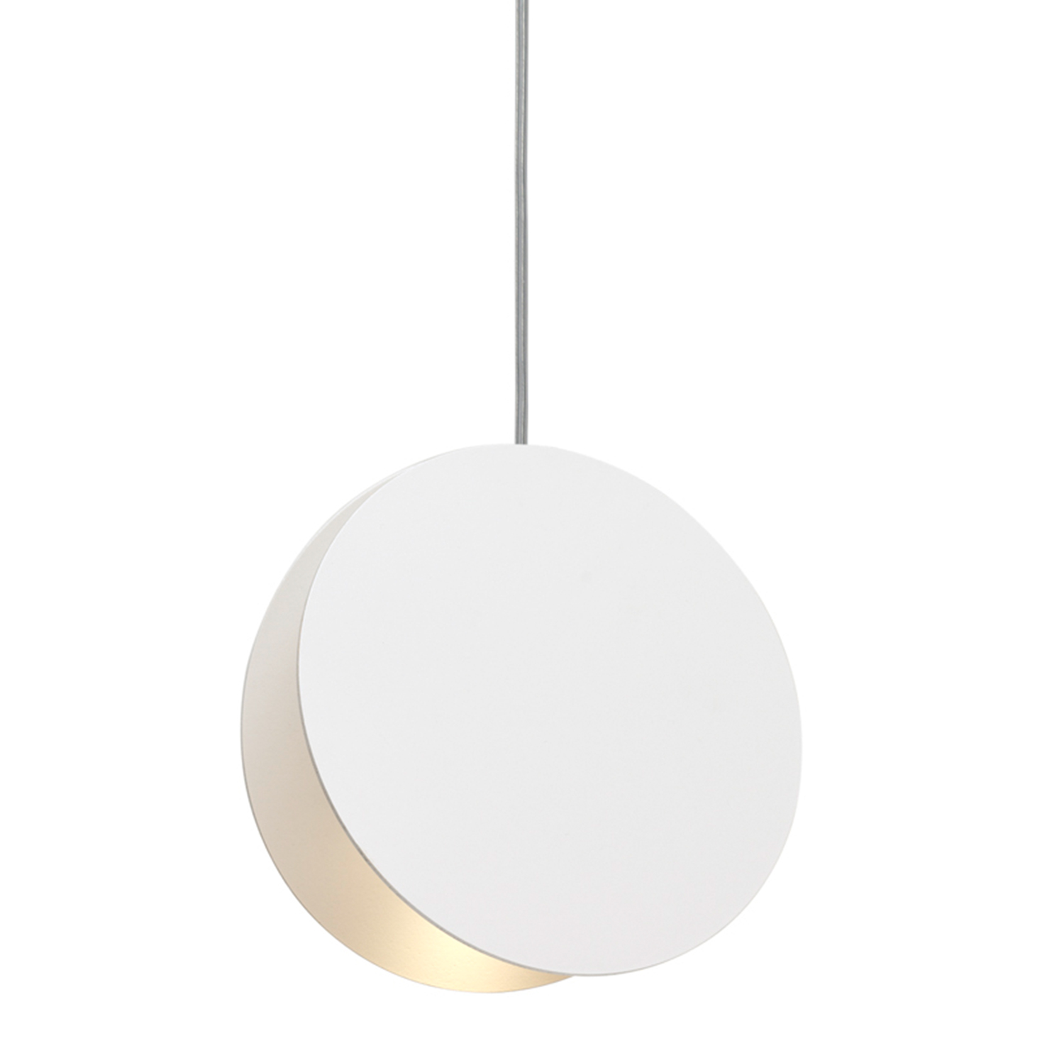 The NORTH pendant light, designed by Eva Marguerre and Marcel Besau for e15 in 2014, creates a fascinating interplay of light and form. Its distinguished simplicity gives NORTH a poetic appearance, while its circular body playfully reflects abstract geometry or moon phases depending on the viewer's perspective. The NORTH pendant luminaire is supplied with light source, but without canopy and ceiling fixture. For installations with several luminaires, it is necessary to purchase the matching canopy separately, which can accommodate up to seven luminaires.