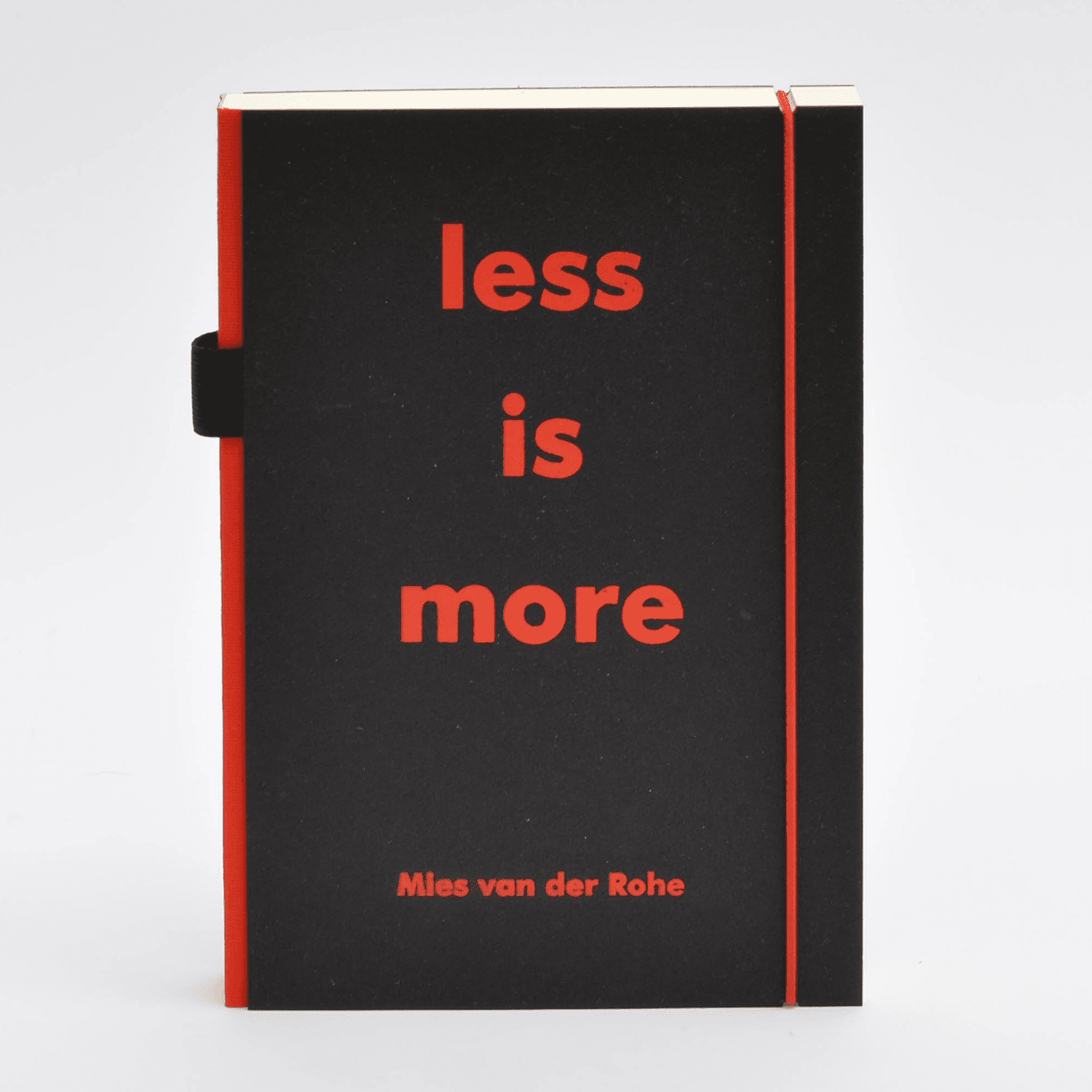 "form follows function" and "less is more" - design principles of modernity that also underlie our purist. A notebook, completely concentrated on the essentials, but of high quality in material and production: a thread-sewn book block in various lineages, book covers made of black cardboard, a coloured linen spine and a matching round gum for closing; and in this version with an embossing on the cover, a pen loop on the spine and a pocket in the back cover.