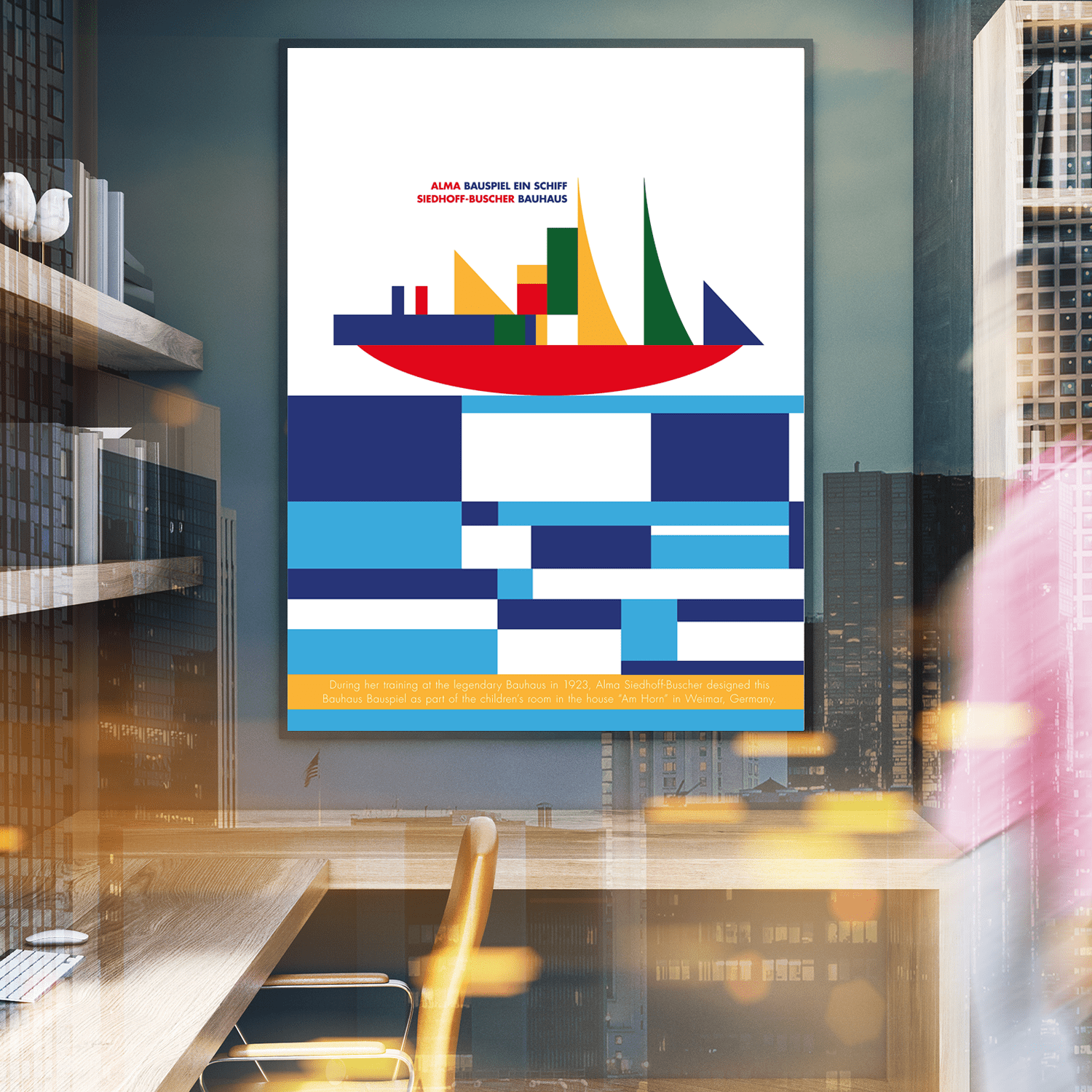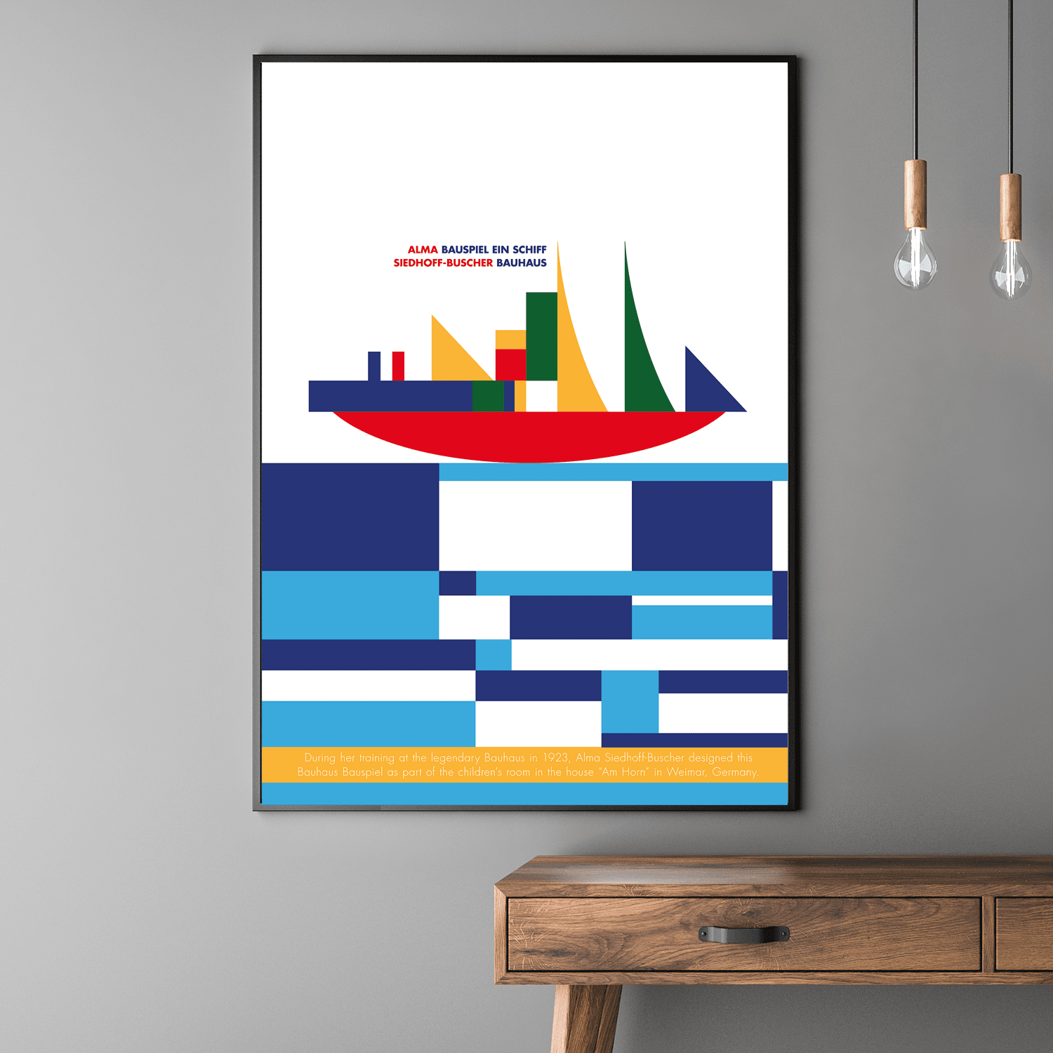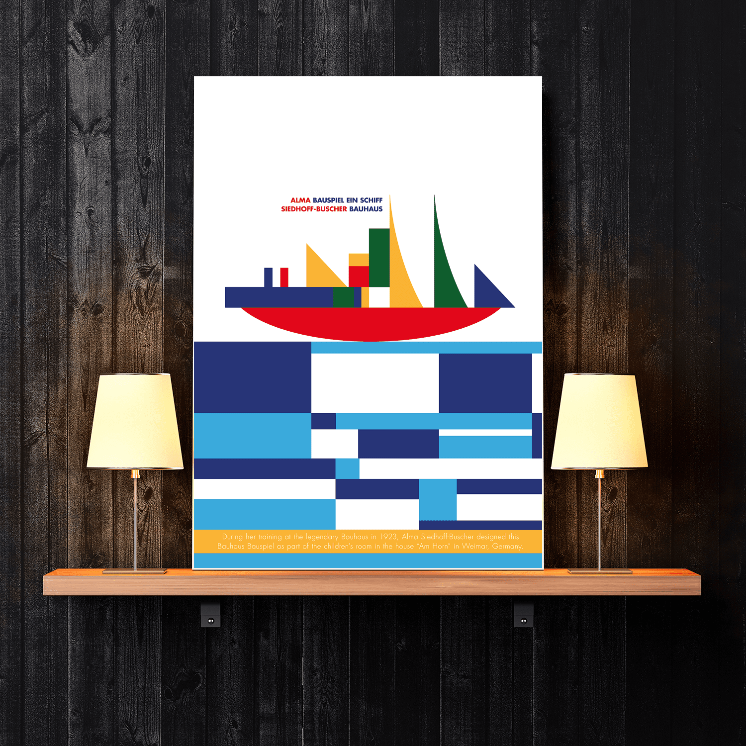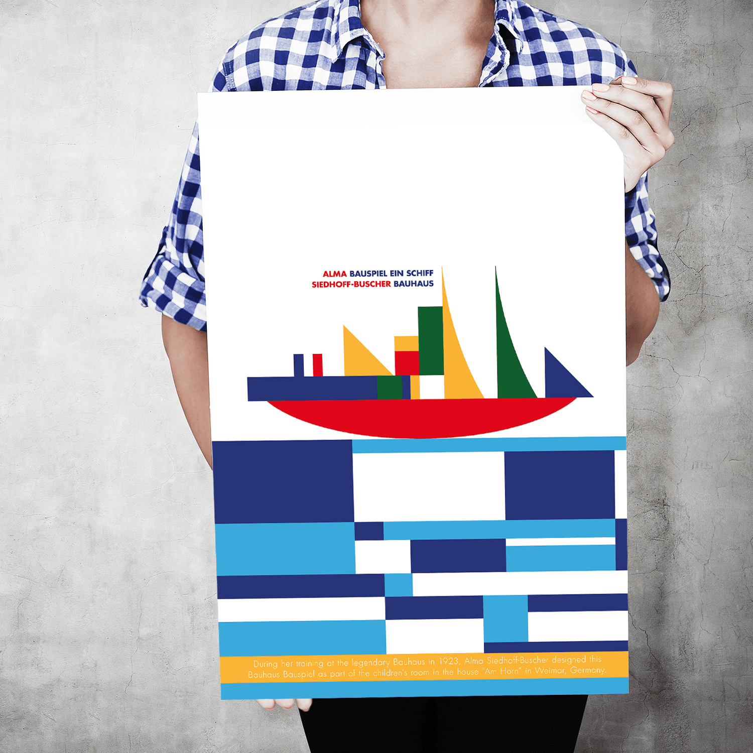 In 1923 the Bauhaus presented itself to the public for the first time in an exhibition. For this purpose the model house "Am Horn" was built in Weimar - Alma Buscher-Siedhoff was commissioned to design the furnishings for the children's room. Thus in 1923 her "Small" and "Big Shipbuilding Game" were created, which met with great approval in the context of the exhibition. As a result, the construction game was produced and distributed in various variations by the Bauhaus wood workshops.