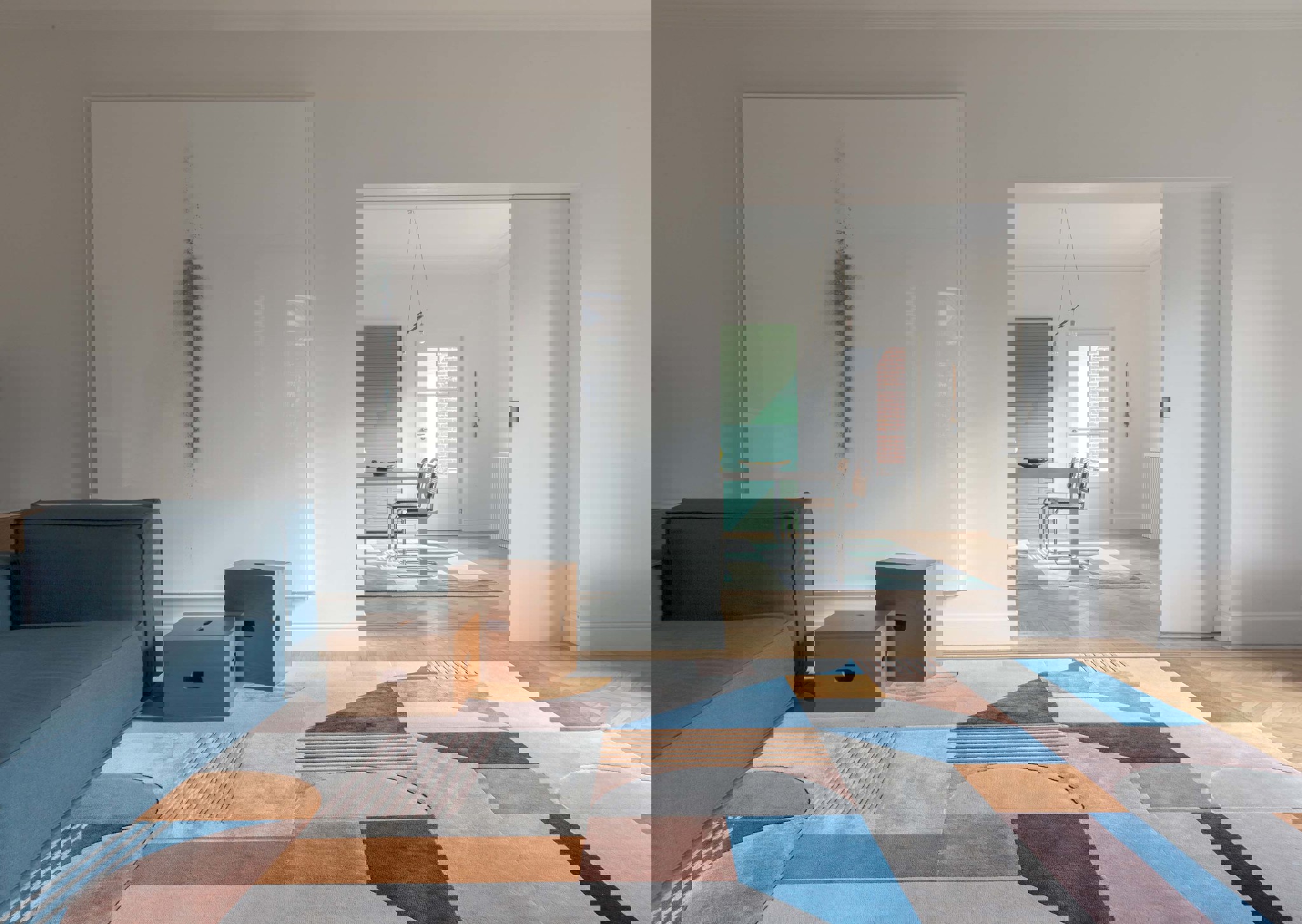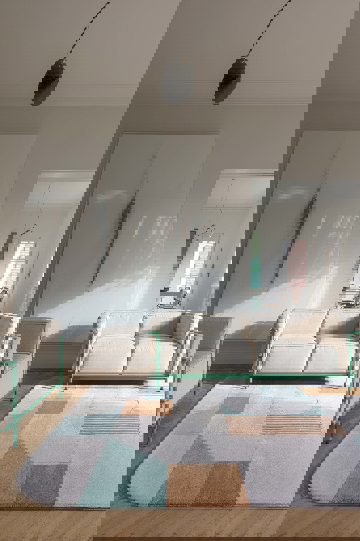 The geometric shapes and lines on the rug cross, interact and repeat with subtlety and accuracy.