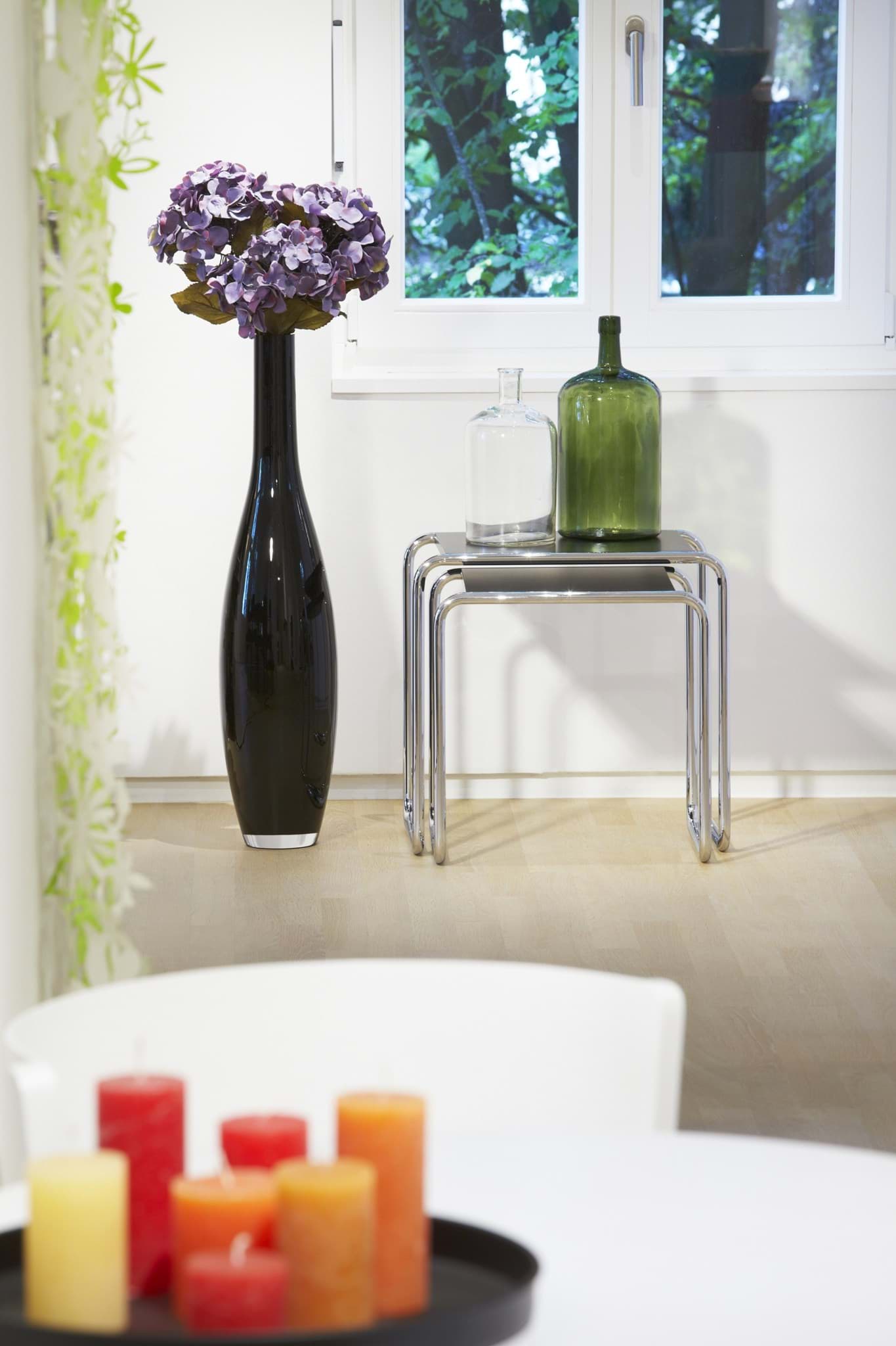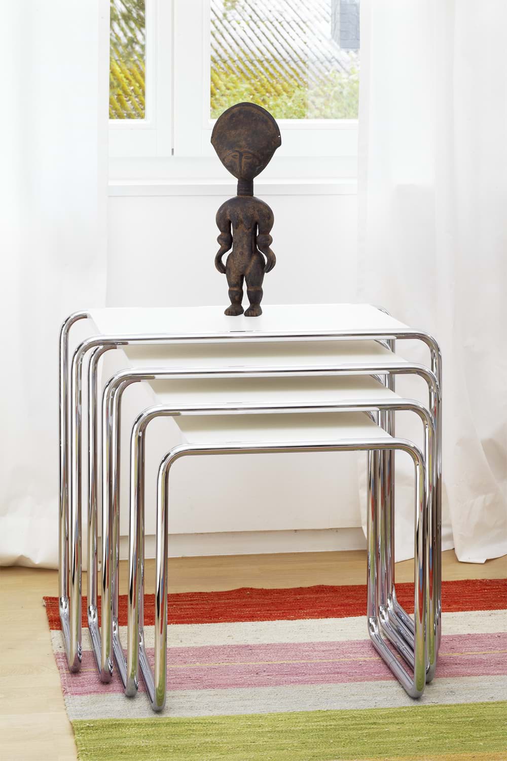 The bentwood technique perfected by Michael Thonet was a source of inspiration for Marcel Breuer’s experiments with bent tubular steel. The four-piece set tables B 9 developed out of this idea. The small tables can be used in diversified ways – as side tables in seating groups, as practical storage surfaces or as the perfect place for a vase with fresh flowers. After using the tables, they can be easily pushed beneath one another in a space-saving way. The special feature of this range is its functional simplicity – the set tables consist only of chrome-plated, bent tubular steel and rectangular panels.