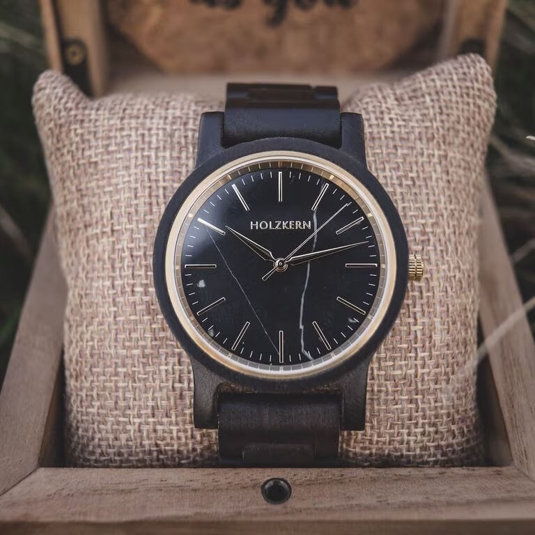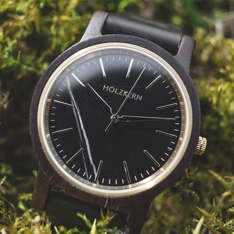 The Buschwerk combines black marble and walnut wood with a precise TMI quartz movement – naturally stylish and durable.