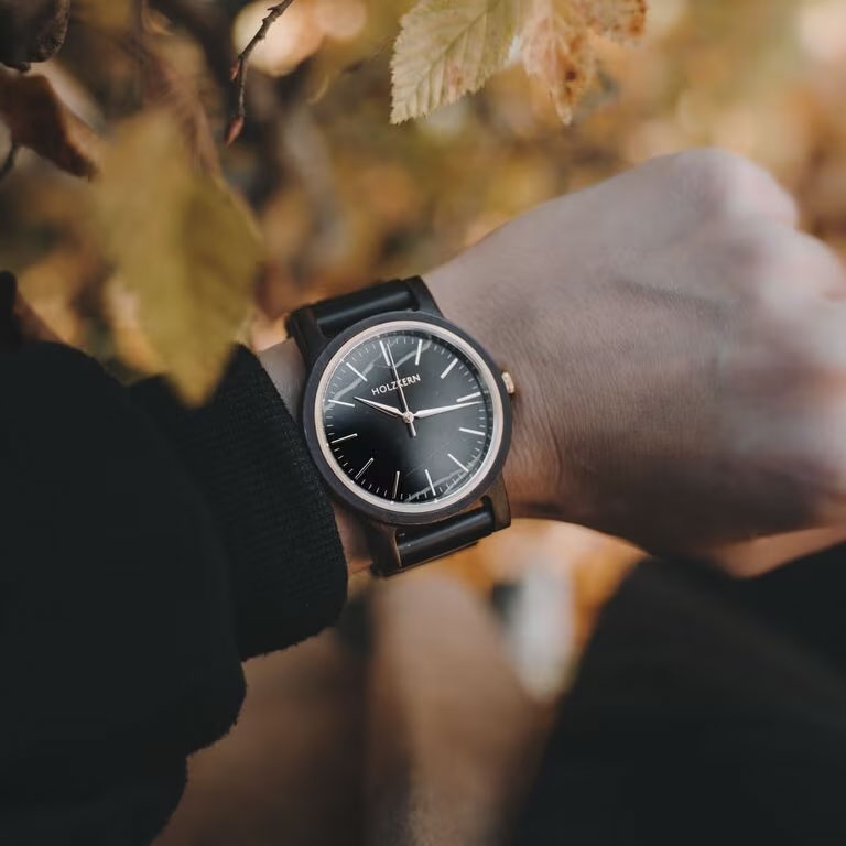 Herbstdämmerung a watch that captures autumn’s soul. Walnut & maple meet timeless design. Every piece tells a story of nature and style.