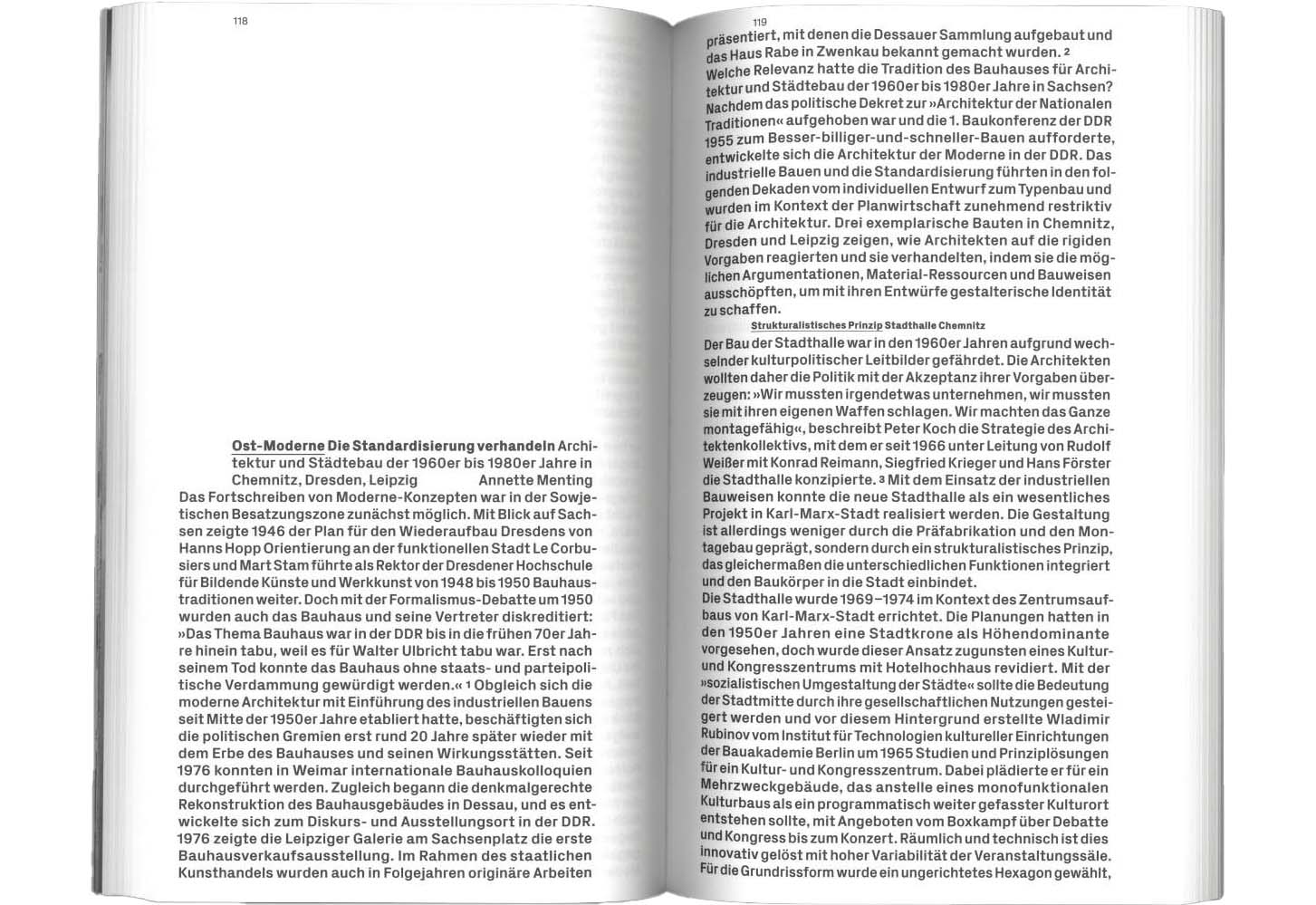 The publication for the Bauhaus centenary in 2019 focuses on experimental design spaces in Saxony following in the tradition of the Bauhaus and modernism. The book highlights three sites: the factory, the museum, and the city. The application of the arts in the serial manufacture of products such as lamps from Leipzig, glass from Weißwasser, or furniture from Hellerau helped define the Bauhaus in Saxony. What happens in the transition from craft object to massproduced item? In the factories of Saxony the Bauhaus came into contact with regional industry, which was interested in the high-quality design of its products. Today these products can also be found in the state’s museums. How do museums respond to the legacy of the Bauhaus and modernism? Experimental spaces can now also be found in the realm of urban design: Is the Bauhaus tradition still important today?