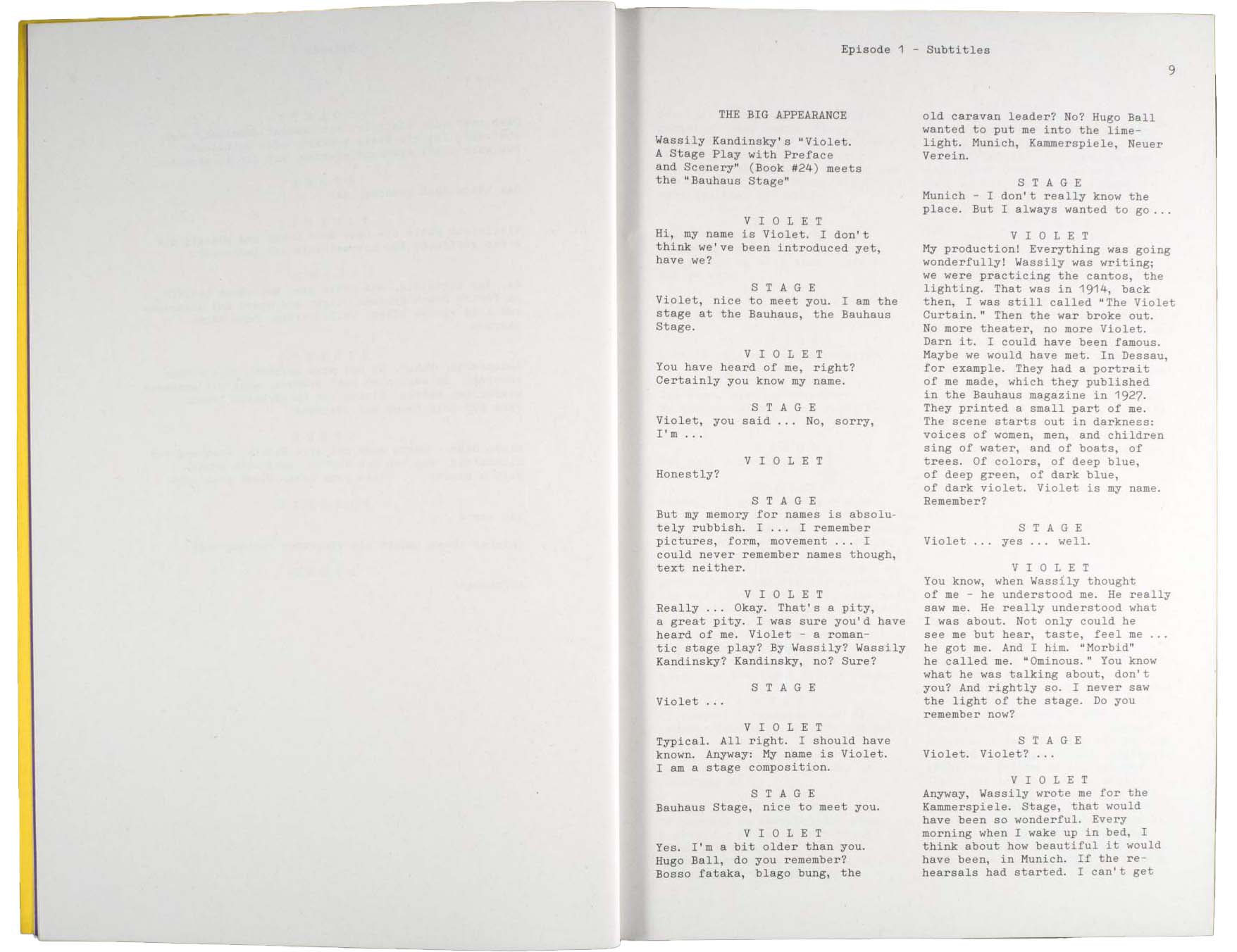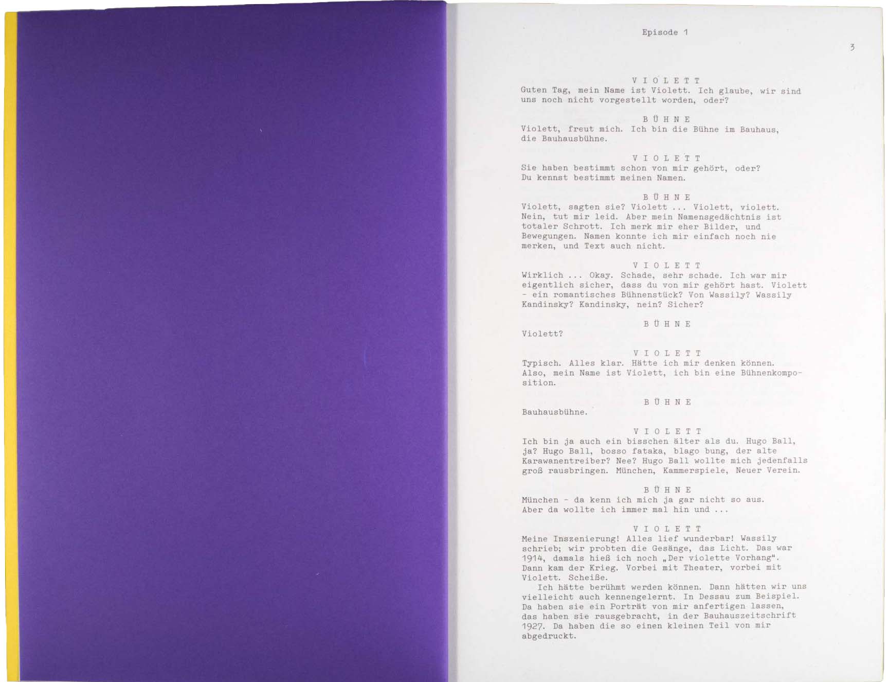 renowed authors — including one female author — in more than fifty publications. In the end, only fourteen of them were published. Silent Partners is made up of three sequences dedicated to the never-published books. In each of the scenes, one unwritten Bauhaus book has a conversation with an object or an idea from within the book.