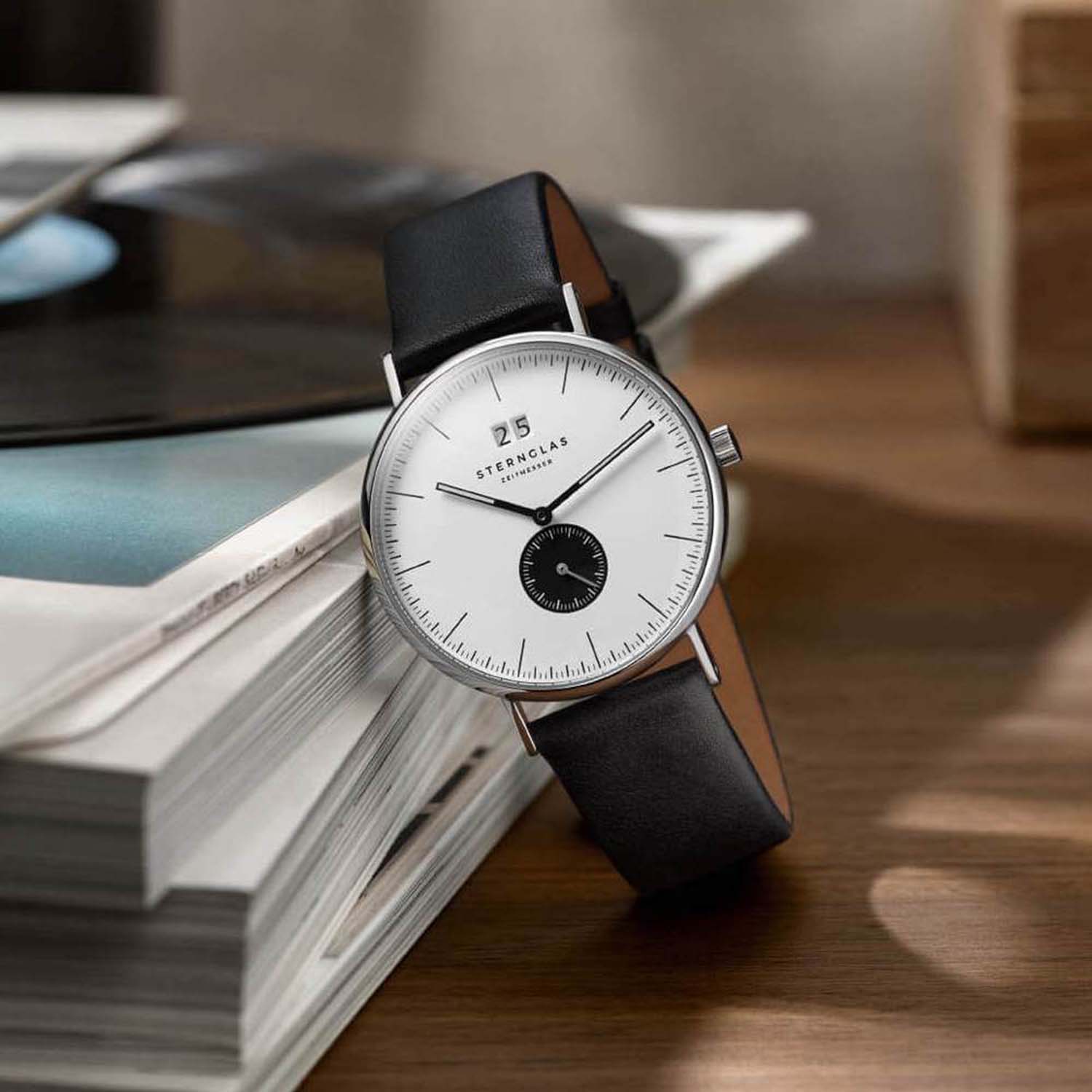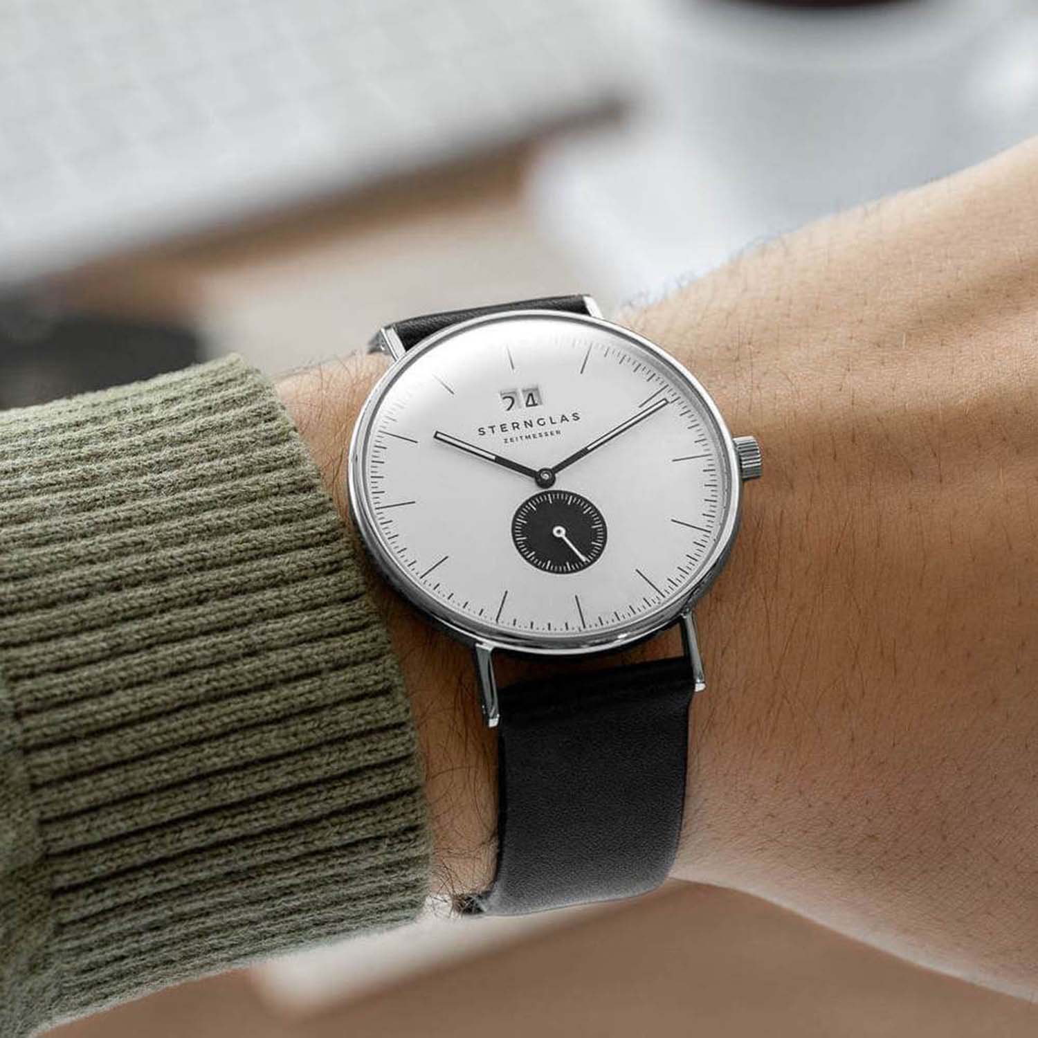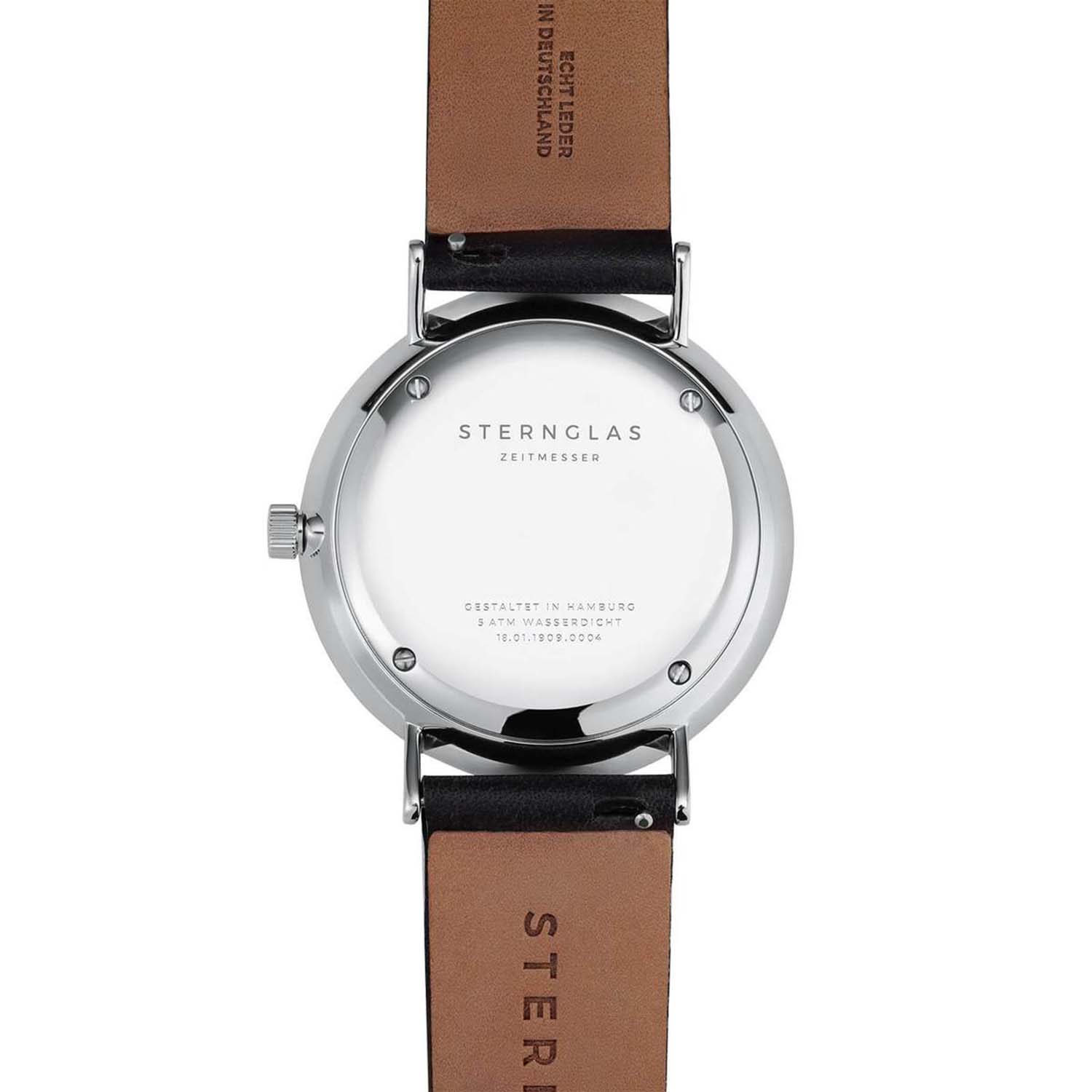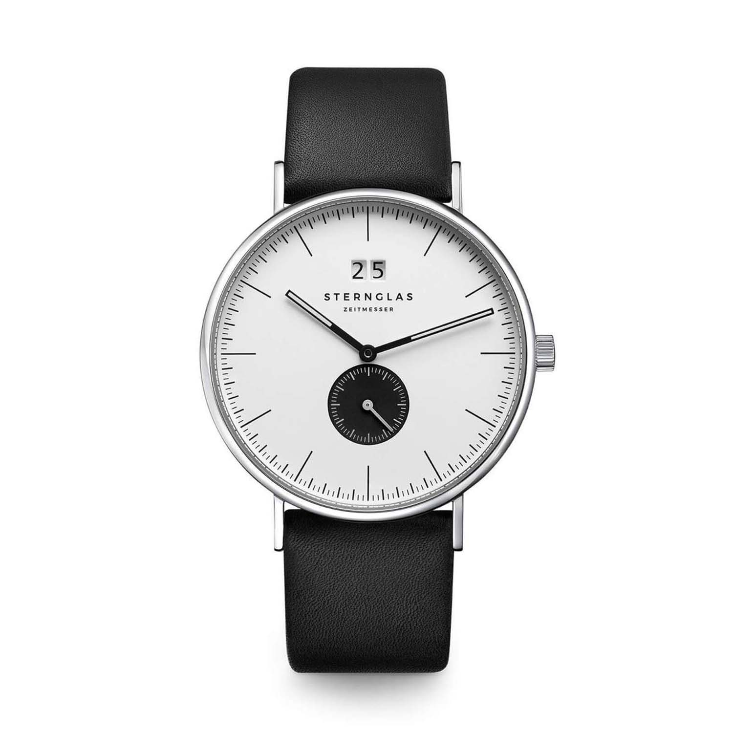 Function and aesthetics in a balanced form - the STERNGLAS Ivo. Our Ivo has been created in response to many requests from the STERNGLAS community for functional complications. The big dateensures easy and quick readability. The “small second”in high-contrast black discreetly draws the eye to itself. The fine design of the indices and the unobtrusive 40 mm case made of polished 316L stainless steel make the watch appear clear and uncluttered.