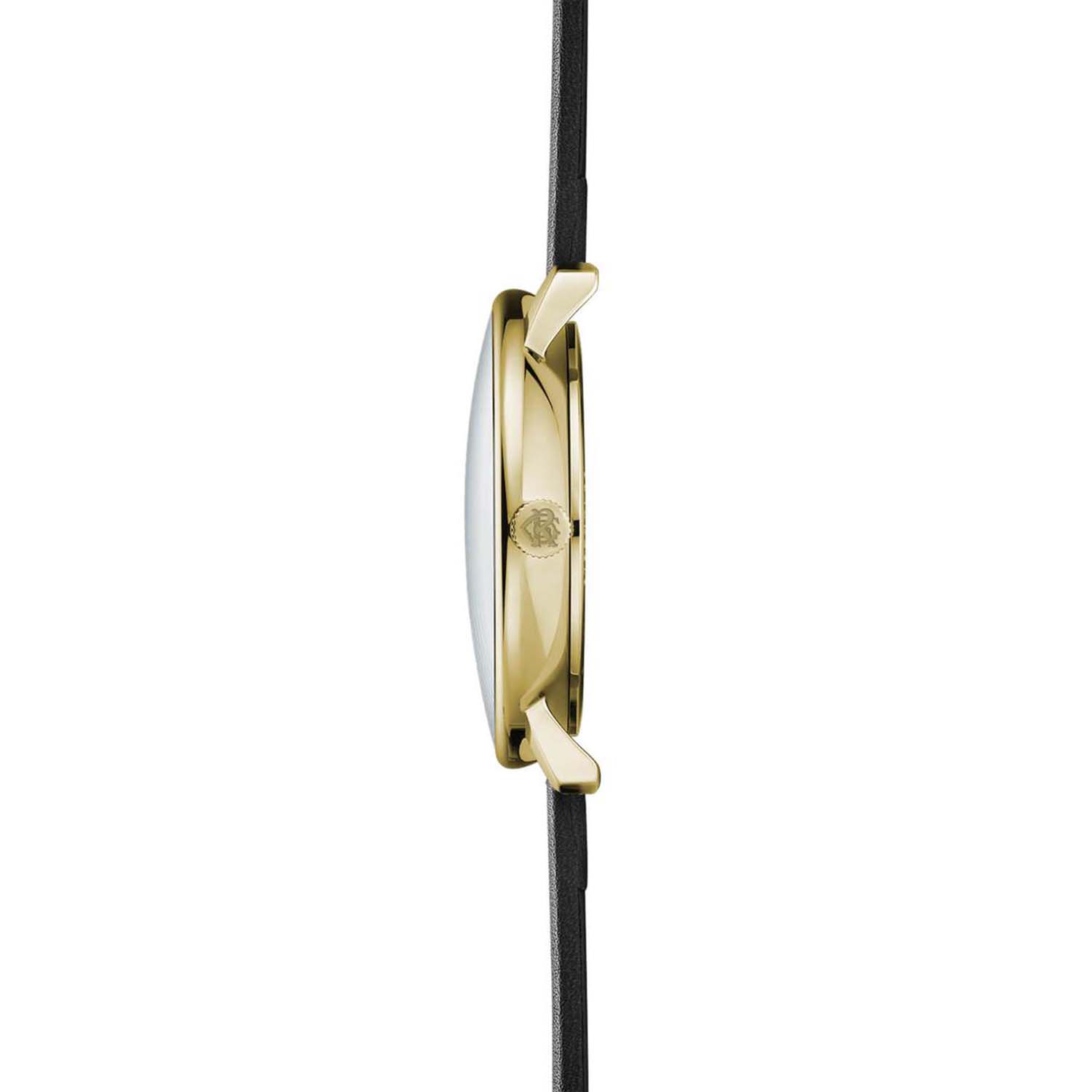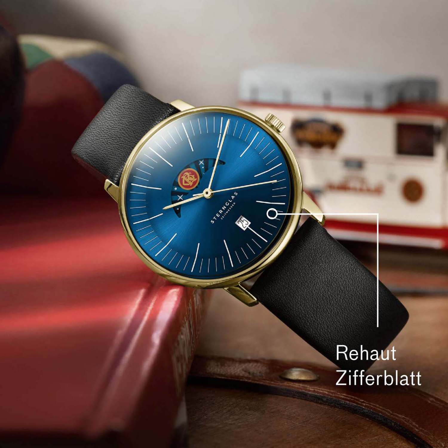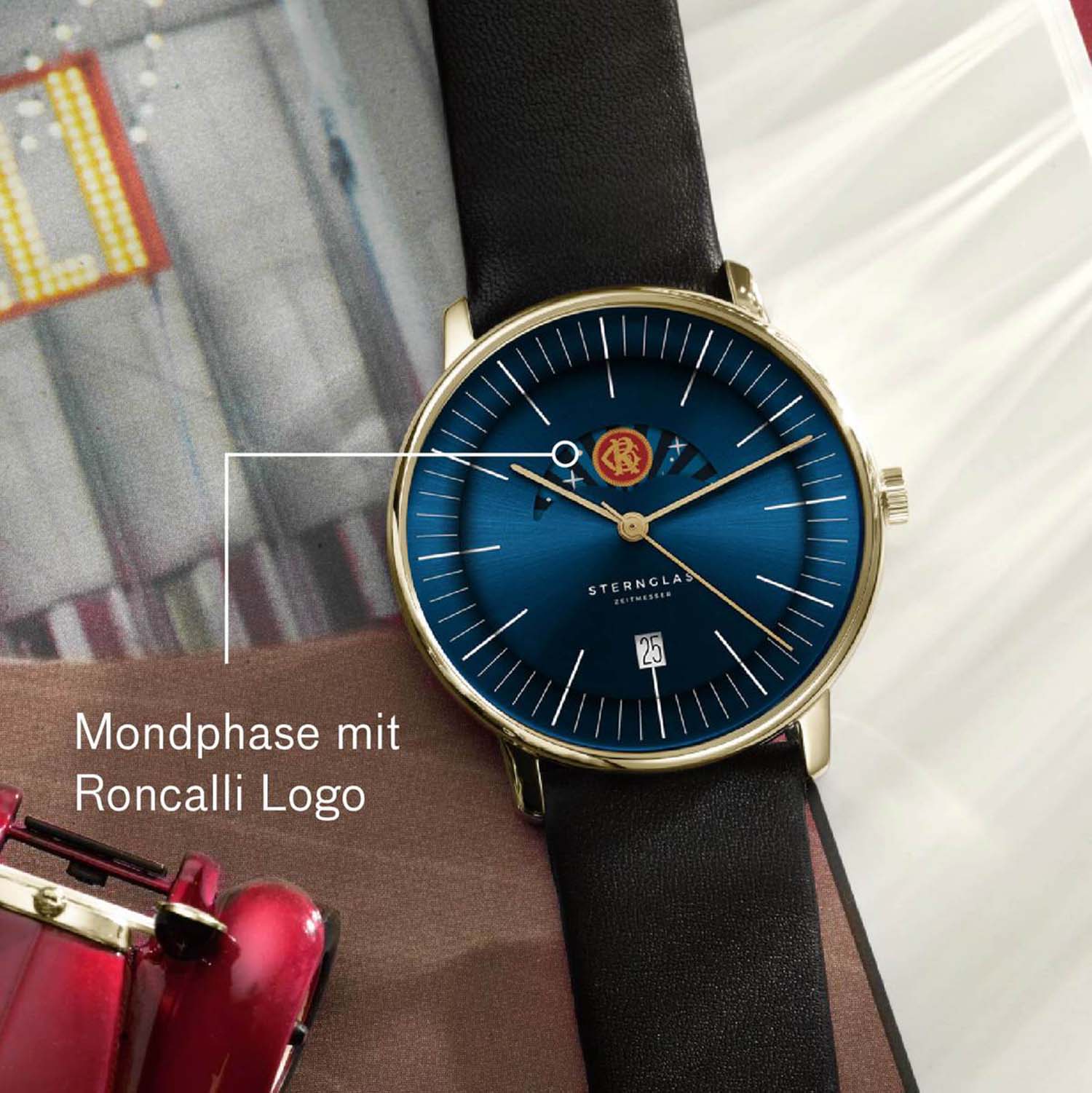 The timepiece impresses with its sunburst dial in Roncalli blue and its champagne-gold case. Depicted as the moon phase, the Roncalli logo moves across the dial depending on the moon's position. At 6 o'clock, there is a date display with the STERNGLAS logo above it. The delicate elevated outer ring (rehaut) reminisces the ranks of a circus stage. The 38 mm model is driven by the analogue quartz movement Ronda 708. Also, the caseback and the crown are embellished by a Roncalli edition engraving. The classic black calfskin strap, the thin needle hands and the delicate minute scale create the minimalist STERNGLAS design.