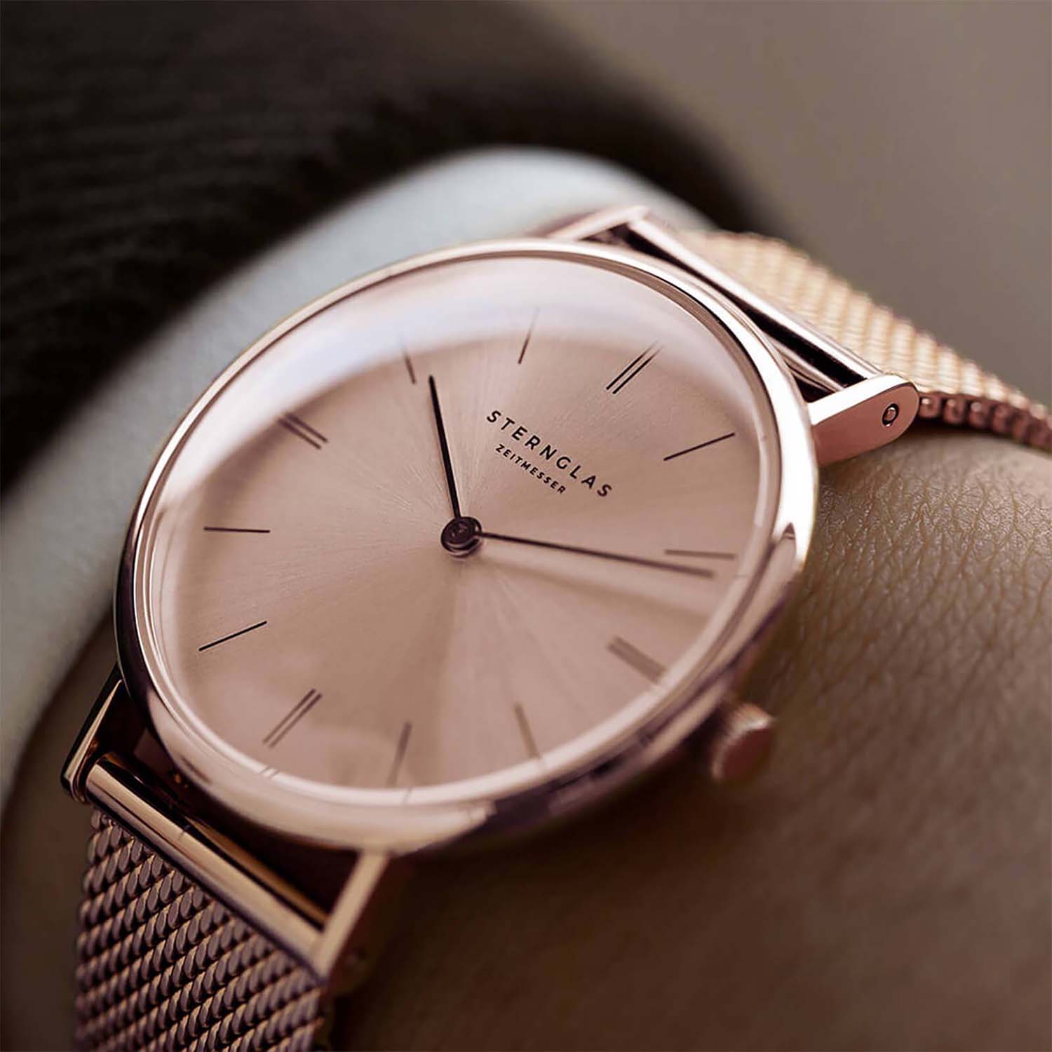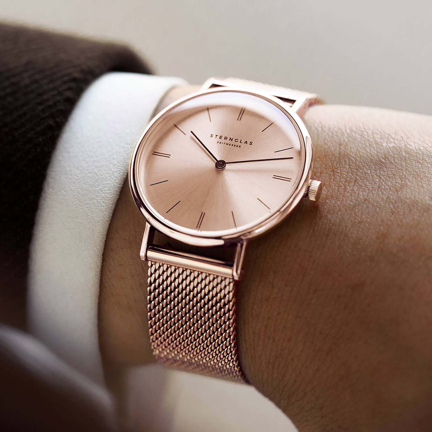 Sinja - "the little sun". The name of our new model for the female wrist originates from the Nordic and perfectly describes our timepiece with a case diameter of 32 mm and sunburst dial. The combination of different surface structures and materials creates a unique character.