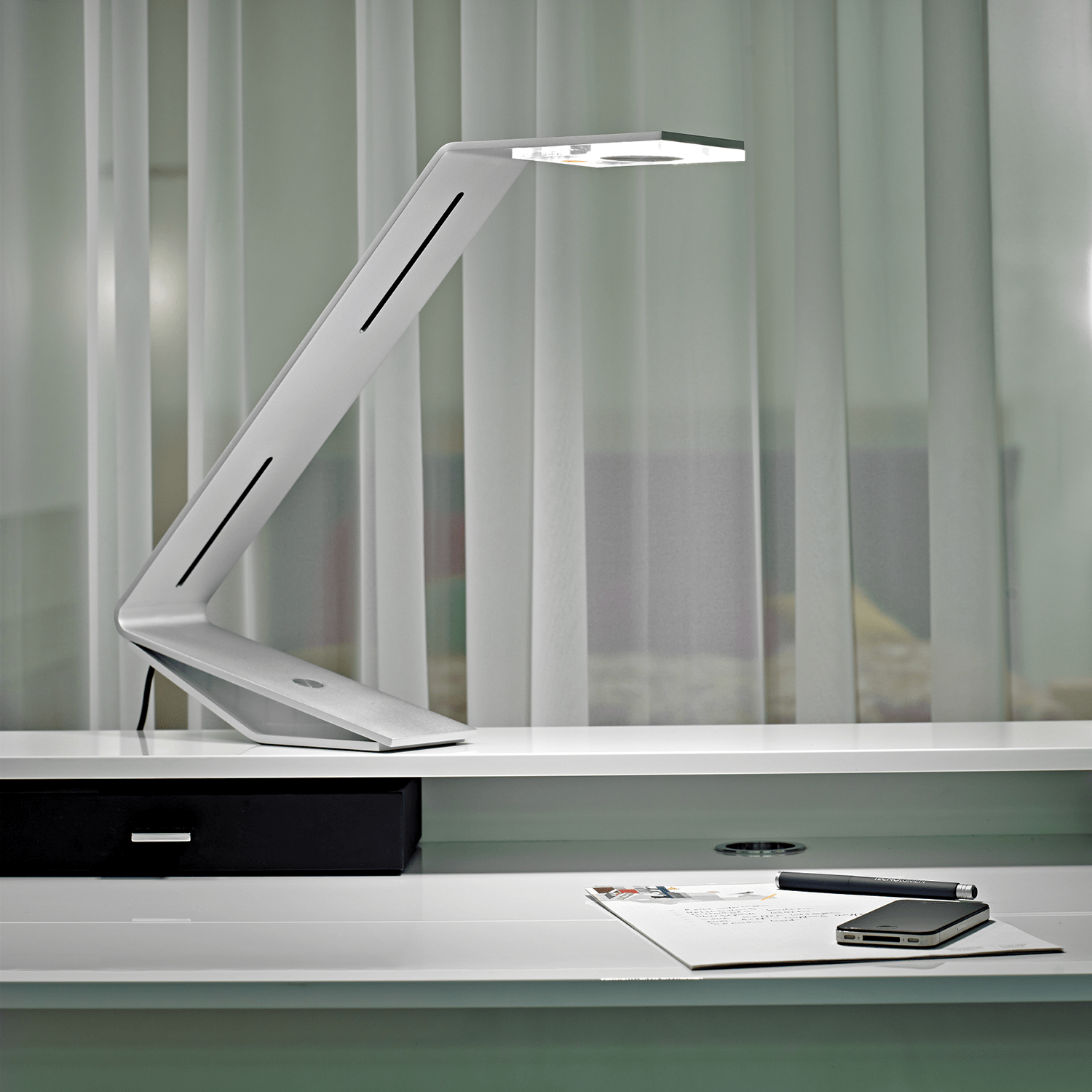 The otherwise immobile lamp can be moved into two different positions using a rocker foot. With its simple charm and the beautiful and energy-saving LED light, the Flad table lamp is a highlight for every desk.