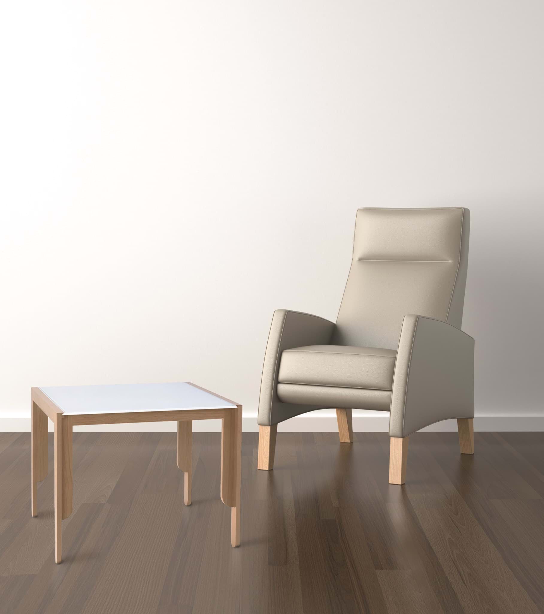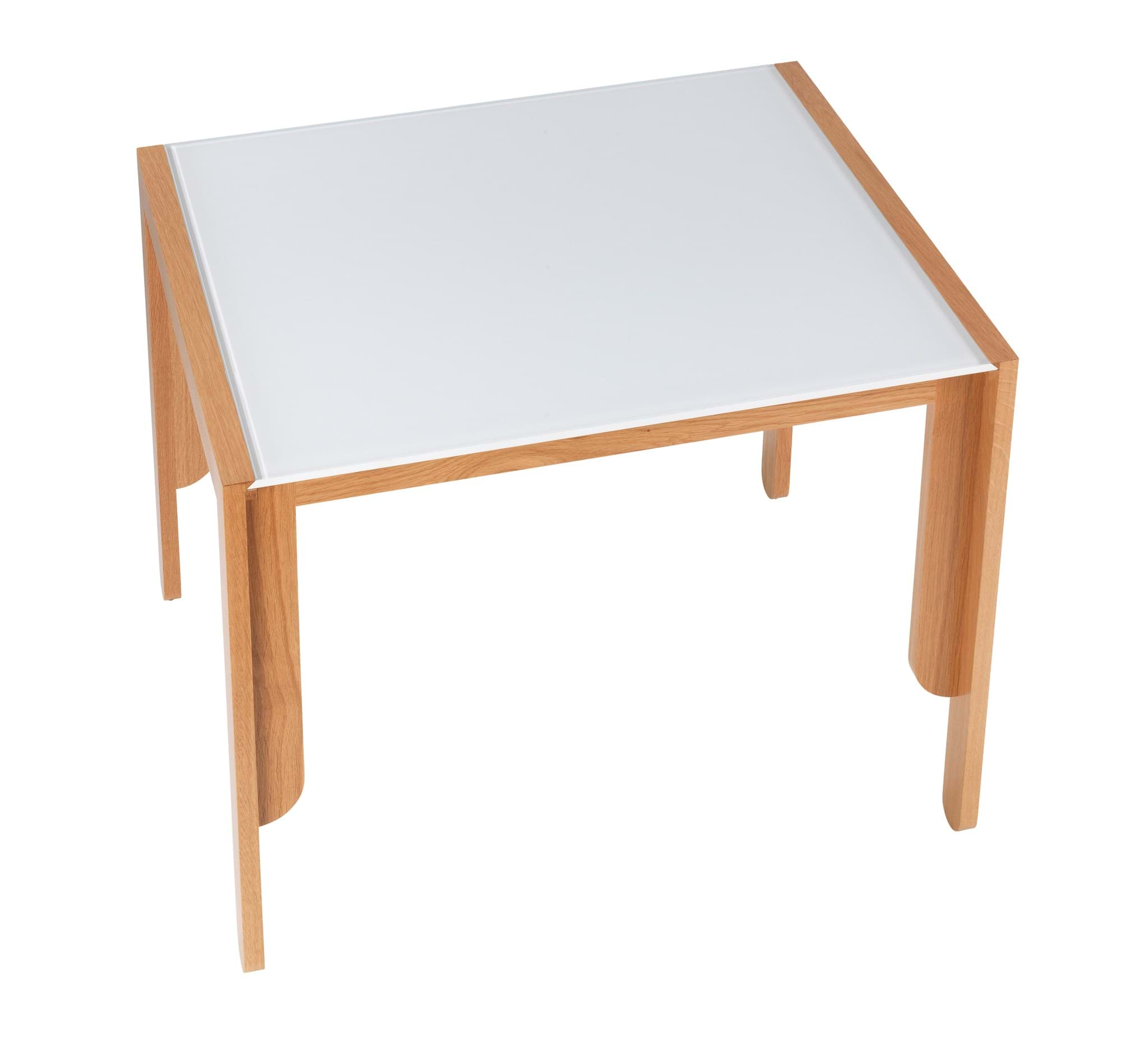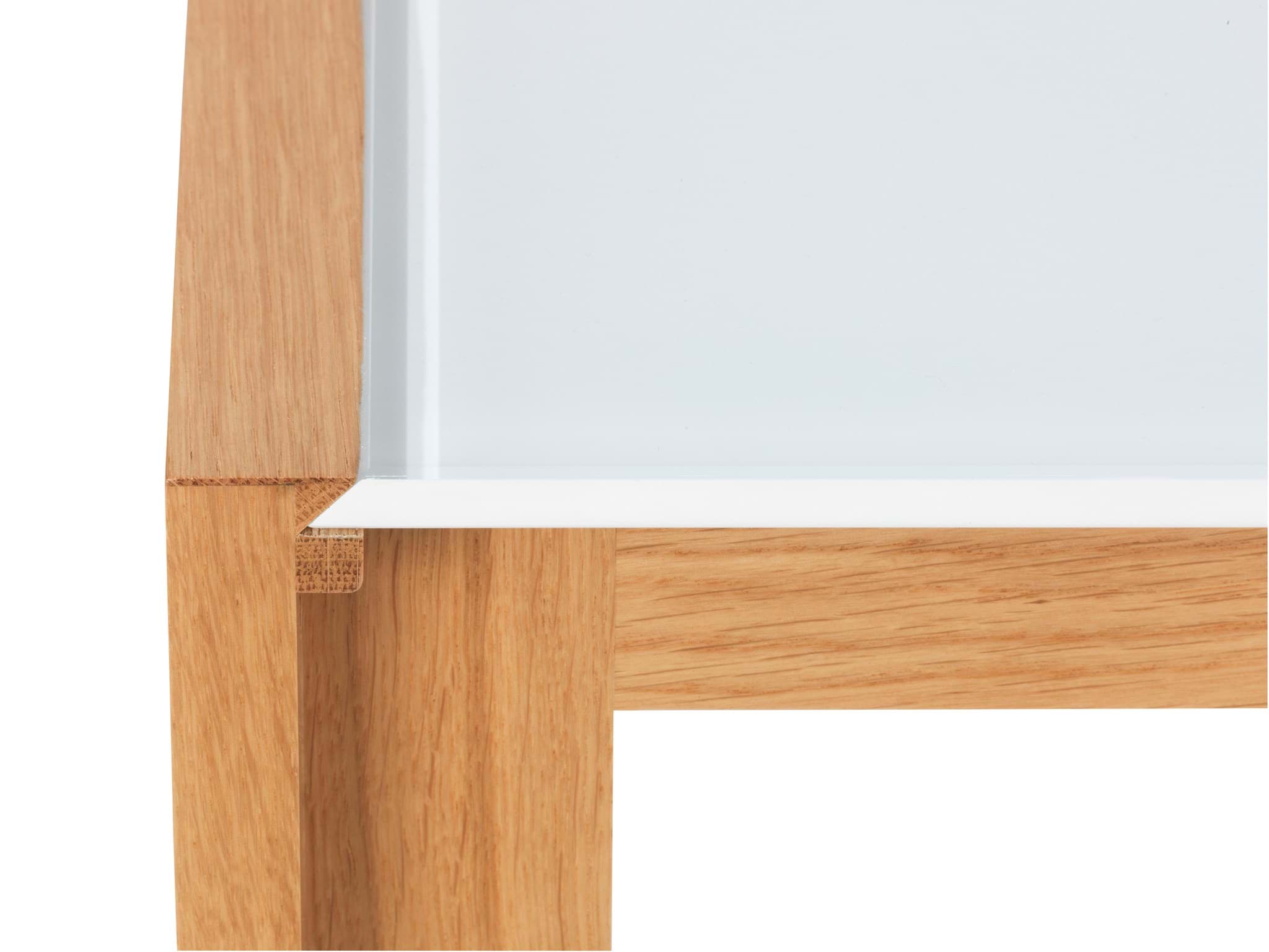 The base of the Tea Table is made of solid oak and the white lacquered single-pane safety glass of the table top is imported from Italy especially for production, as only this material meets the quality requirements.
