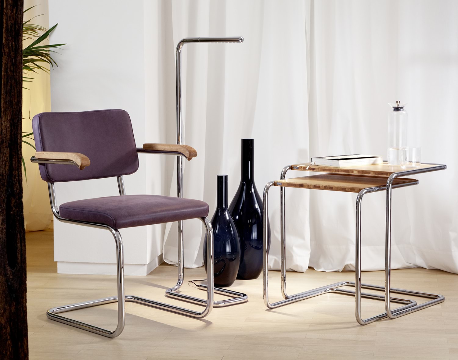 Elegant, flexible and suitable for a variety of uses. In its dimensions, the table set B 97 is reminiscent of Marcel Breuer’s nesting table B 9. Its altered construction, however, offers a practical advantage: due to the opening on one side, the tables can be pulled over the edge of a sofa, armchair or bed. Otherwise, they can be conveniently pushed into one another. The Thonet design from 1933 is among the classics of tubular steel furniture.