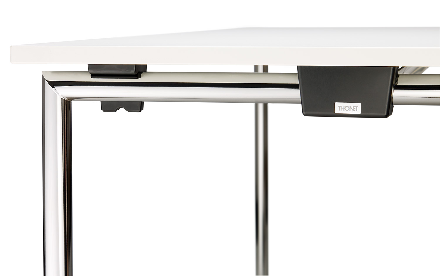 A light, folding table that does not show its practical function at first glance. It has a clear, discreet aesthetic and high quality. It is mainly used in training and seminar areas, but the table is also suitable for flexible solutions in conference and meeting rooms. Thanks to small castors in one pair of legs, it can be placed quickly and easily by just one person. Adjustable glides in the second pair of legs serve to optimally align the table. Its special features are the great legroom, because the table legs are positioned at the ends of the tops, the easy assembly and disassembly thanks to a simple, stable folding mechanism, and the space-saving storage, because the tables can be perfectly stacked lying down or vertically in a confined space when folded. A matching trolley with push handle is available for transport.